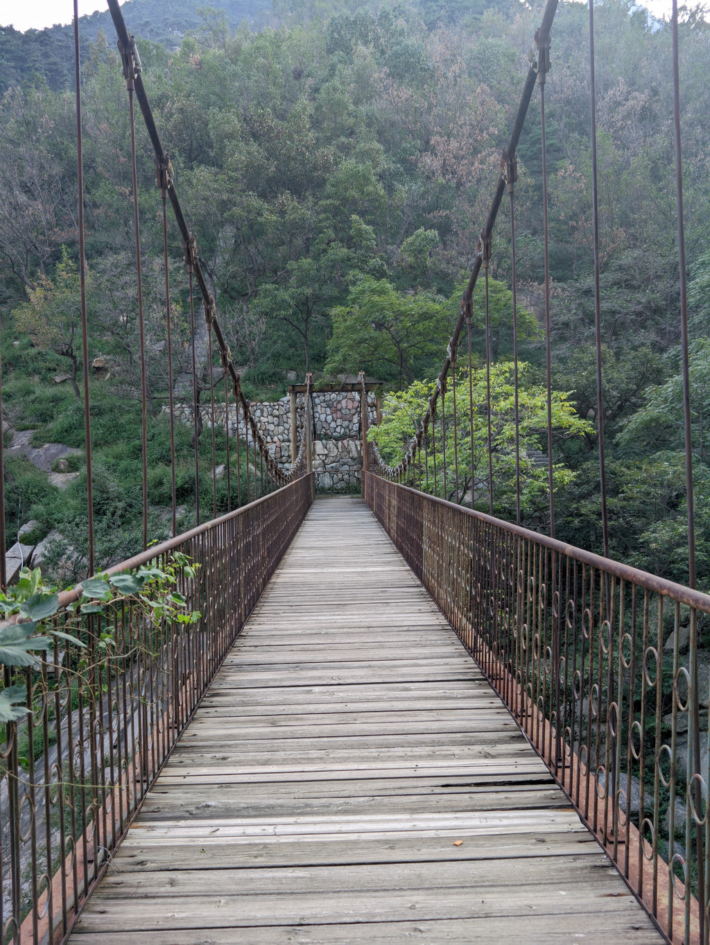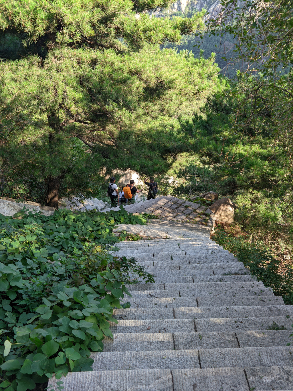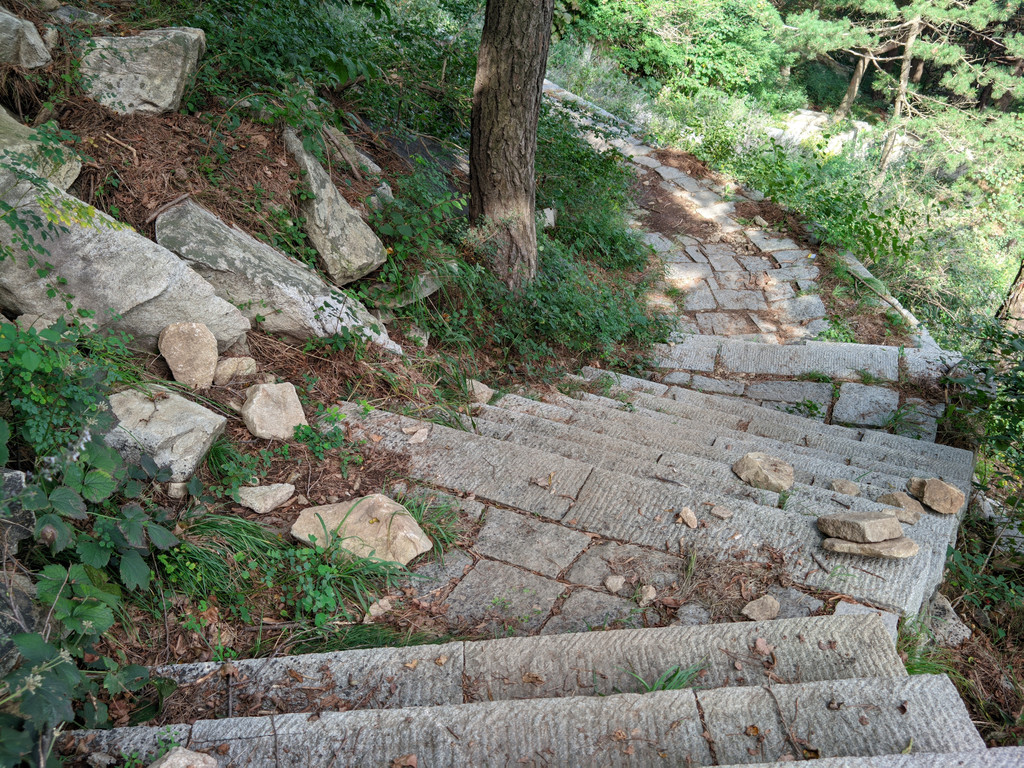 到十八盘,我的体力开始恢复不过来,脚处于发软状态,走走停停,有时甚至直接坐到阶梯上,真是时时刻刻感觉身体被掏空。背囊的矿泉水越来越重,有时觉得为了省几块钱,多背一瓶矿泉水其实并不划算。幸好泰山的植被非常茂盛,各种草木在十八盘两边的山崖、石缝骄傲地生长,将自然环境点缀得生机勃勃。走在山路上,呼吸着夹带着草木香气的新鲜空气,还是有提神效果的。
