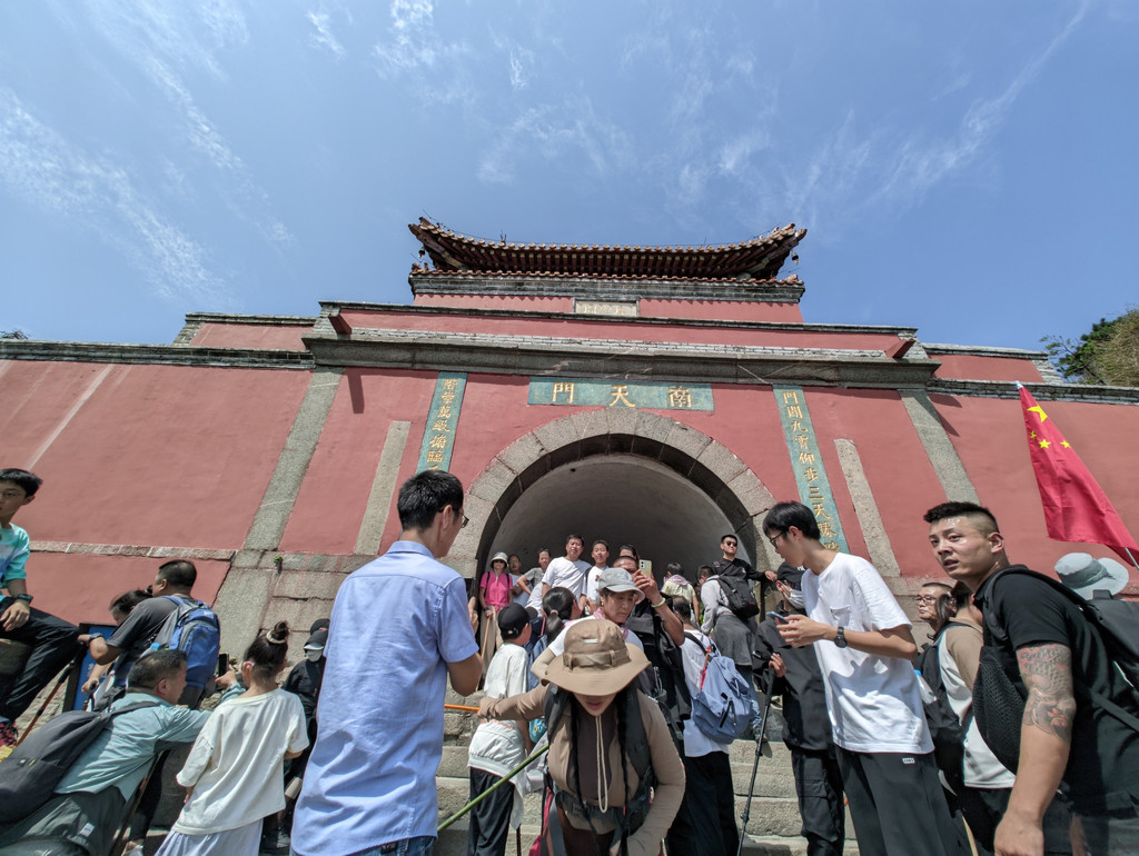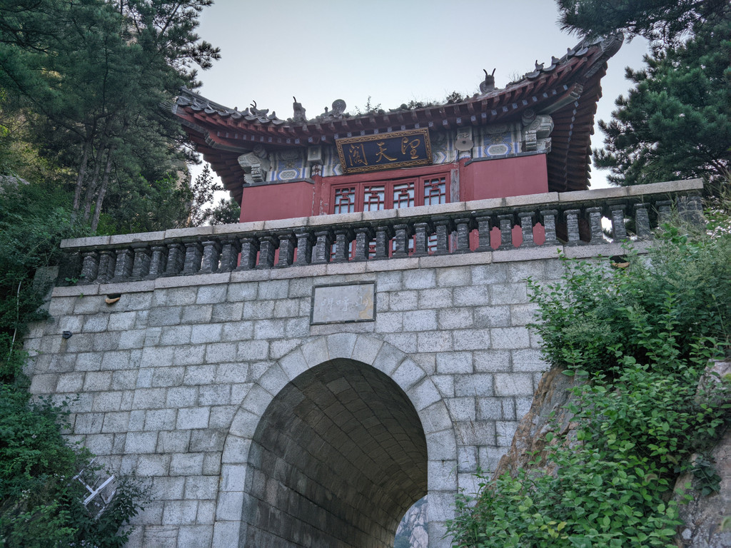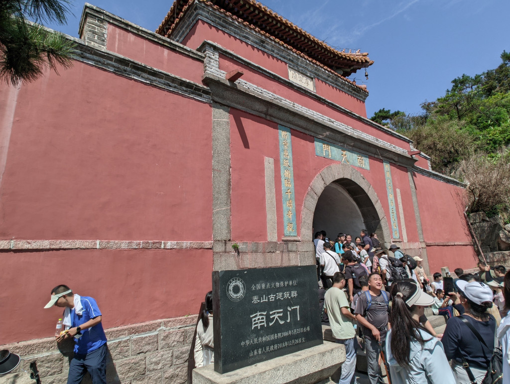 泰山南天门位于十八盘尽头,是登山盘道顶端,座落在飞龙岩和翔凤岭之间的山口上。由下仰视,犹如天上宫阙,是登泰山顶的门户。创建于元至元元年(1264年),明清多次重修,建国后又翻修两次。建筑保持了清代的风格。