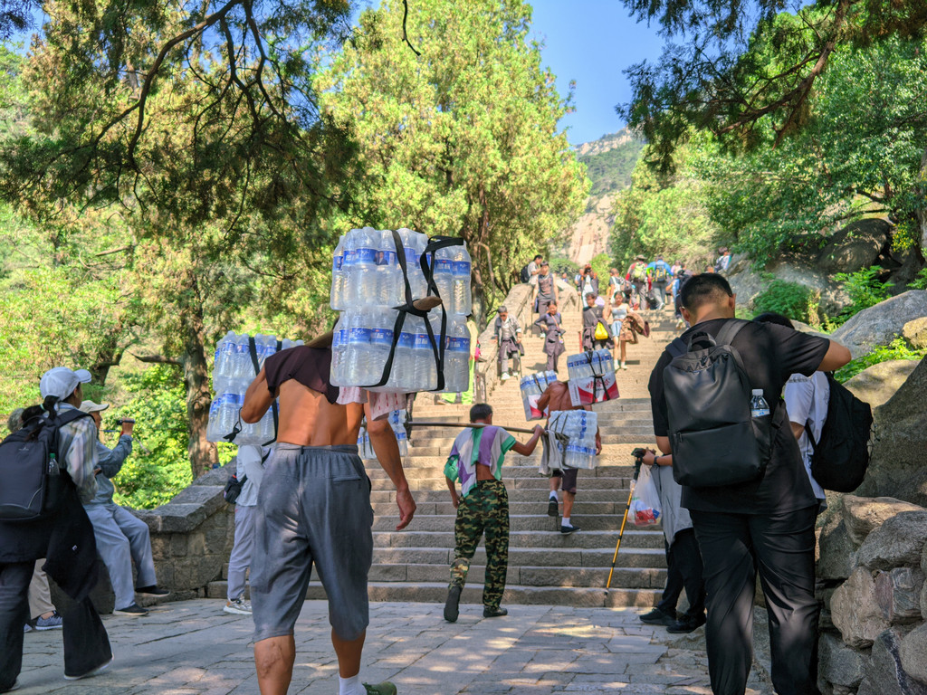 偶尔会看到有搬运工背着矿泉水等物资上山,这就是以前课文所写的“挑山工”吧。