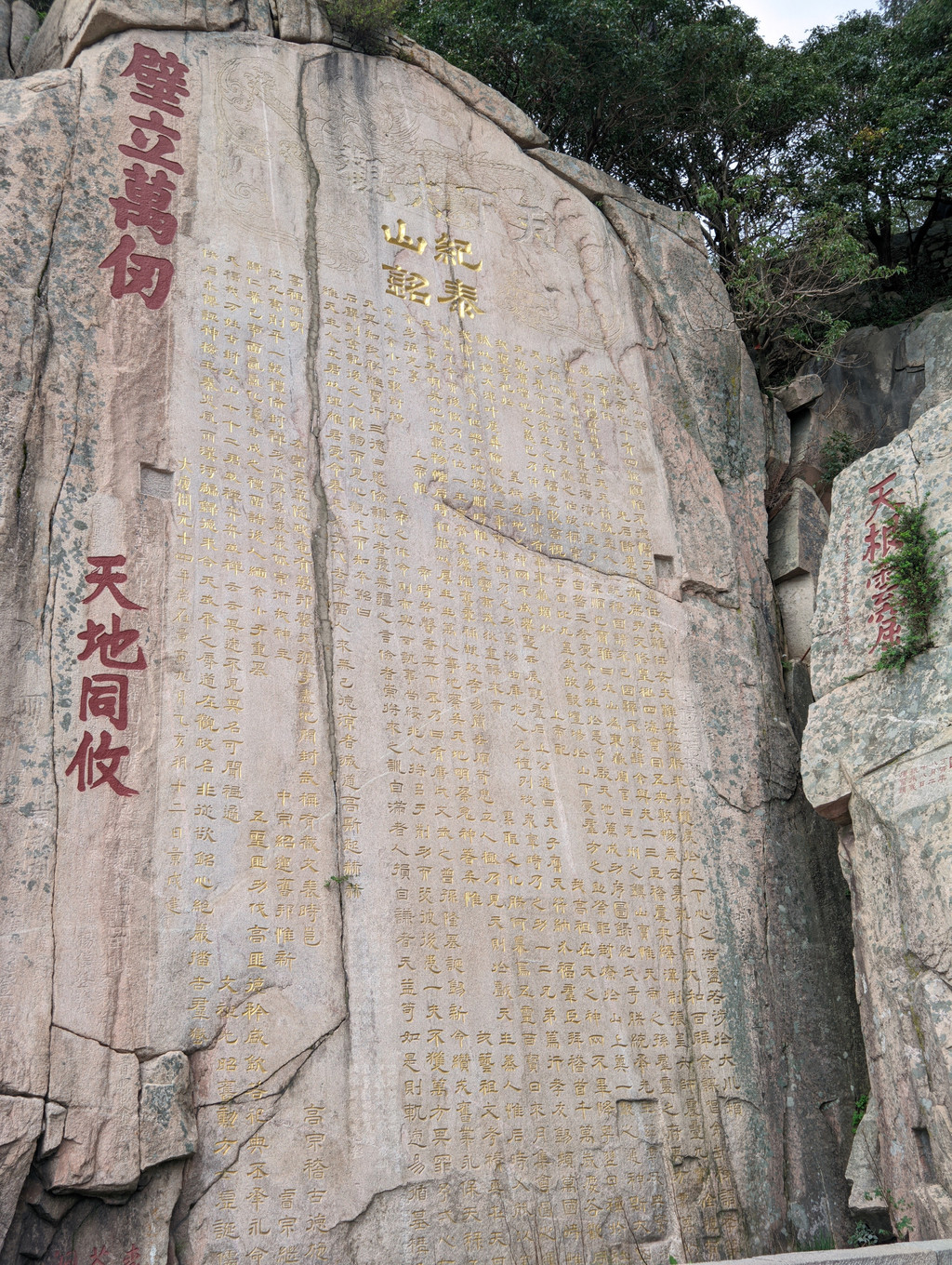 诸多石刻中最著名的为唐玄宗李隆基东封泰山时亲手撰书《纪泰山铭》刻石,摩崖高12.3米,宽5.3米,碑文书24行,满行51字,现存1008字,字大16×25厘米,除“御制御书”4字和末行年、月、日为正书外,其他均为隶书。额高3.95米,隶书“纪泰山铭”2行4字,字大45×56厘米,书法遒劲婉润,端严雄浑。碑文为唐玄宗李隆基东封泰山时亲手撰书,相传由燕许修其辞,韩史润其笔,文词典雅,对研究唐代历史、书法、镌刻艺术均有重要价值。