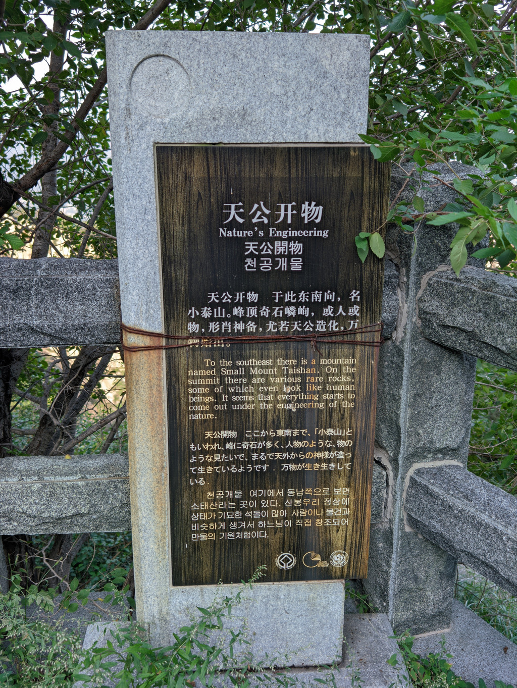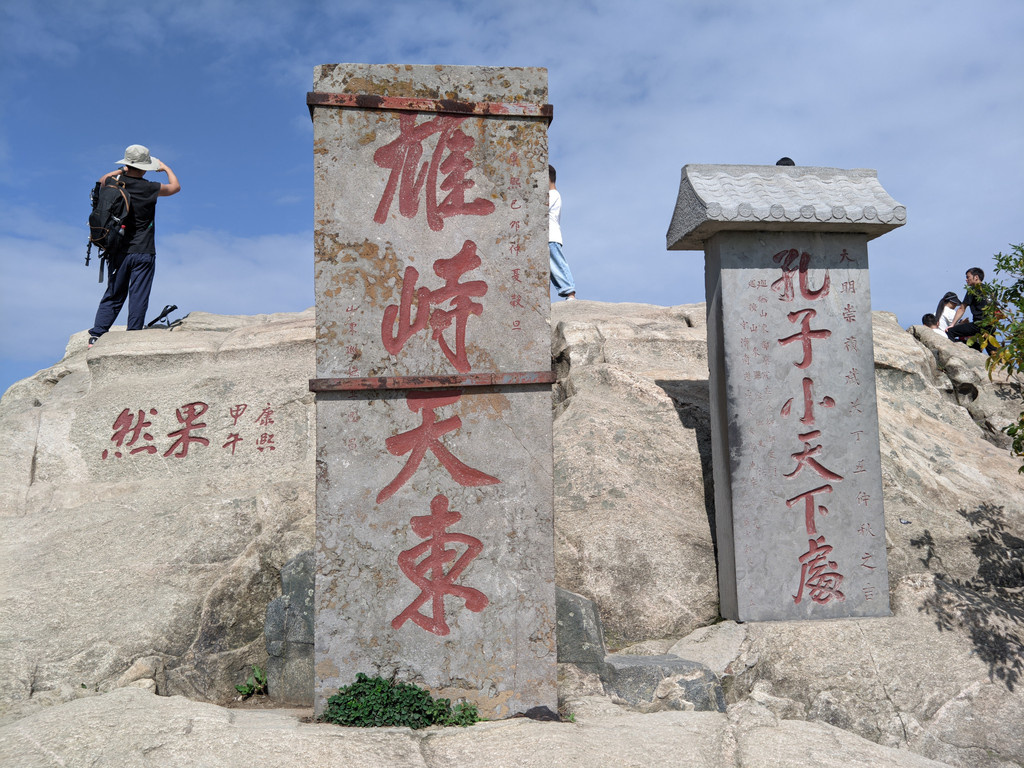 “孔子登东山而小鲁,登泰山而小天下”这句话可以说是人尽皆知,在日观峰处有一通石碑“孔子小天下处”,为大明崇祯年间所立,其旁则为著名的“雄峙天外”碑刻。