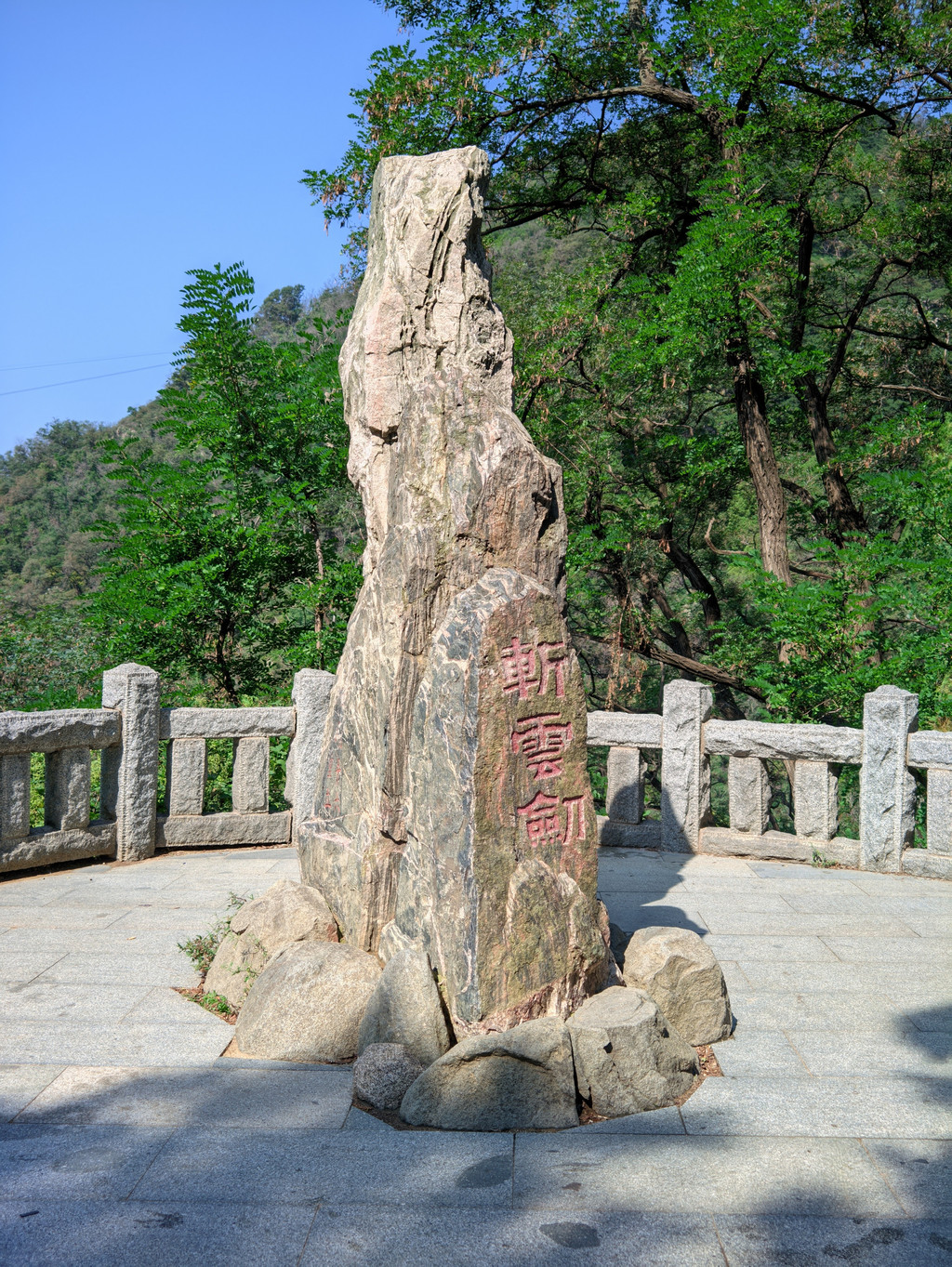 斩云剑,景点之一,位于山东省泰安市,增福庙往上有巨石挺立,似剑凌空,上刻"斩云剑"。此处是谷口,云雨变幻莫测,泰山主峰的寒云顺谷而下时与暖云相遇即化为雨,因此而得名。