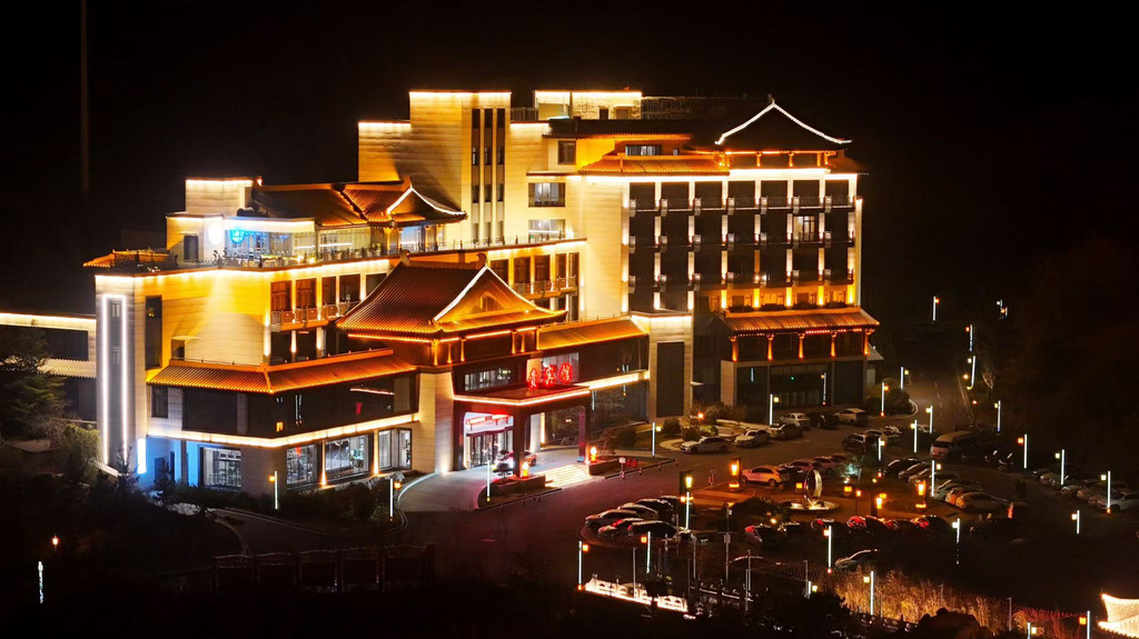 祖徕山森林温泉康养度假谷的灯火亮起,如幻如幻,宛若童话小镇。