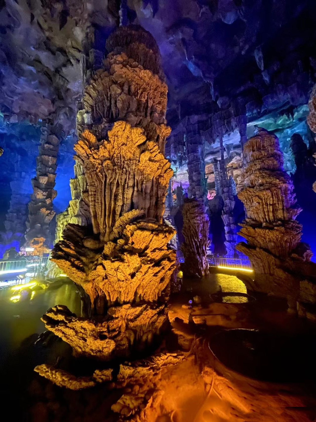 午后换个节奏,去地下龙宫探奇。喀斯特溶洞里,钟乳石在灯光下泛着温润的光,有的如擎天玉柱,有的似琼花绽放。乘上皮筏漂流时,水花溅在指尖,清凉驱散暑气,暗河的回响里藏着自然的鬼斧神工。