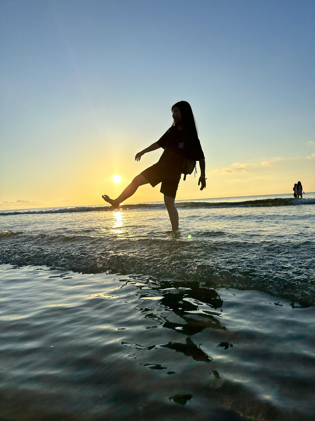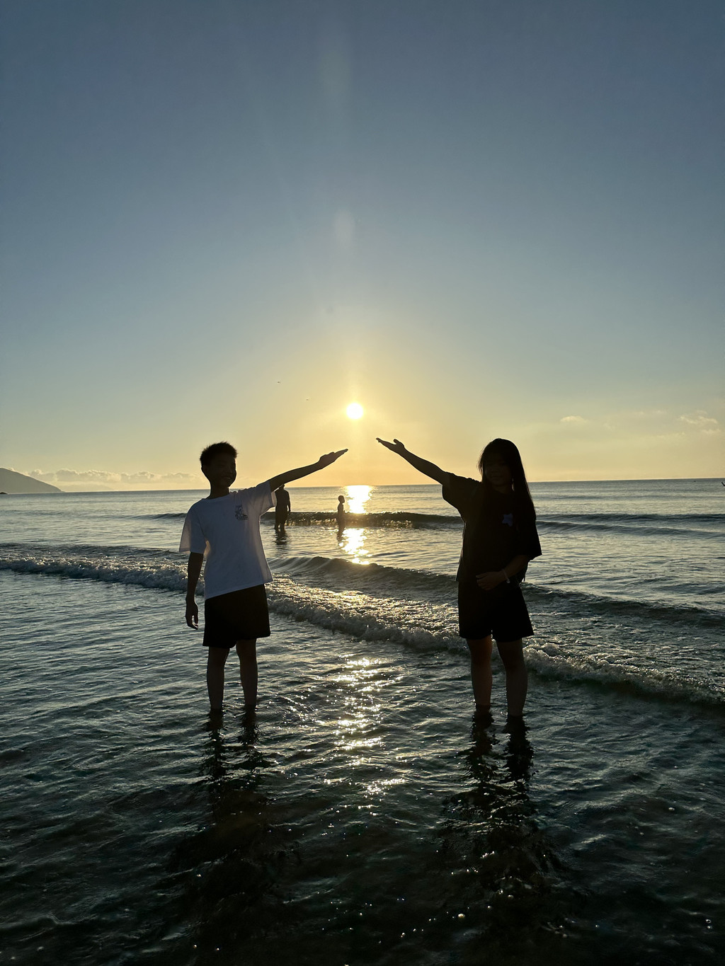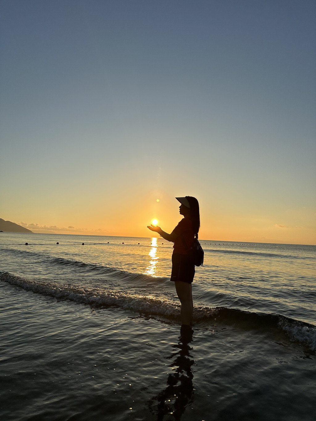 第二天我们5点就起床了,酒店老板送我们到飞沙滩,为什么叫飞沙滩呢?原来这海滩向东,一到冬天,雨水较少,海风又比较大,这里的沙子比较细,这样被风一吹沙子就满天飞,所以叫飞沙滩。清晨五点多来到飞沙滩已经也有很多人到了,都是为了看日出的。这时候的海风很温柔,海浪声也很轻柔,像是那些专业的催眠曲。东边是无边无际的海平面,这时海平线上的天空已经泛起的橙黄色,这是太阳将要升起的地方,橙色多么让人舒服,海水清凉干净,赤脚走在细细的沙子上,再靠近海浪让浪花拍打在脚面再浸到小腿,海浪一来一回,像是给脚做SPA,是美妙至极的感受。