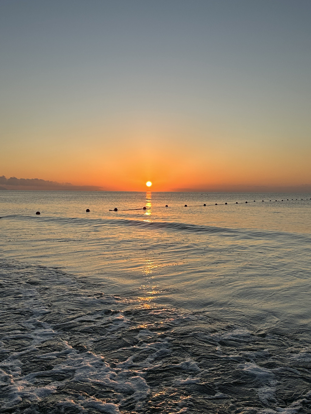 太阳慢慢升起来了,这过程就像是东海把太阳之子生出来一样,而我们是见证这一“分娩”过程的人,初生的太阳非常可爱。晨光辉映在海面上,闪闪发光,一切是那么的美好。