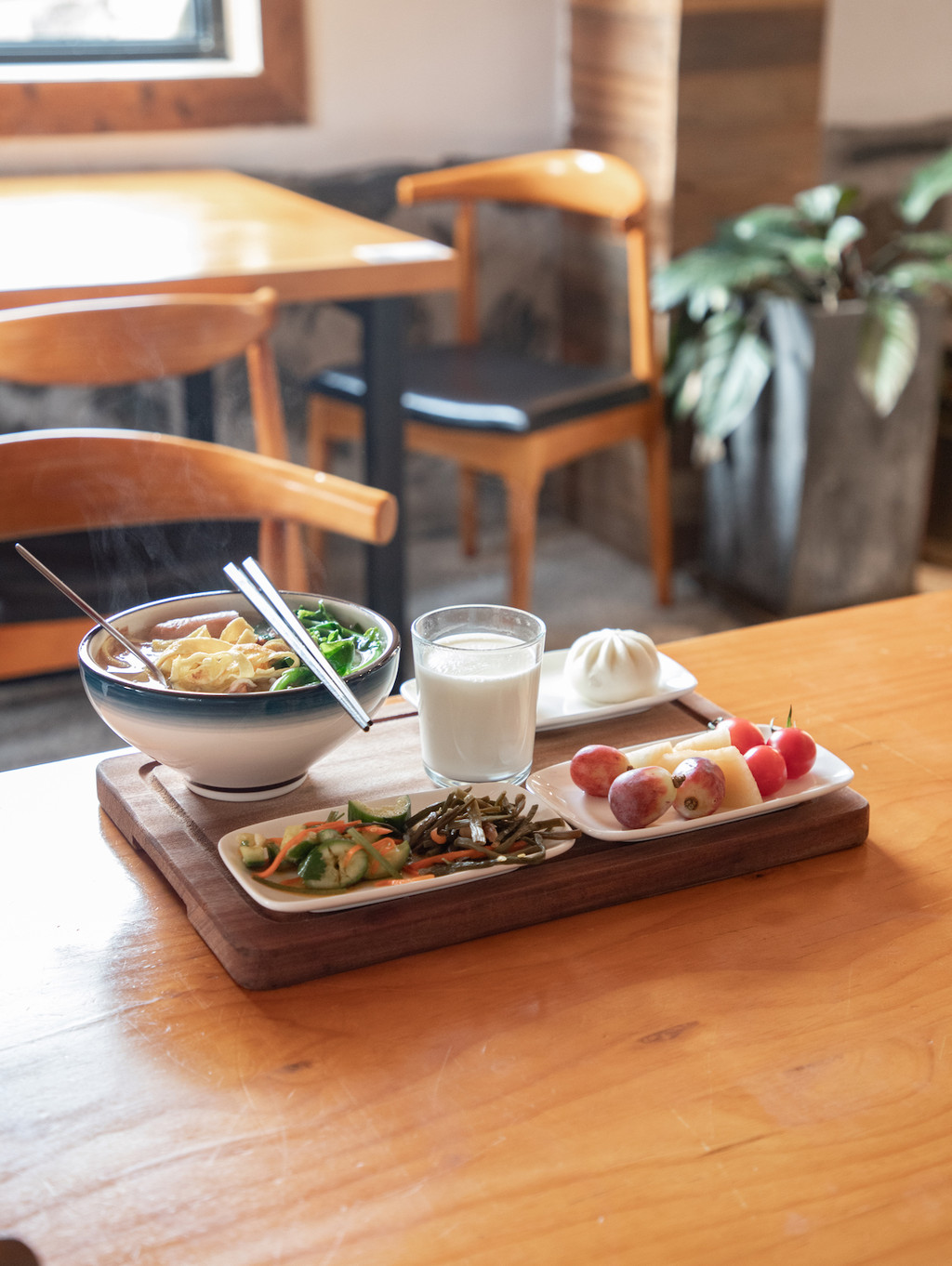 早餐是根据时令调整的,一人一份,牛奶是牧场提供的,很新鲜。 午餐、晚餐也是营业的,以西餐为主,有意大利面、牛排、牛肉饭、披萨等。