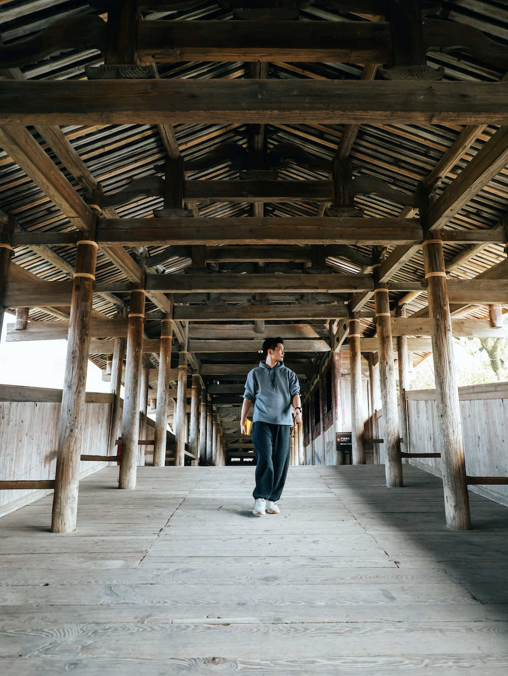 走在廊桥里,叠梁式木拱结构,非常清晰。桥梁的色调非常突出,给人以深刻印象。
