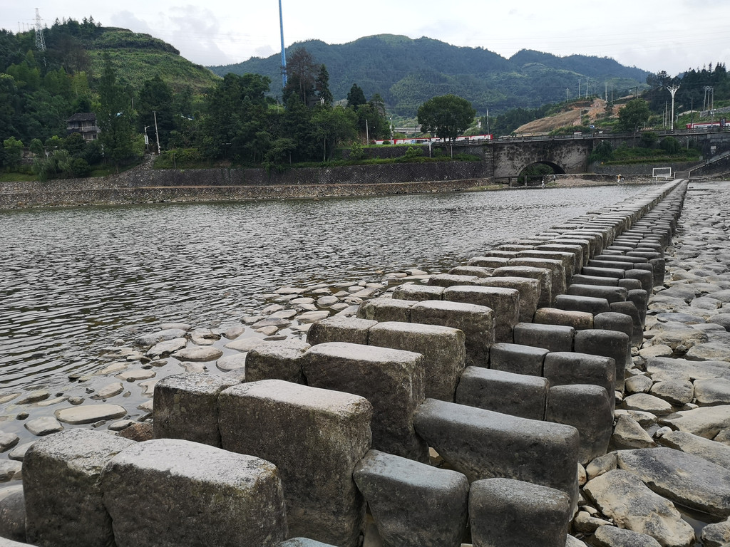 等没多久,去仕阳的车就开过来了,招手上车后,同样是支付宝电子公交卡扫码确认,下车再次扫码支付。到达仕阳后,问一下碇步怎么走,司机同样是热心的指明了方向,前行不远走到大桥边,看到桥头肉丸店的招牌,于是决定先在这里解决一下午餐。肉丸和肉丸面都是10元,店主介绍说肉丸就是全是肉丸,肉丸面也是10元,就是加一份面,但肉丸少了。大致明白后决定来一碗肉丸、在来一份肉丸面。端上来后觉得这样组合真是太正确了,要是二份肉丸面,我俩可能吃不下。两份全是肉丸,会觉得没有主食,每人单吃一碗肉丸觉得腻。吃过后店主告诉我们可以沿她这个店和桥中间夹缝这个小窄台阶下到水边的廊道内,既可以沿途看水,又可以避免阳光照到,走到头不远就是仕水碇步。道谢过后按她说的沿河边廊道一路前行很快来到碇步。泰顺县境内河流溪水上很多碇步,但大多没有这里规模大、年代久远,按照如歌文中介绍:从岸边望去,碇步绵绵延延地跨河而建,全长133米,由223块石齿一字排列,每块之间的距离约有30厘米。石齿表面平整,每一齿又分为高、低两级,相差有20厘米。据说高的石齿是供挑夫或是涨水时走,而低的石齿略宽,可供两人相向而行。因此,整条丁步可同时供三人并肩通过,并且能从容地避让对面行人。