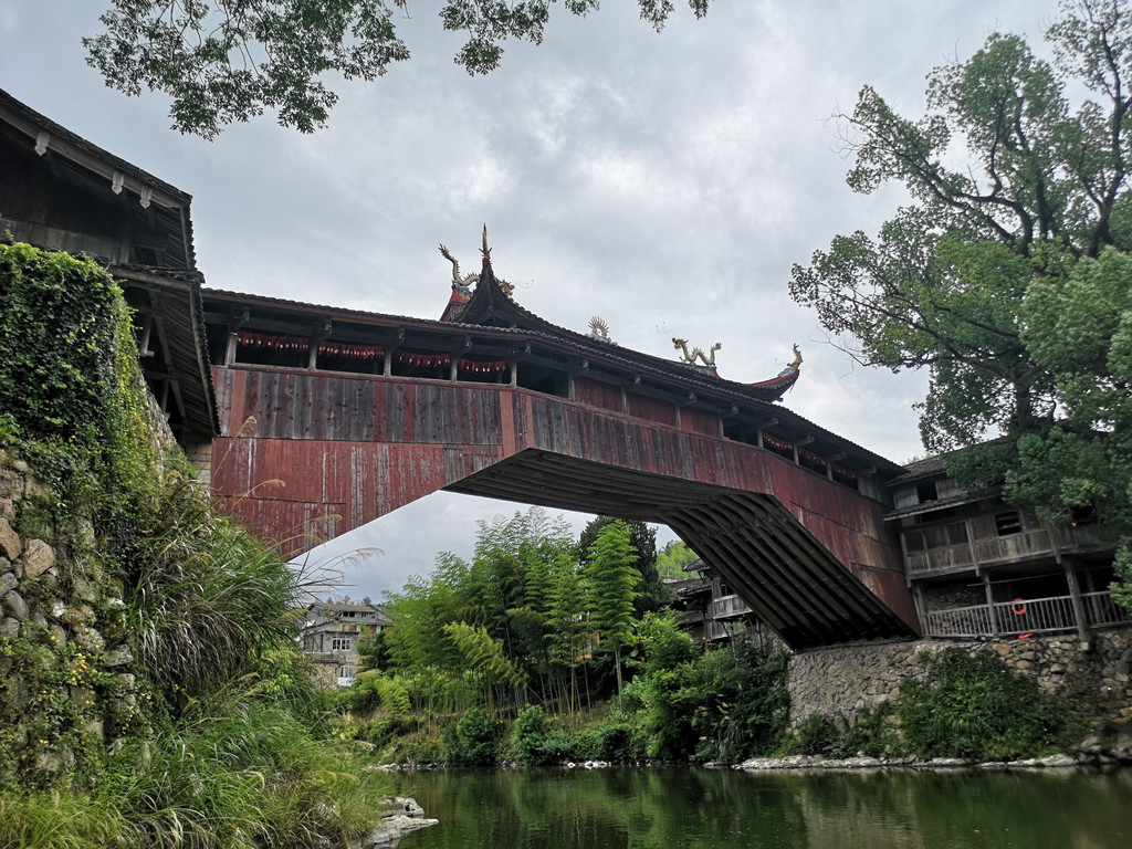 7点回酒店吃过早餐后,收拾妥当退房直接来到泰顺北站,这里的称谓是罗阳,因为泰顺县老城所在地是罗阳镇,这里有发往泗溪、三魁、筱村、洲岭等地的班车,按计划先去最美廊桥所在地泗溪,大约40分钟左右到达,班车师傅非常好,把车停在距离廊桥文化园很近的路口,并指明了方向。前行不远右侧就是北涧桥,我俩决定先去稍远一点的溪东桥,沿路前行不久,看到一古建,一看是临水殿,知道溪东桥已在眼前,在殿内看到一幅泰顺全域旅游全景图,非常清晰直观,对照一下自己计划要去的廊桥,觉得已经很有代表性了,于是更坚定了自己的行程。出临水殿即是溪东桥,17年前知道你的存在,如今终于相见!走在古老的廊桥内,没有其他游人,更可细细品味,慢慢欣赏。始建于明隆庆四年(1570年),乾隆十年(1745年)重建的溪东桥,历经276年风雨沧桑,依旧默默注视溪水长流。