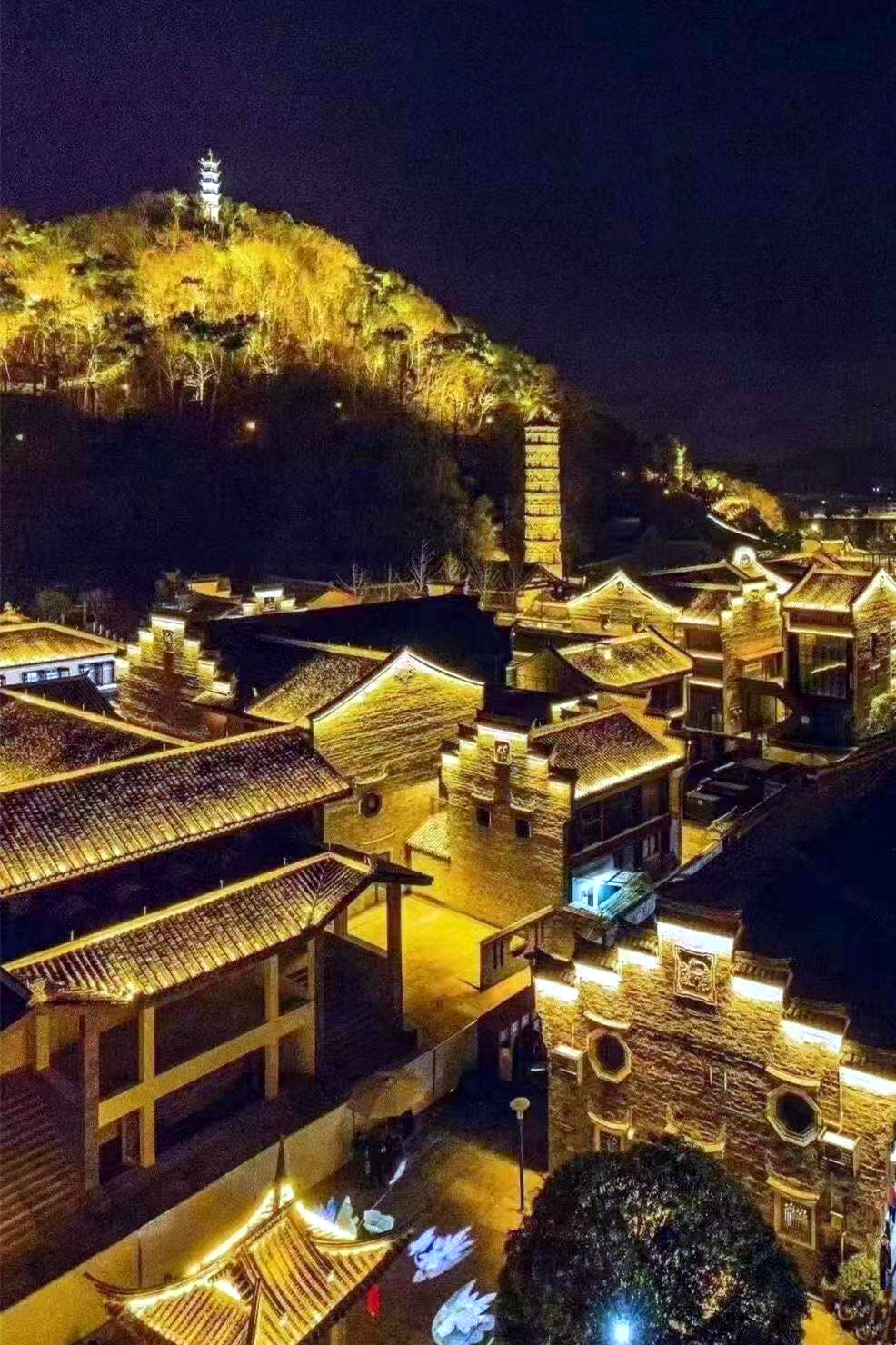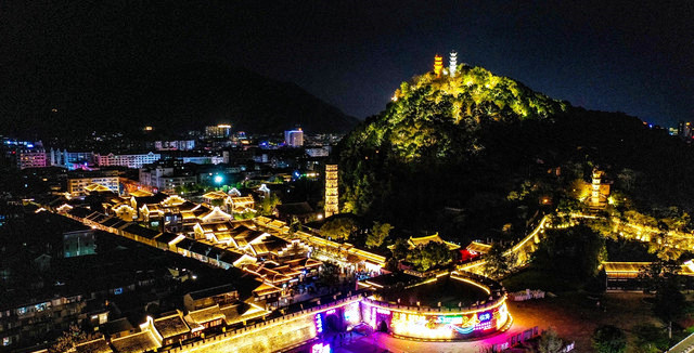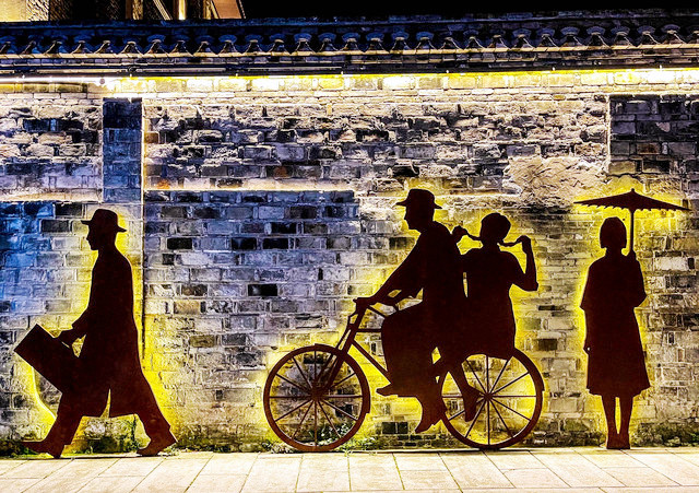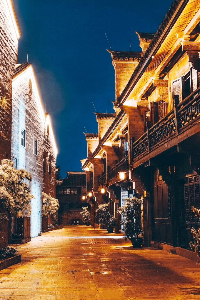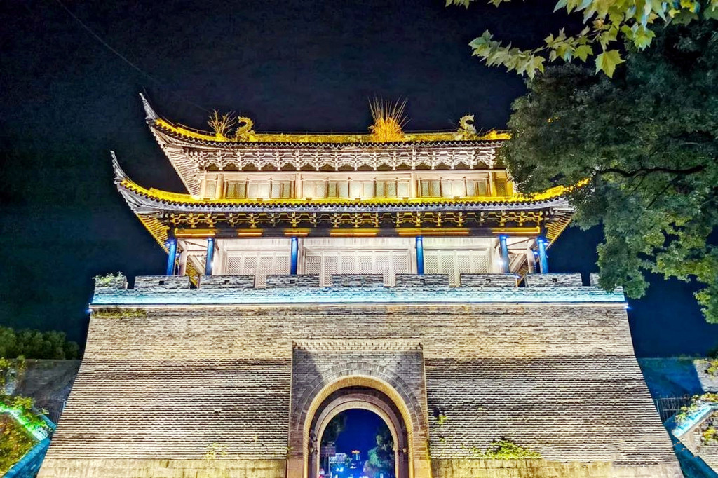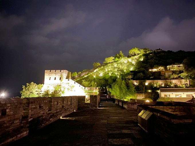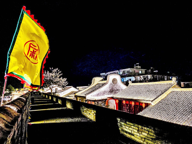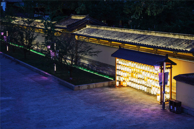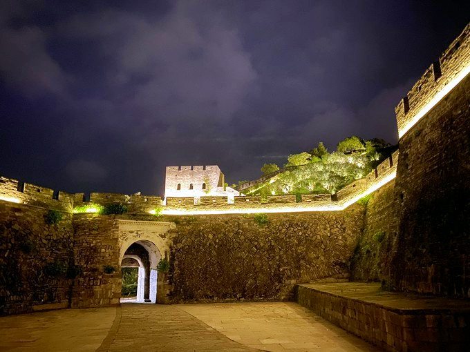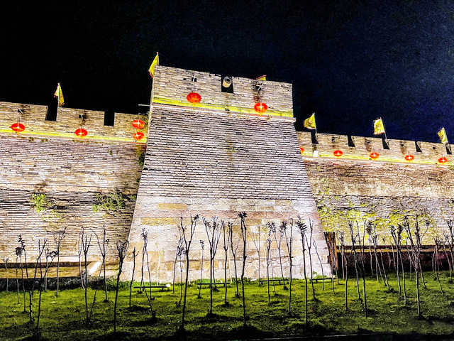 华灯初上,夜色朦胧,从兴善门上城墙散步(晚七点后免费),巍峨的城墙被灯光点亮,一块块历经沧桑的城砖闪烁着光芒,一座座双层空心敌台点亮了古城的浪漫,龙兴寺内的千佛塔被夜光照得透亮,和巾山文峰双塔遥遥相望,沿着龙兴寺古老的院墙慢走,晚风送来古寺里的香烛气味,节气灯笼墙散发着梦幻般的柔光,我们感受着古寺的宁静禅意,街道两旁古雅灯火,流光溢彩,演绎着光与影的交融,还有浓郁的怀旧气息诠释着古城的味道,不知不觉走到东湖,只见湖面平波,亭台如画,堤隔桥连,活脱脱一个袖珍版的西湖,与东湖公园北门仅隔一条马路的江南长城在夜幕下,褪去了青山巍峨的气势,披上了一层安静又柔美的华丽外衣,抬头仰望,山顶城墙之上有一楼阁直插云霄,楼顶高插青冥,气势非凡,我们在灯光隧道里,寻找穿越的感觉。
