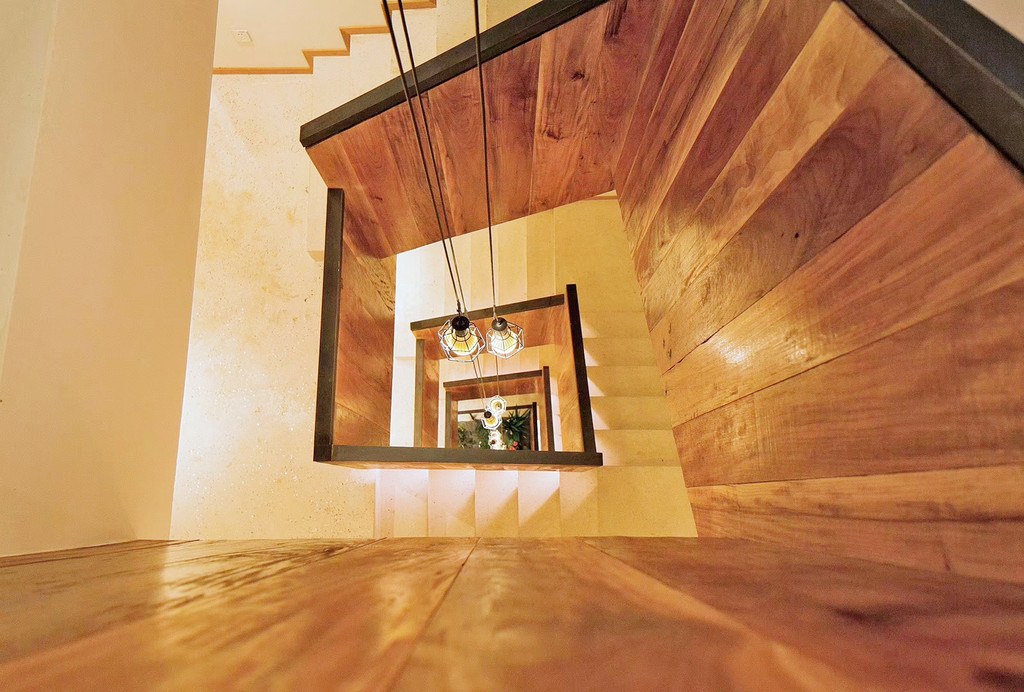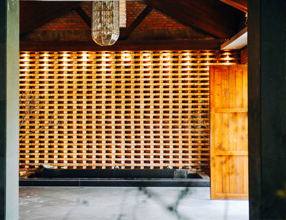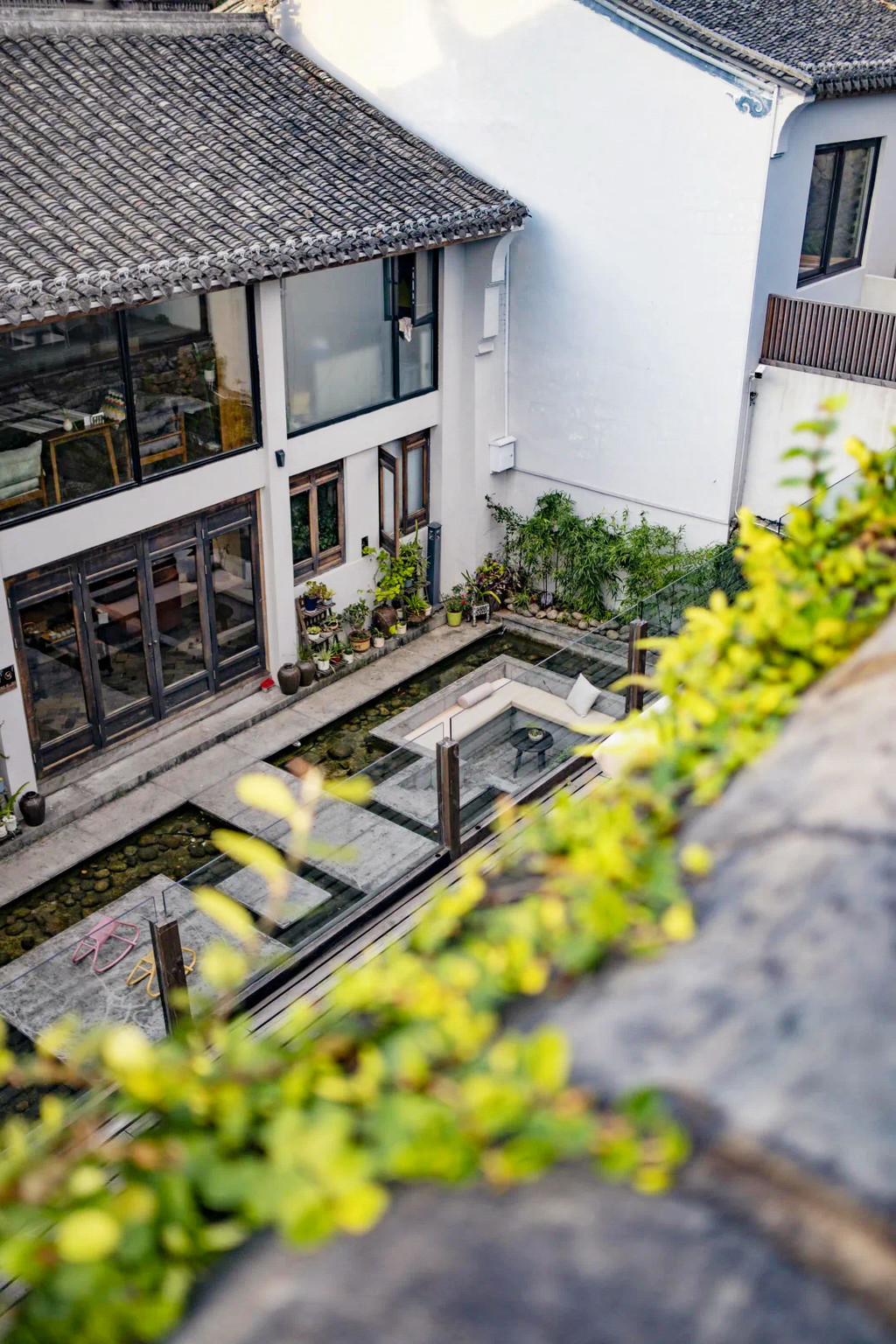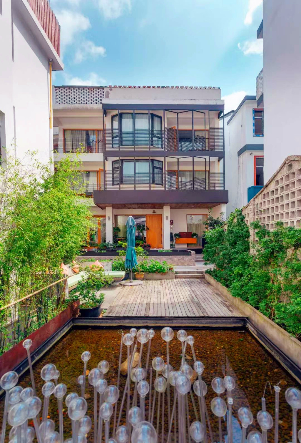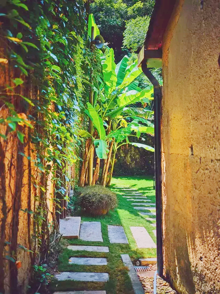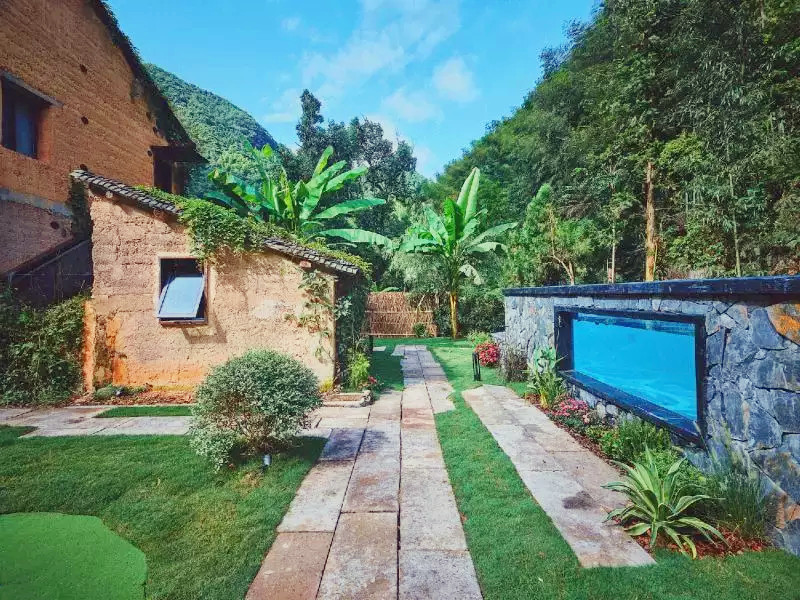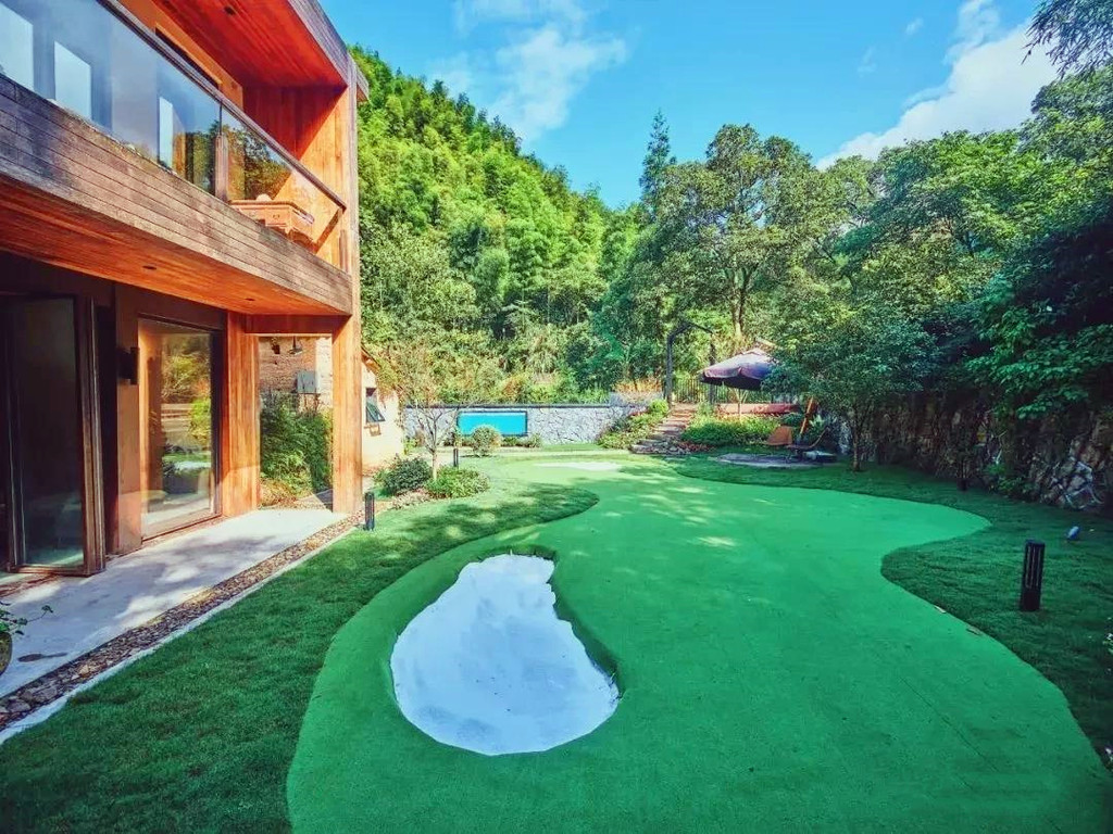 柒竹共有两个各自独立的院子,不相通但相邻,我们住的是2号院,但1号院更加精奢,有更多的独享空间,管家特地带我们过去参观,只见简洁的店名招牌挂在粗犷的石墙上,拐角走进前院,视野顿觉开阔,石板、卵石、草地铺开了整个小院,阳光随意地撒了几术光在木门上,两层夯土小楼上爬满藤蔓,后院大片开阔的草坪上有个迷你高尔夫球场,还有几只小流浪猫时不时来到后院,在草地上嗅嗅花,抓抓蝴蝶,伸个懒腰,球场的另一侧是一座悬山式泳池,泳池的亮点在于池壁上加入了一个透明窗,轻轻松松就能拍摄出水下梦幻大片。