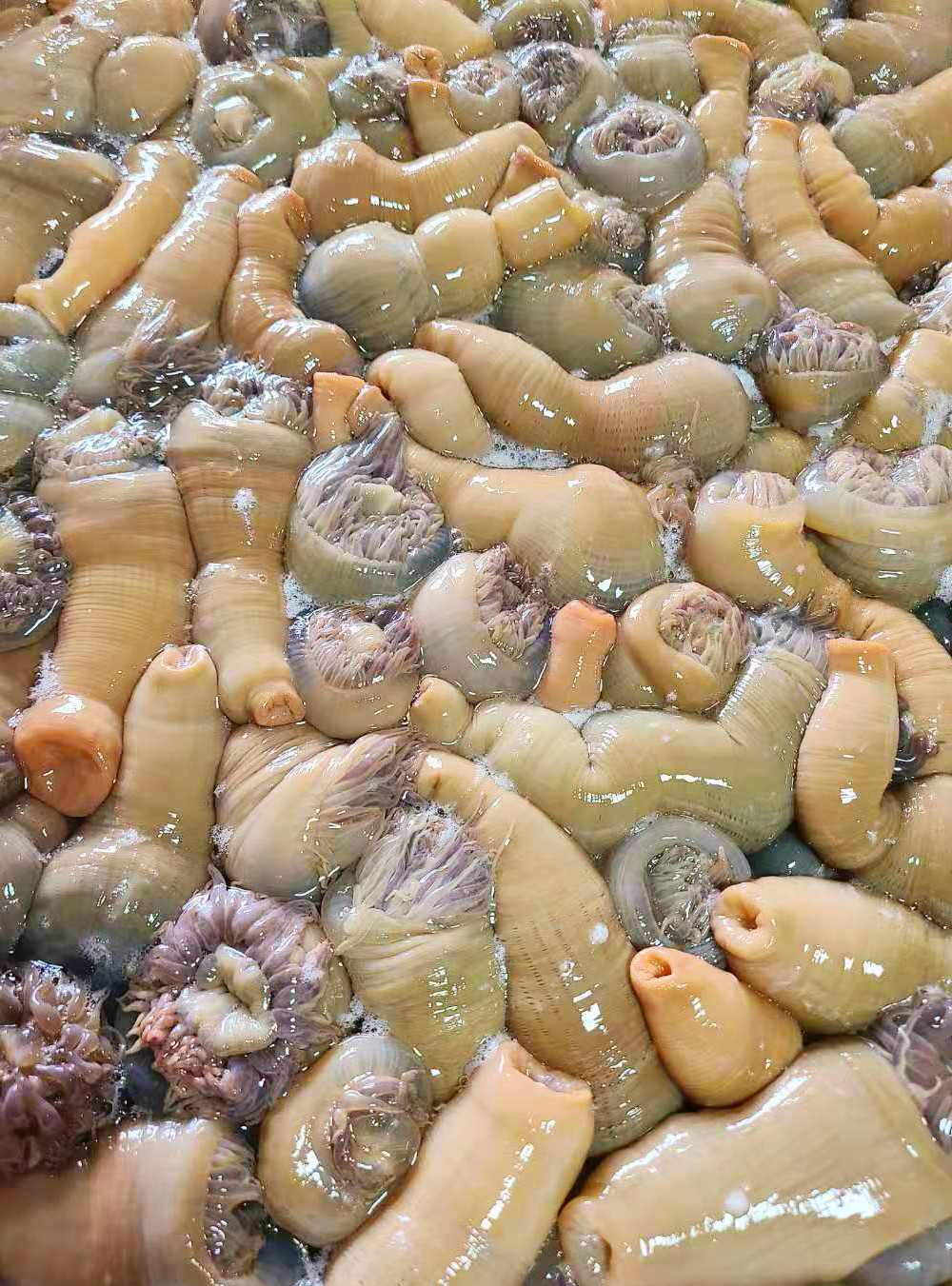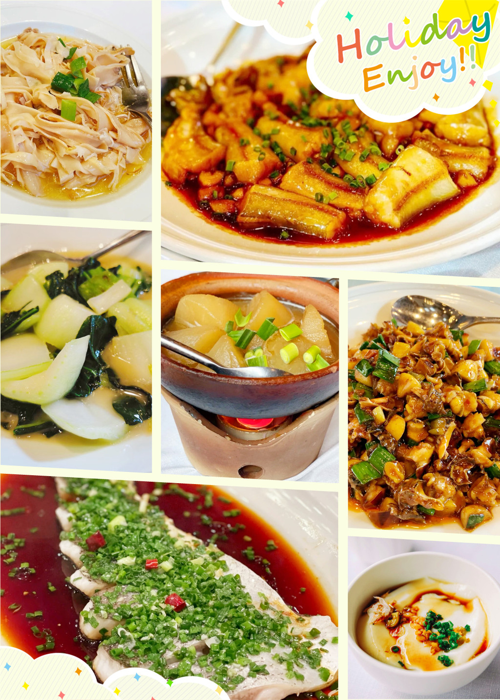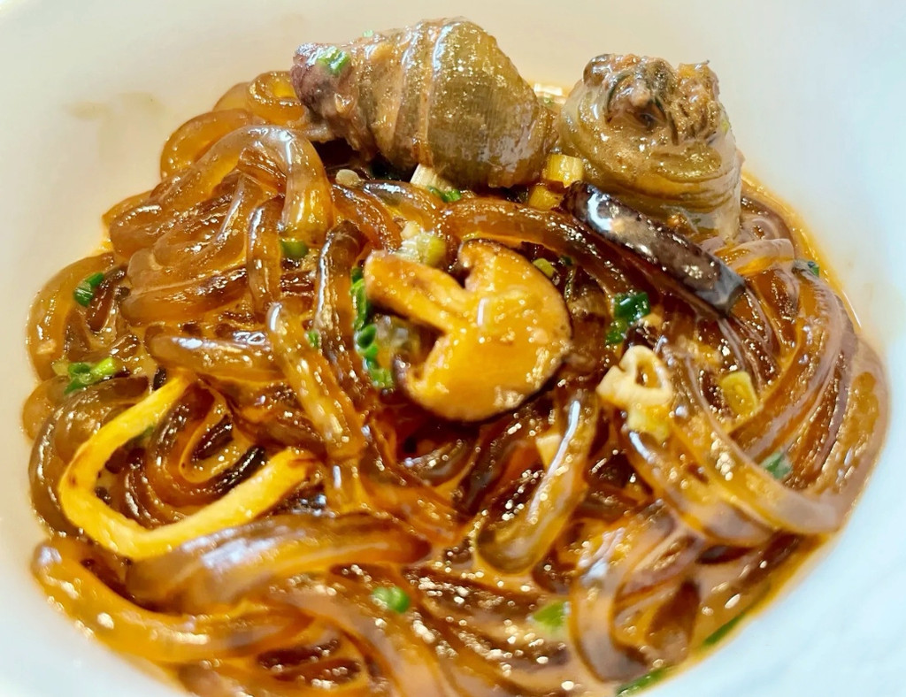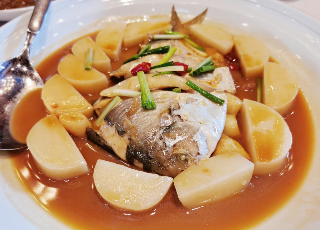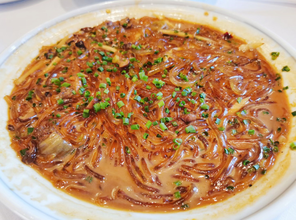 海鲜类的出品更是不必说,家烧鲳鱼配年糕是我的心头好,鲜美的鲳鱼,入味的软糯年糕,一口满足,经典菜式沙蒜烧豆面是新荣记人气很高的一道菜,很有台州特色,很多人第一次吃都不知道沙蒜是个啥,其实它也是一种海鲜,学名叫海葵,跟豆面搭配鲜香绵绸,软糯弹牙,就算单独吃也不会觉得腥。还有餐前的咸豆花、入味的萝卜和笋衣、时令的油冬菜、软嫩的水潺和翘嘴鱼、肥美的螺肉……好吃的菜品多到不胜枚举,以至于我们第二天中午临走前又来光顾了一餐。