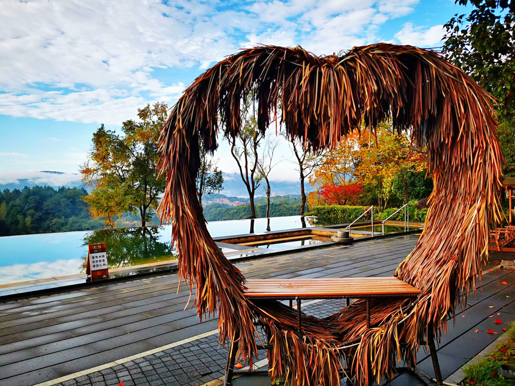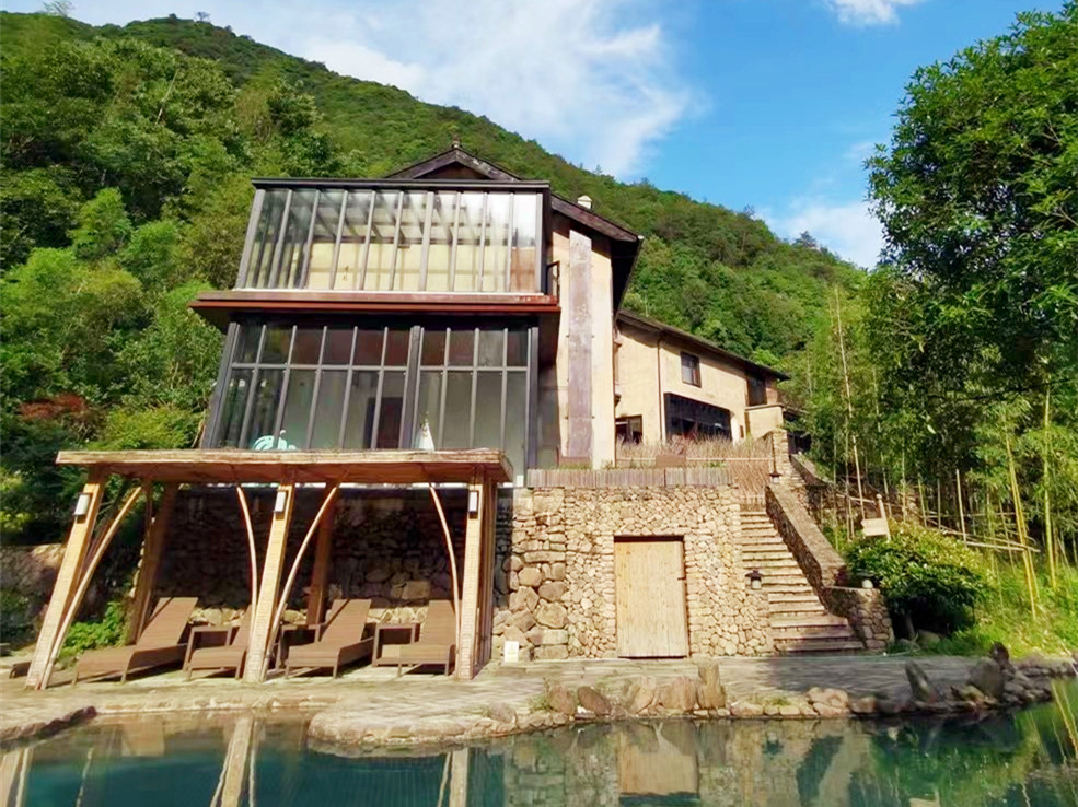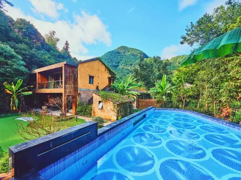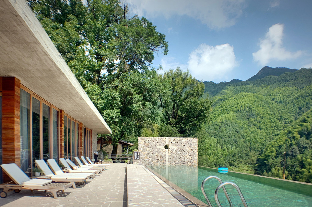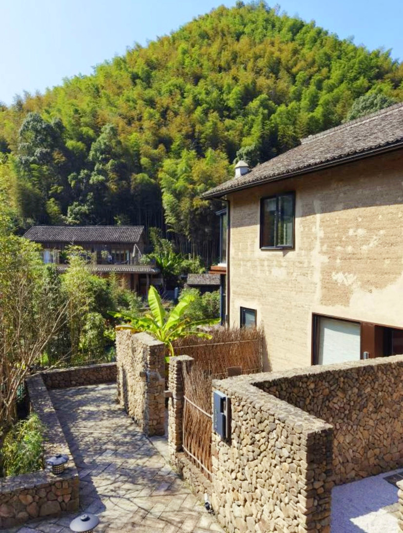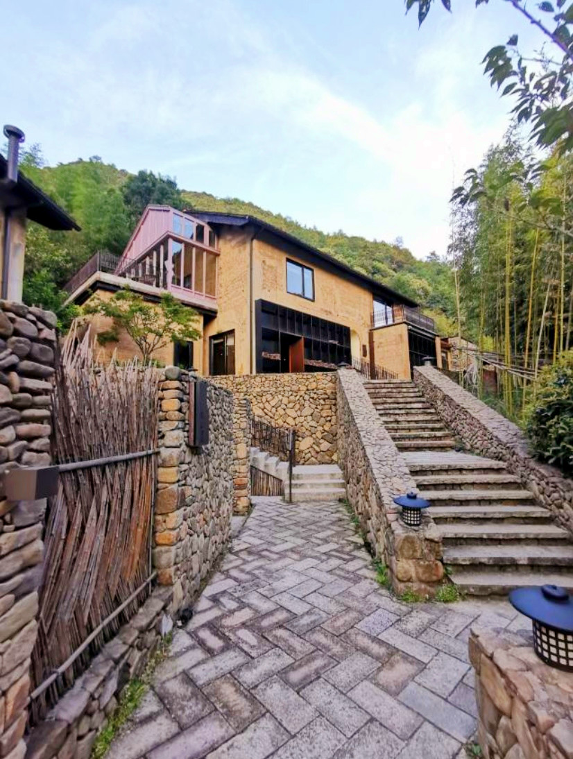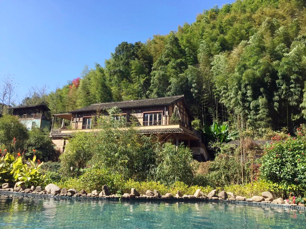 今天入住的柒竹青龙坞,原是餐饮界大佬、外婆家创始人吴国平的私人会所,并不对外开放,后由柒竹的品牌创始人接手,才正式对外运营,与车道旁的民宿不同,要想找到柒竹,必须要沿着小径上山,石板小路伴着溪水流淌,道路两旁野花绿草,配上时不时闪现的碧蓝色泳池,一点也没有秋天的萧瑟落寞之感,经电话联系,管家来路口接,指挥将车停在路边后带着我们拖箱子上山,最好还是轻装简行。从外观上看,它并不奢侈华丽,倒是泥墙青瓦把野趣展露无遗,有一种更接近原始的粗犷美,夯土墙、竹篱笆、院子里的茅草凉亭和竹板凳……山里的雾气有点重,层层叠叠的竹林,半山腰上挂着淡淡的云,石板路也是湿漉漉的,石头缝里长着绒绒的青苔,空气异常的清新,忍不住时时深呼吸。