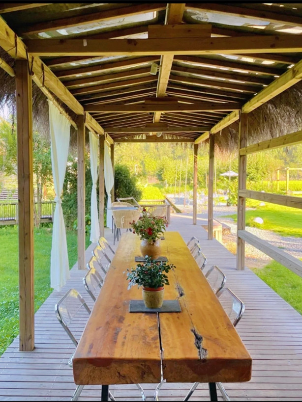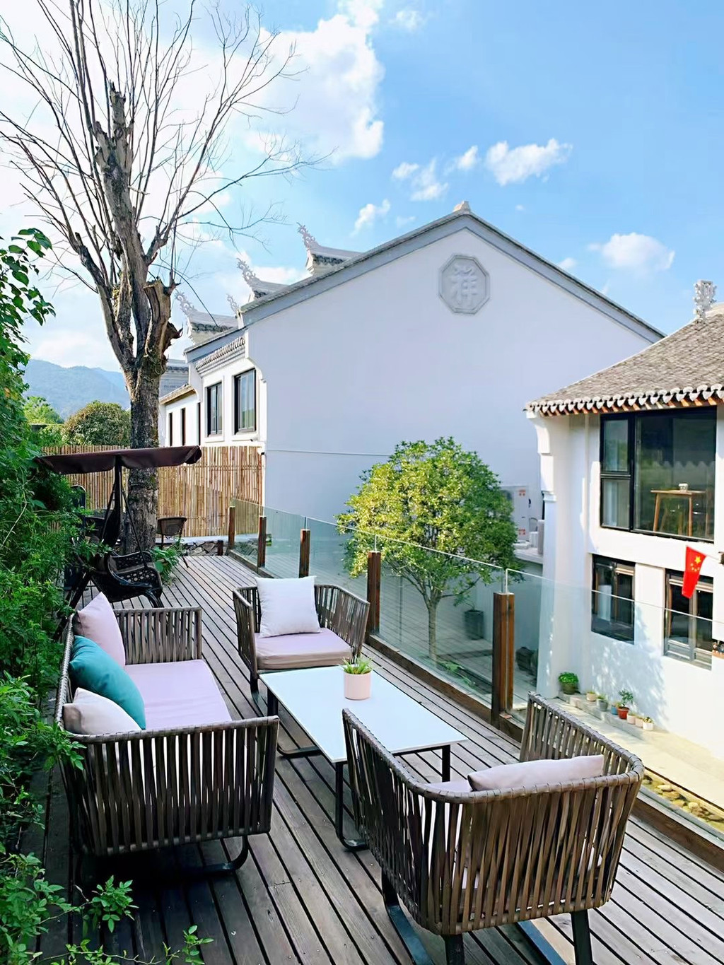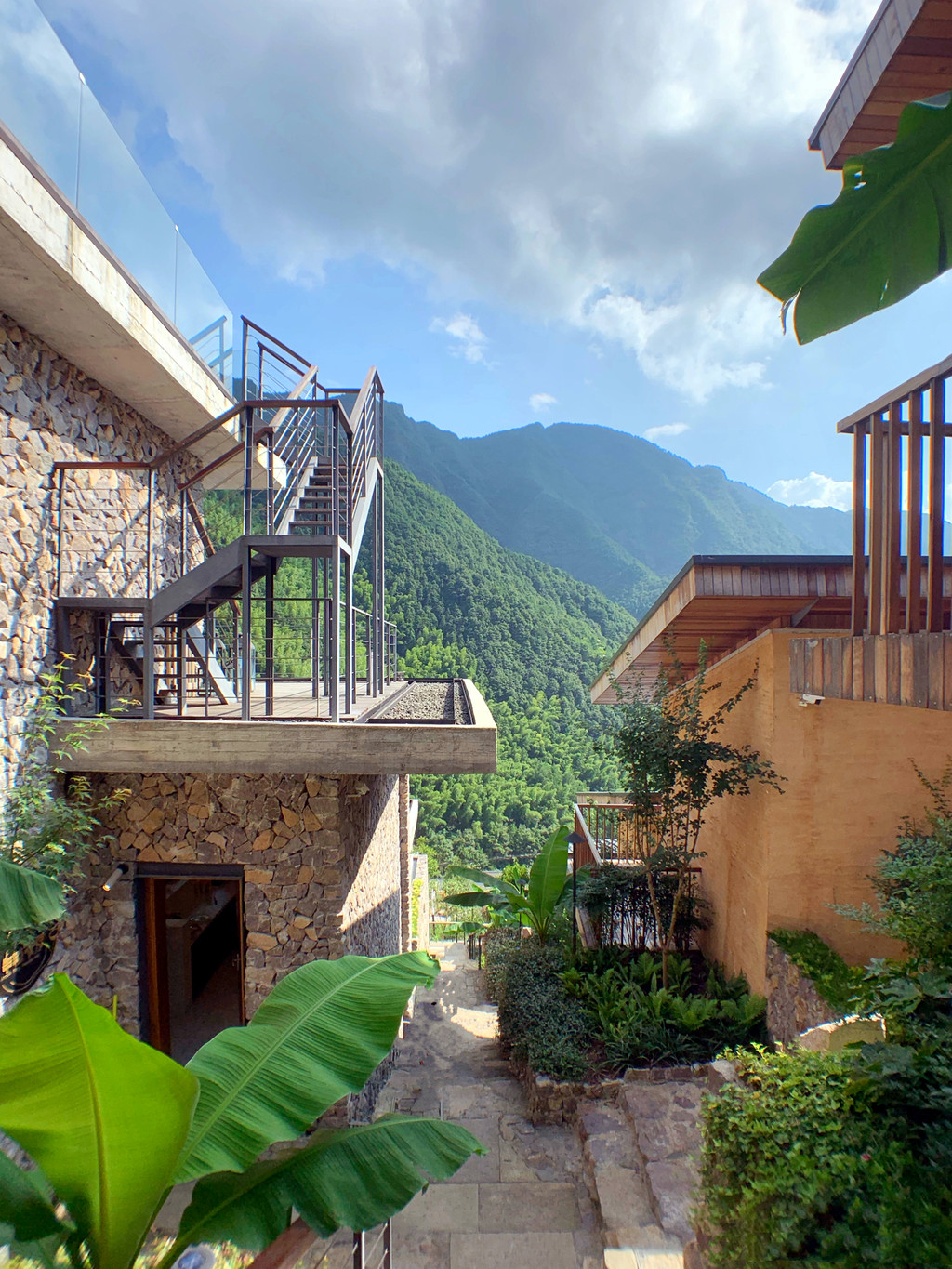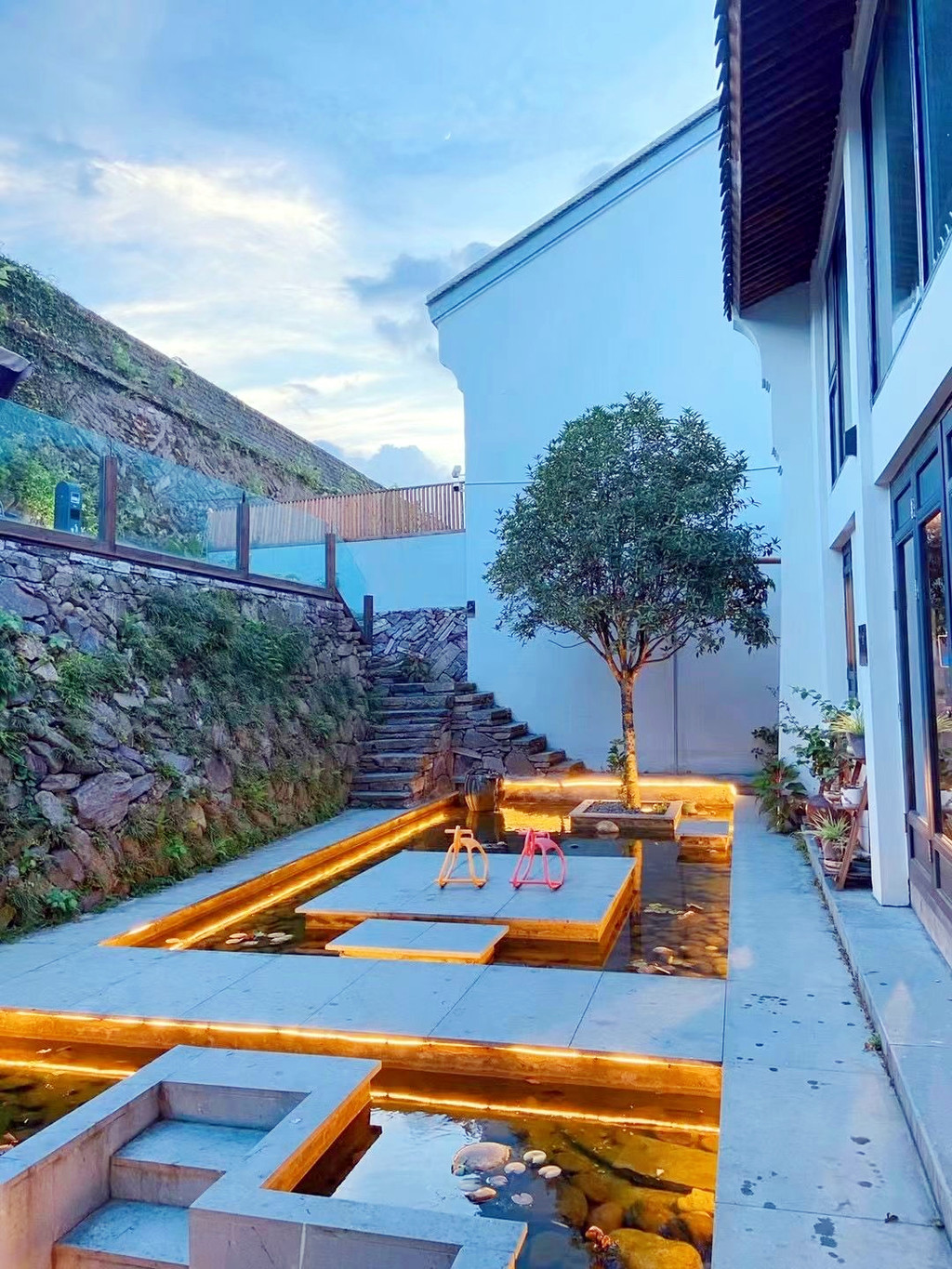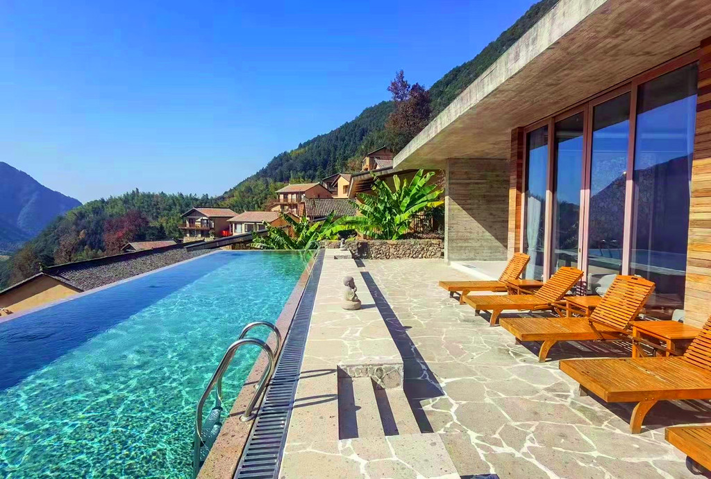 今天入住的柒竹青龙坞,原是餐饮界大佬、外婆家创始人吴国平的私人会所,并不对外开放,后由柒竹的品牌创始人接手,才正式对外运营,与车道旁的民宿不同,要想找到柒竹,必须要沿着小径上山,石板小路伴着溪水流淌,道路两旁野花绿草,配上时不时闪现的碧蓝色泳池,一点也没有秋天的萧瑟落寞之感,经电话联系,管家来路口接,指挥将车停在路边后带着我们拖箱子上山,最好还是轻装简行。从外观上看,它并不奢侈华丽,倒是泥墙青瓦把野趣展露无遗,有一种更接近原始的粗犷美,夯土墙、竹篱笆、院子里的茅草凉亭和竹板凳……山里的雾气有点重,层层叠叠的竹林,半山腰上挂着淡淡的云,石板路也是湿漉漉的,石头缝里长着绒绒的青苔,空气异常的清新,忍不住时时深呼吸。