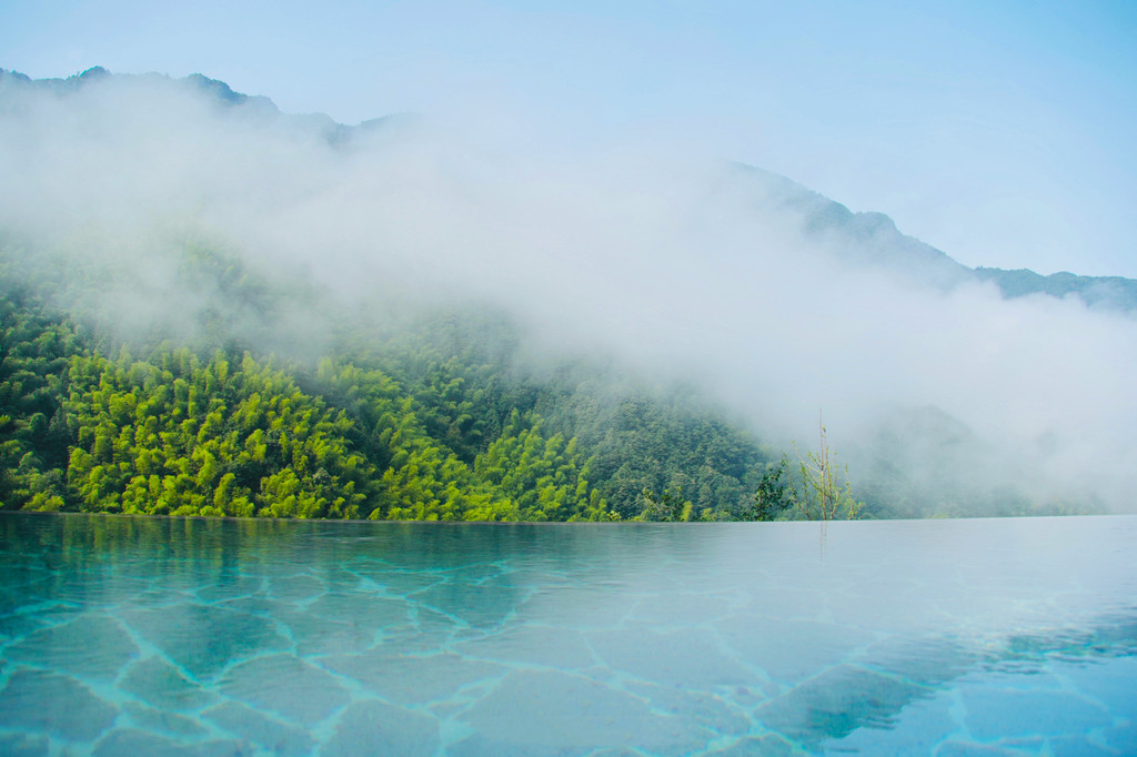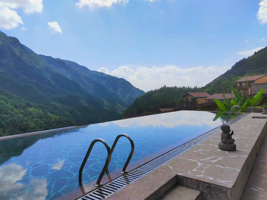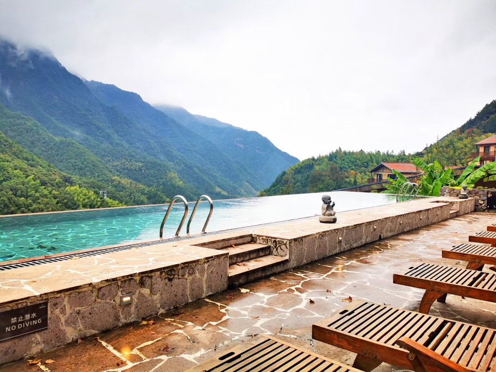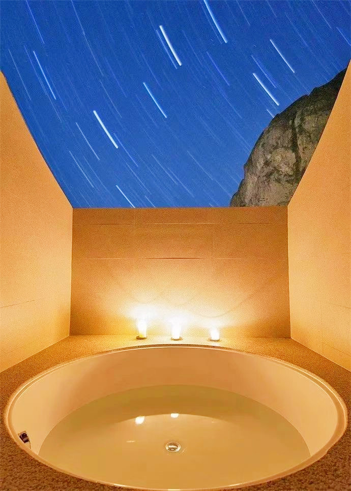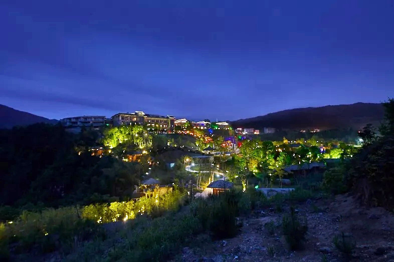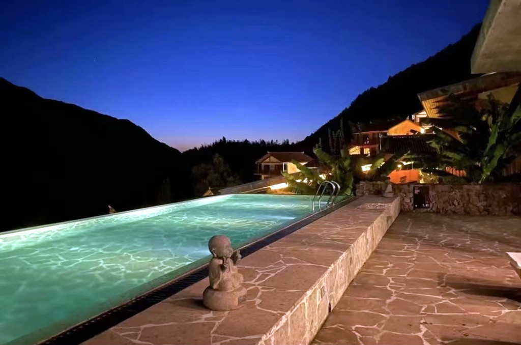 停好车微信联系管家,就会有专人为我们搬运行李,即便两手空空,爬上层层台阶还是有点累的,垒石路面湿滑还容易摔倒,大家走的小心翼翼,偌大的露天无边恒温泳池,直面这一片广袤山景,每当水雾与山雾缠绕在一起时,仿佛置身于仙境,分不清是人在水里,还是人在云中。夜色降临之后,山间的雾气缓缓散开,半山一隅一座座层叠的高楼灯火明亮,一片烛灯树影静偎不语,山间的虫鸣阵阵回响,显得更加静谧,简直是复刻了《千与千寻》的秘境!