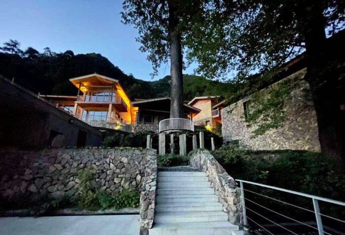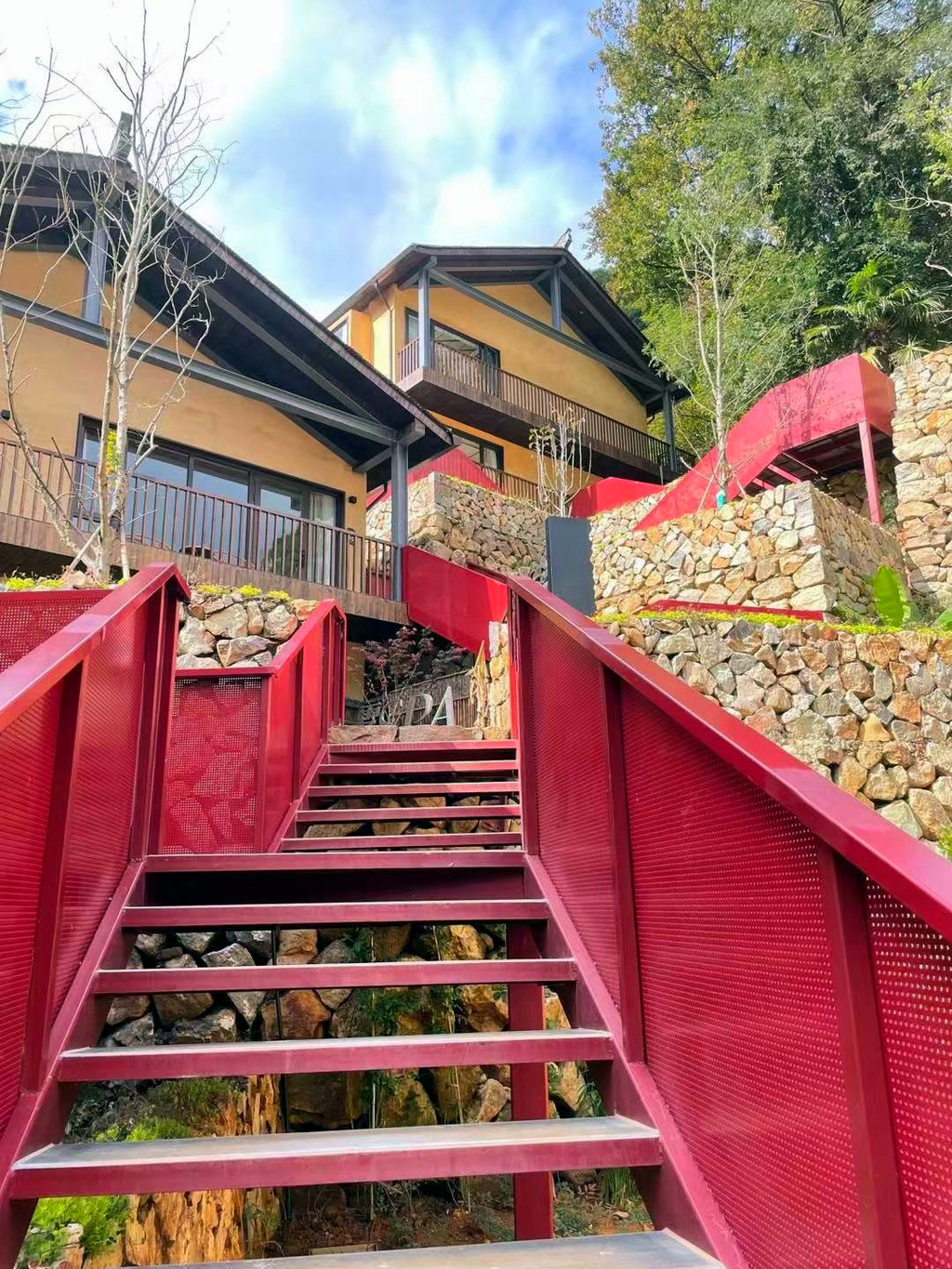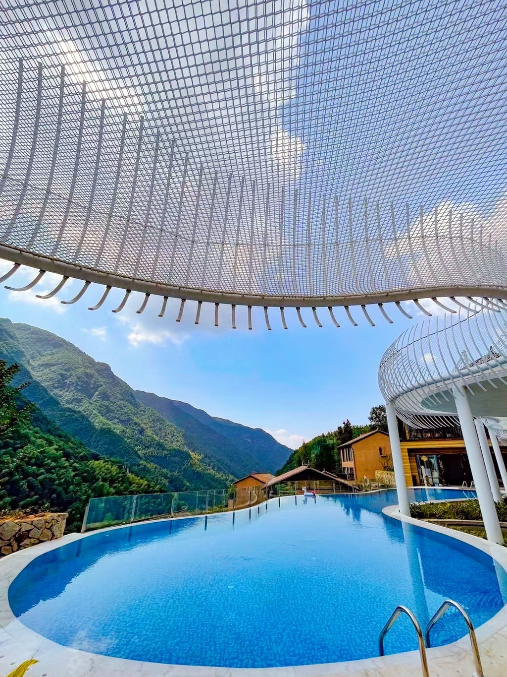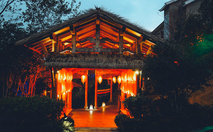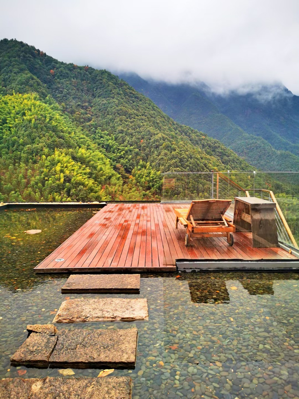 停好车微信联系管家,就会有专人为我们搬运行李,即便两手空空,爬上层层台阶还是有点累的,垒石路面湿滑还容易摔倒,大家走的小心翼翼,偌大的露天无边恒温泳池,直面这一片广袤山景,每当水雾与山雾缠绕在一起时,仿佛置身于仙境,分不清是人在水里,还是人在云中。夜色降临之后,山间的雾气缓缓散开,半山一隅一座座层叠的高楼灯火明亮,一片烛灯树影静偎不语,山间的虫鸣阵阵回响,显得更加静谧,简直是复刻了《千与千寻》的秘境!