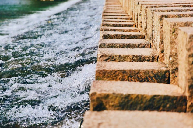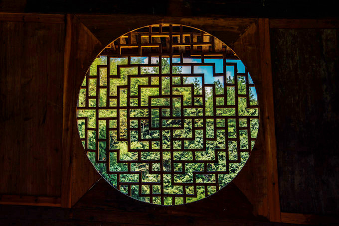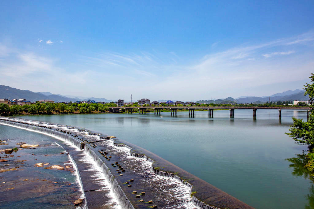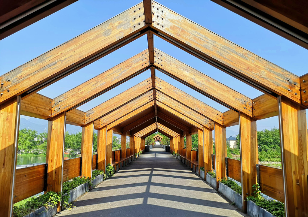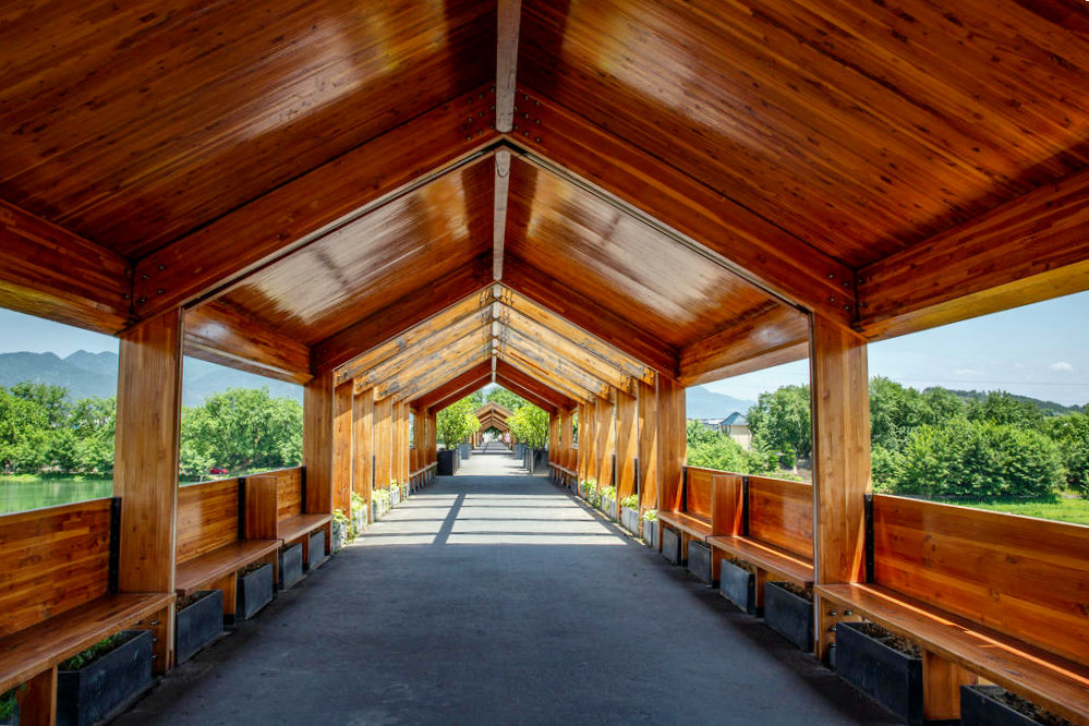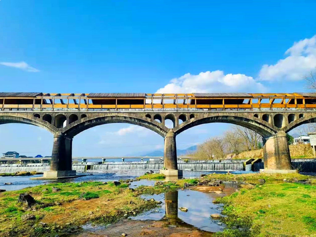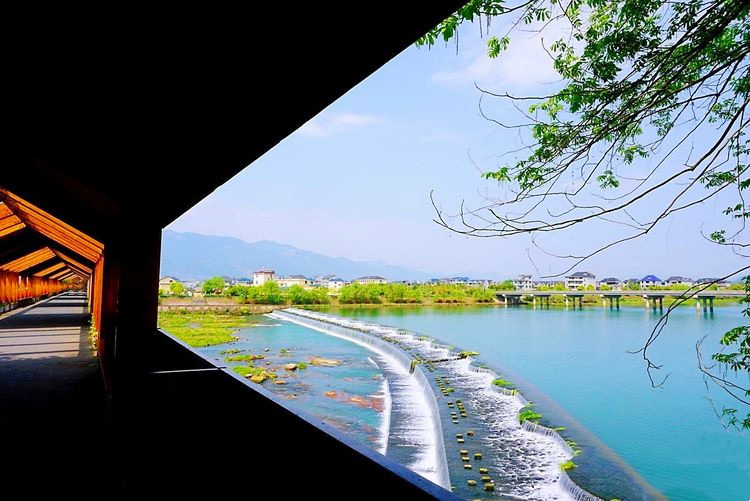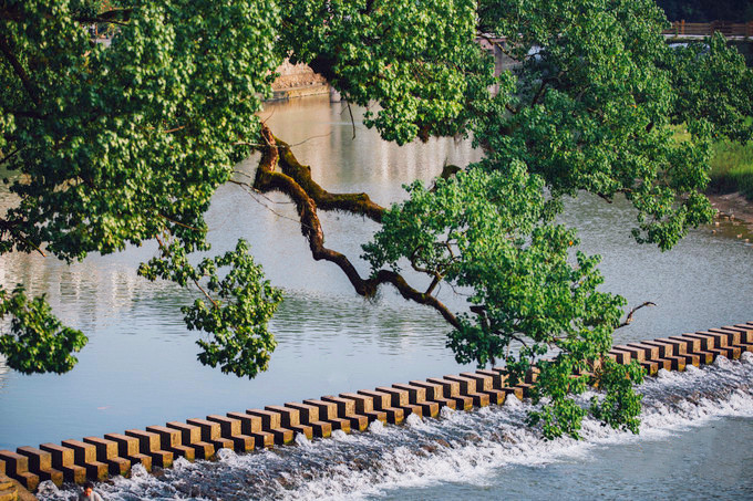 下高速后最先经过的就是石门圩廊桥,廊桥前身是一座混凝土大桥,后几乎废弃,如今被打造成一座木结构廊桥,横跨松阴溪两岸,曾拿下全球照明设计界“奥斯卡”——国际照明设计奖卓越奖。慢慢走过廊桥,桥拱处廊顶有开放,行至其中,光影交错,有着山色水景围屏的幽静,开阔的水面上千年古堰坝午羊堰静卧一侧,堰坝长246米,水流在此为滞,分层而下,蔚为壮观。