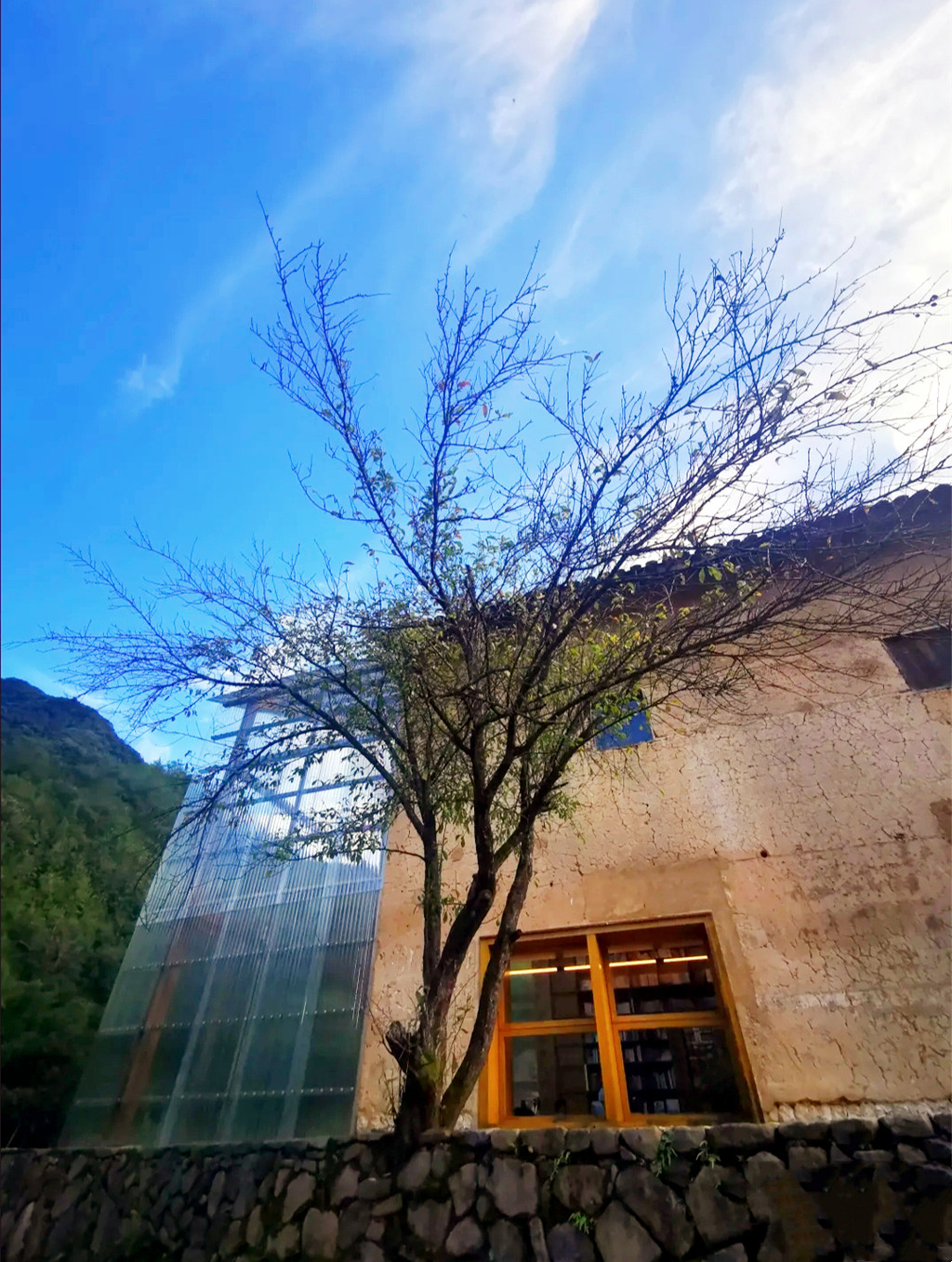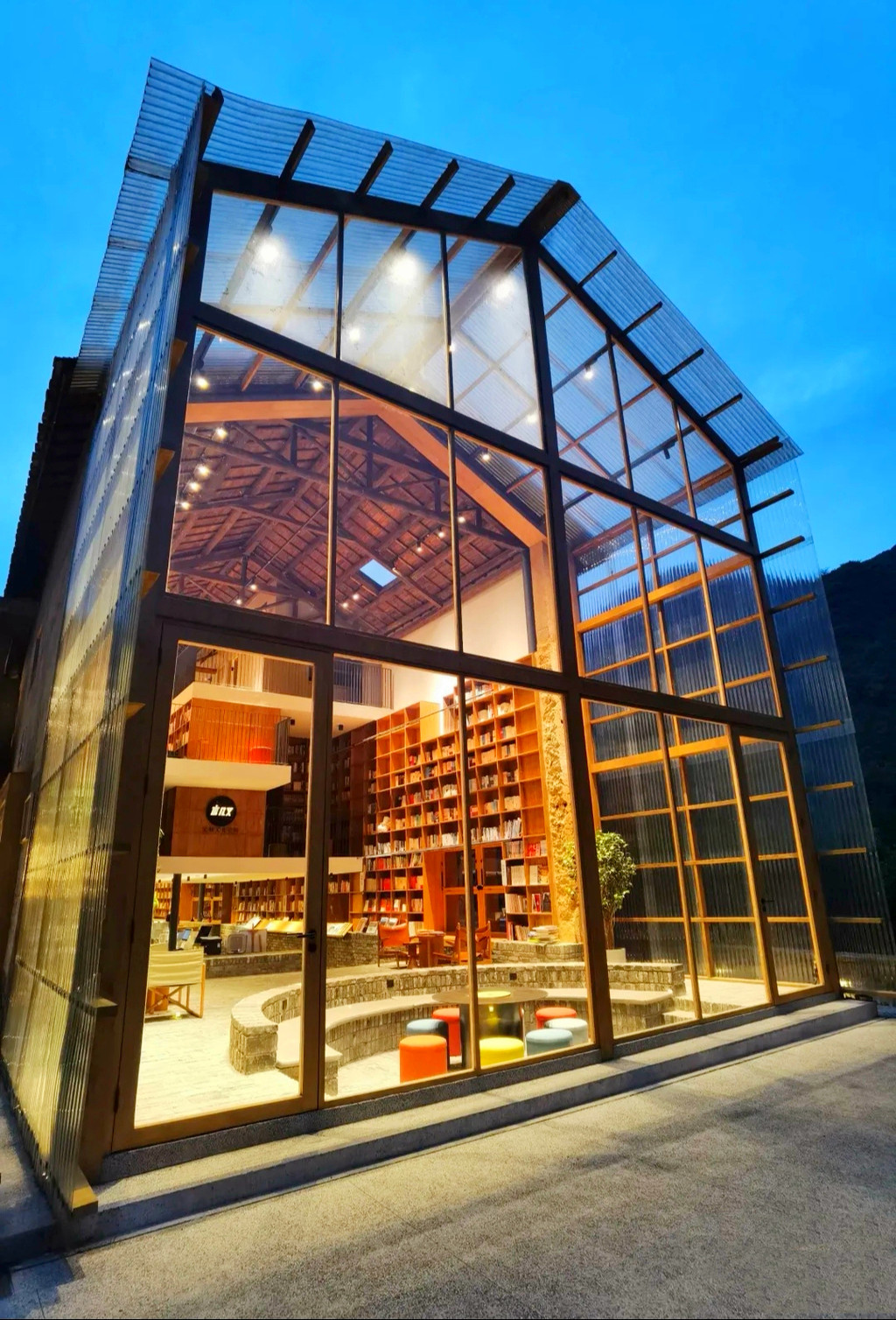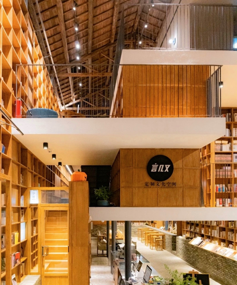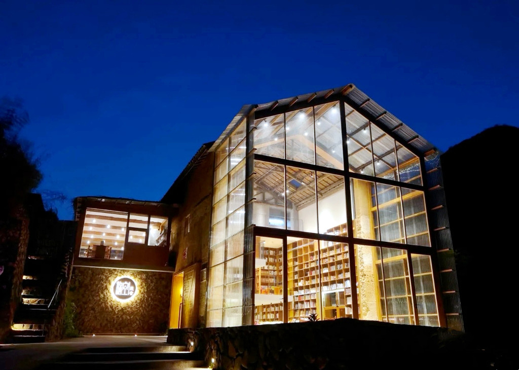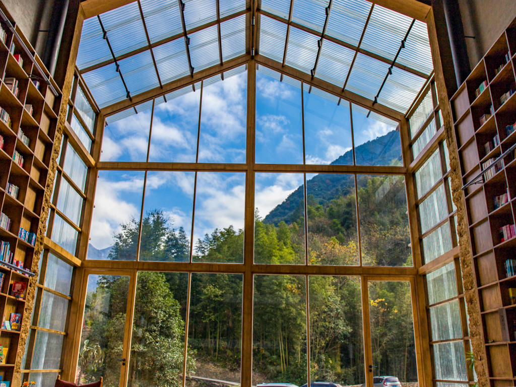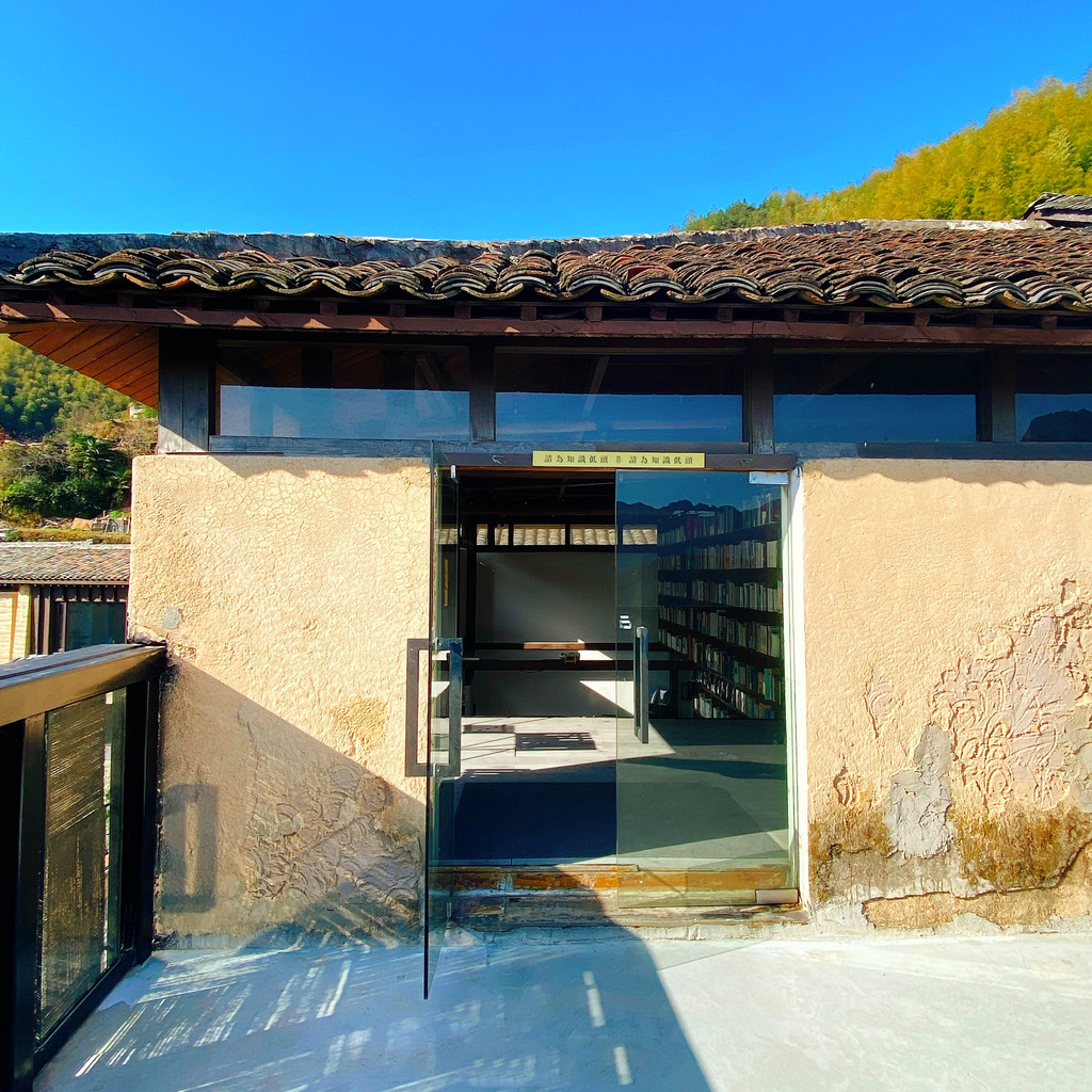 青龙坞还有一个吸引我的就是全国首家尝试book&bed理念的言又几胶囊书店,曾斩获2020建筑界奥斯卡大奖,占地接近300平方米,藏书25000册,由村长家的老屋改造而成,还有一个绝妙的名字——放语空。一边是透明的挑高玻璃幕墙,将青山竹林晕染至室内,当暮色降临时,室内的灯光又透射而出,温存着山村的静夜,另一边依然是村子里惯常的夯土墙,斑驳的痕迹和隐约的标语还能看出老墙与新墙的交叠感。