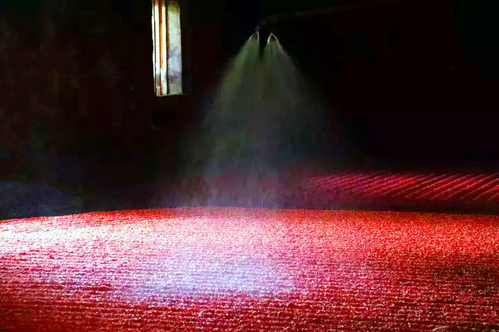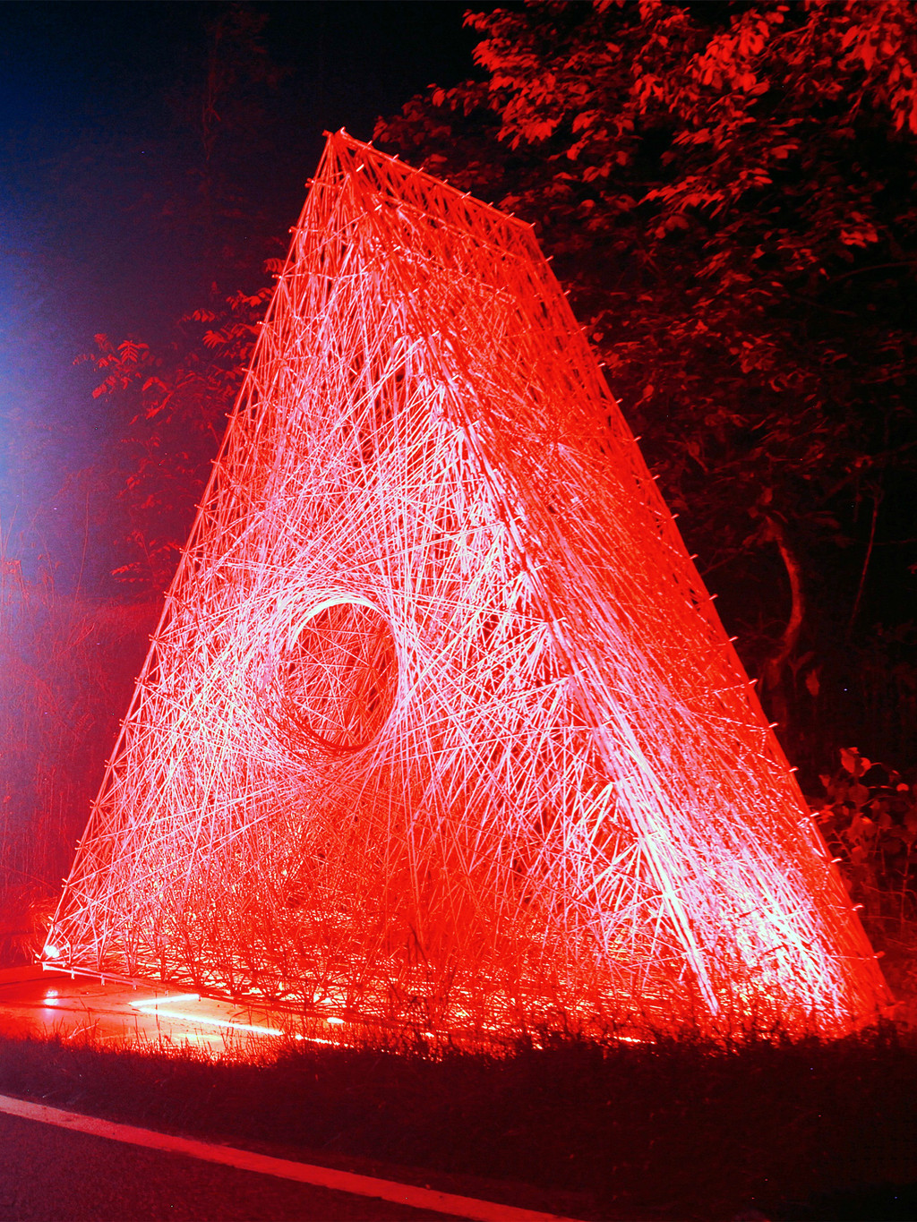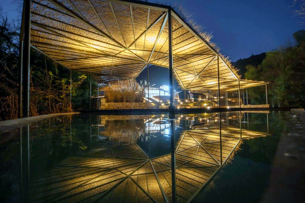 日本建筑师作品云舞台,无数根细竹枝编排成棚顶,如同云朵沿着山势连绵起伏,日光夜灯投射在廊道中,光影变换,融入自然。