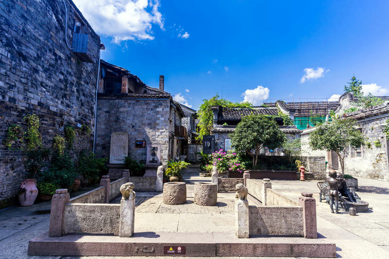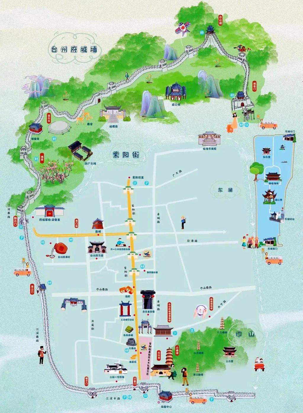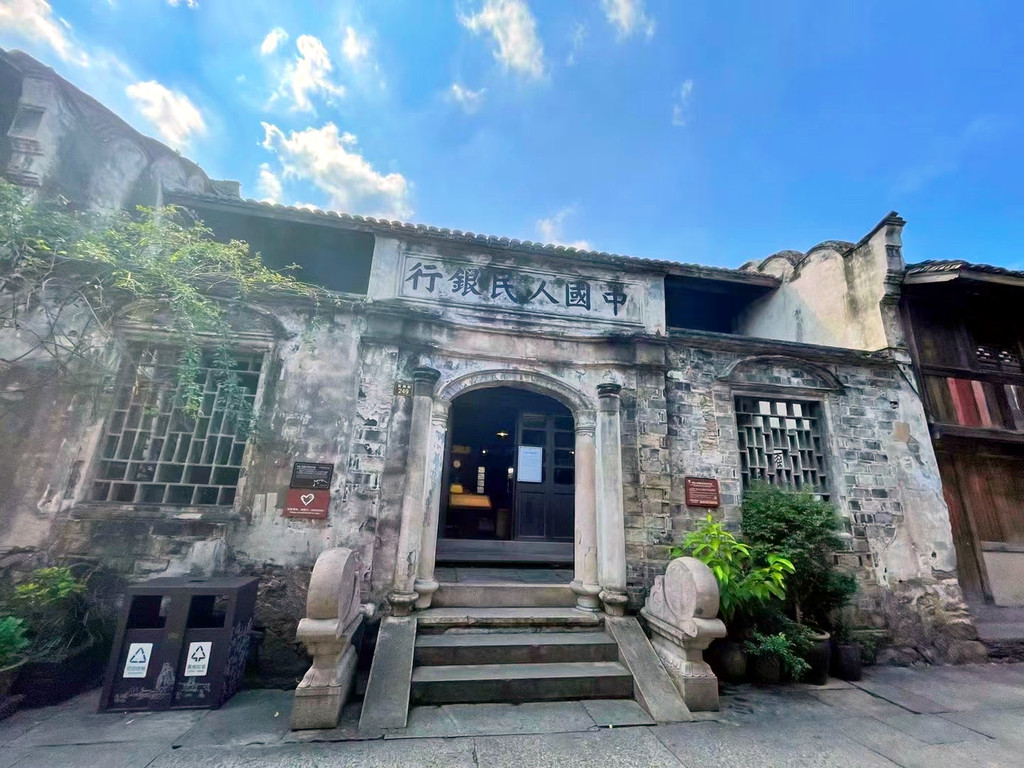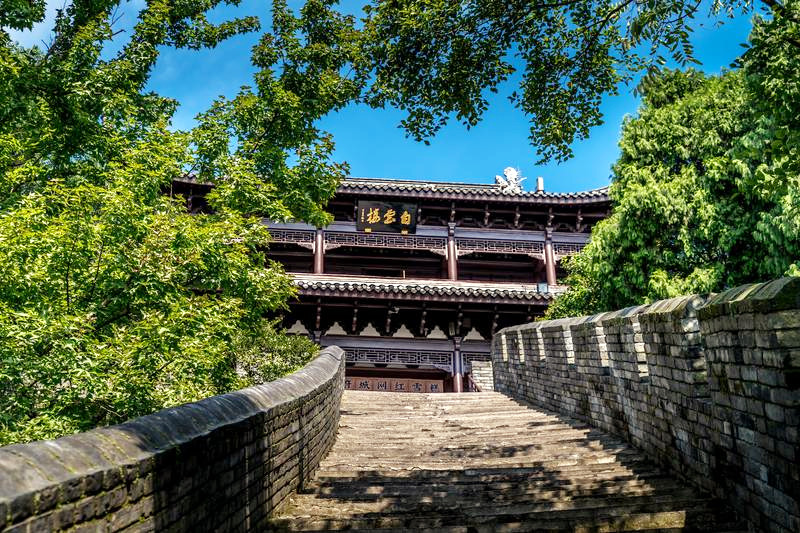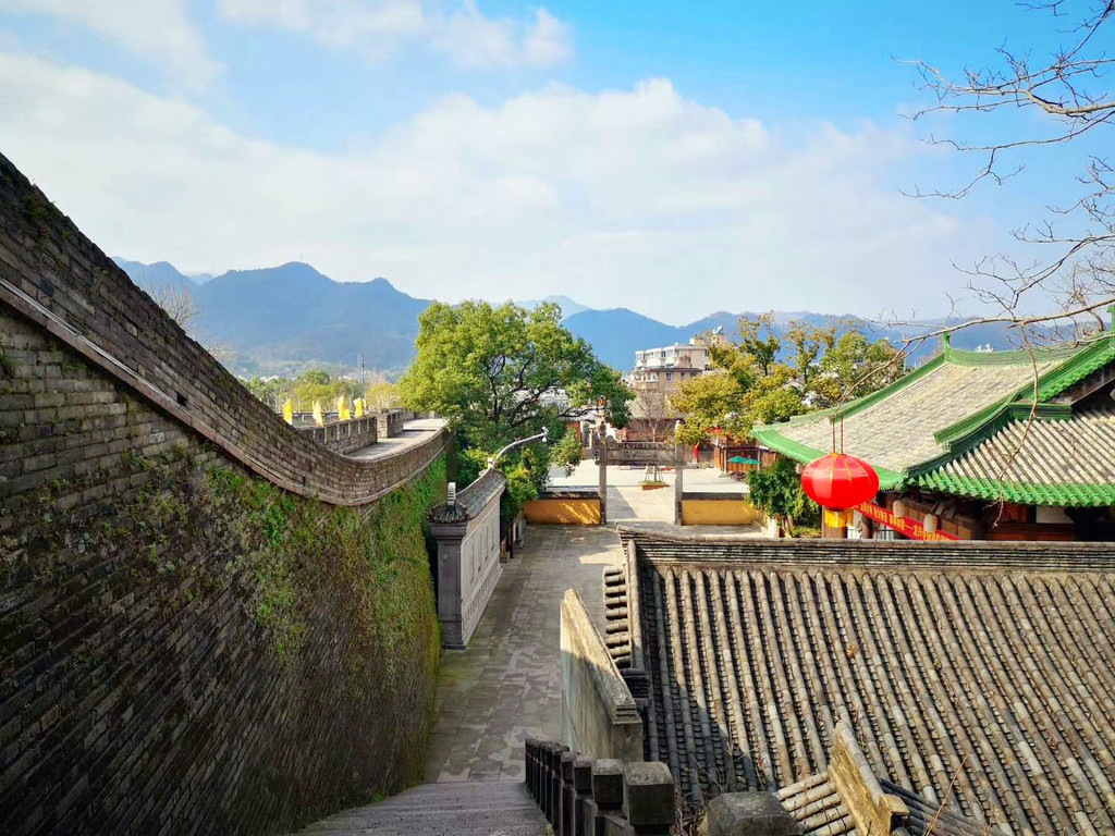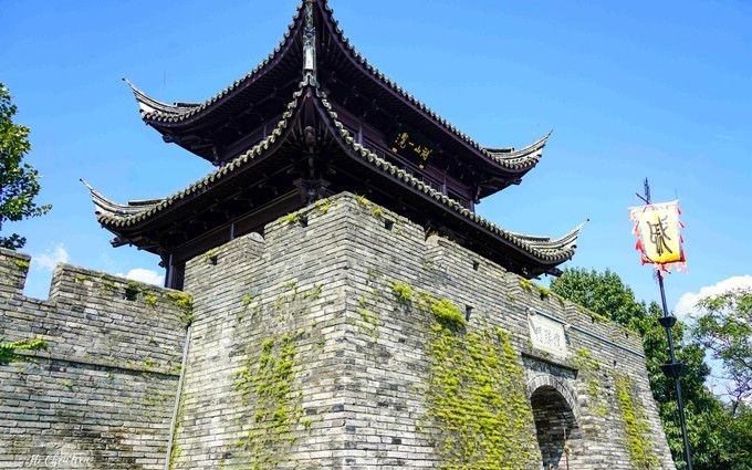 台州府城墙现共存有7座城门,且建有与之相对应的城楼,揽胜门、崇和门、镇宁门、望江门、靖越门、兴善门、朝天门,每扇门后都深藏着古城千秋与今日的国泰民安,从兴善门入城,穿过瓮城,就是紫阳古街,全长1080米,因道教南宗始祖紫阳真人张伯端而得名,成型于唐宋时期,是昔日最繁华的街巷,许多百年传承的老字号店铺都分布在此,房舍和街面仍保留着宋代的遗风和明清的格局,保持了一千多年的烟火气,但2019年的利奇马台风还是重创了这里,古城严重被淹,至今在墙上还能找到牌子,清楚的记录着当年被淹时的水位线已经超过一米八。紫阳街两侧商铺林立,古宅、古建、古井不少,中国人民银行遗址,是台州府城银行业的发源地,四顾巷口的双眼井,据考证历史至少可追溯至乾隆年间,其井壁用阴纹佛像砖砌成,所以有了千佛井的名字,不过漫漫岁月早把佛像磨平了。