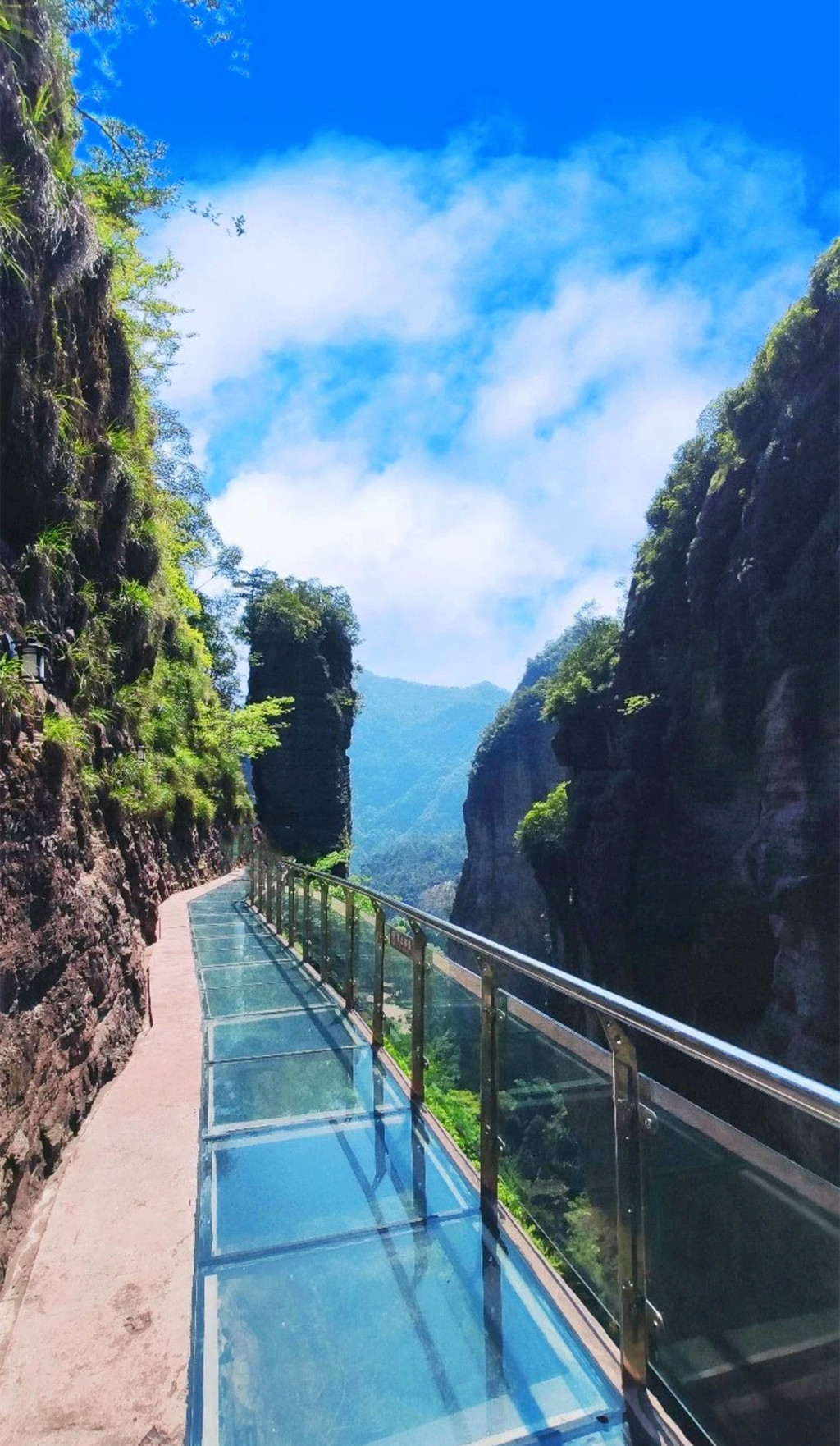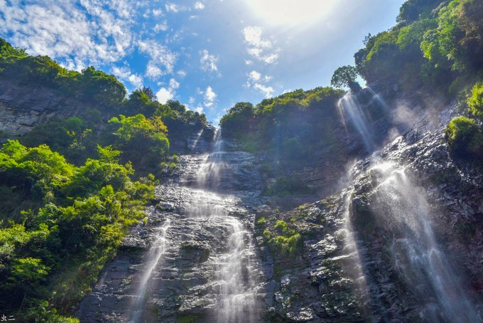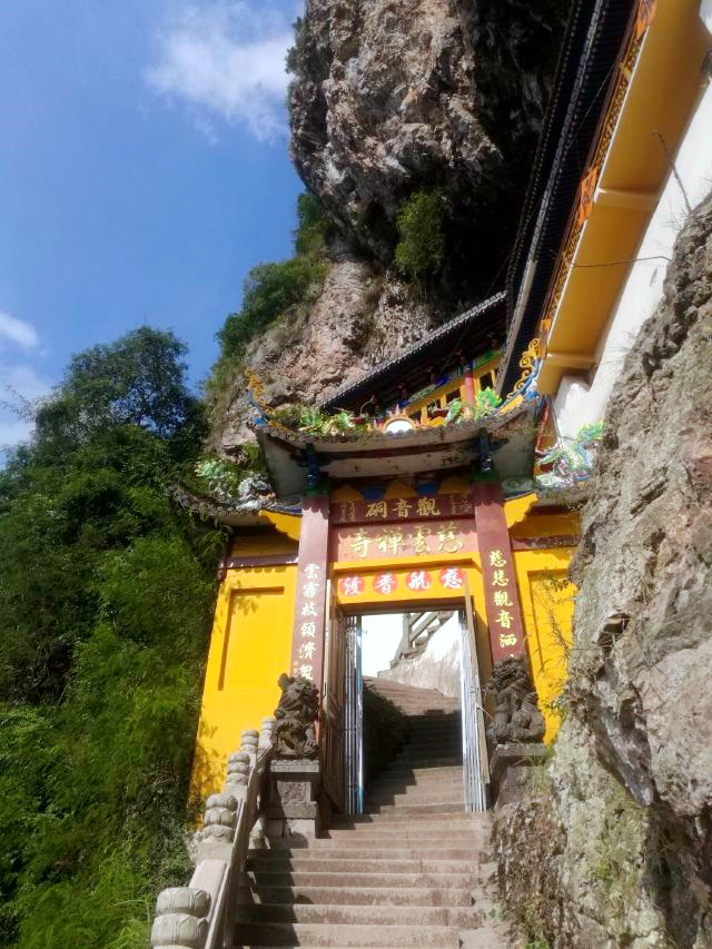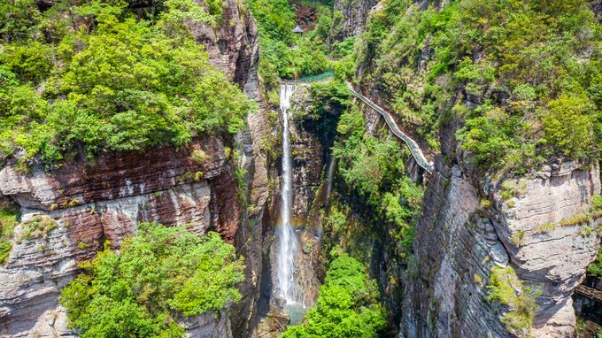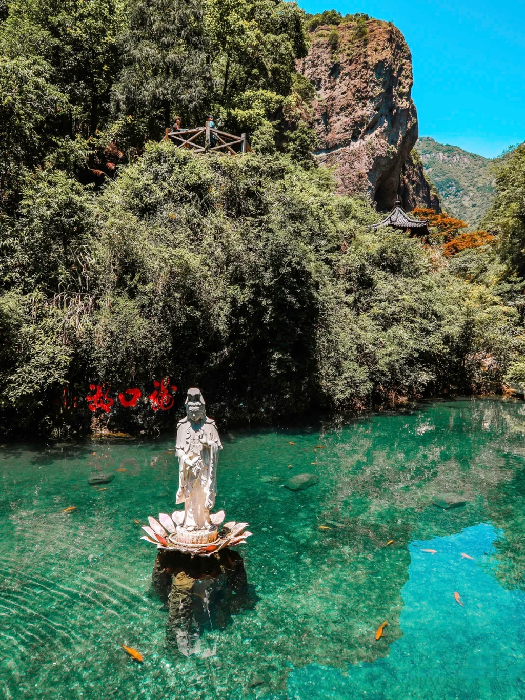 卧龙谷是灵岩又一个王牌景点,山势险峻,群峰耸立,无限风光在险峰,我们沿着悬崖栈道而上,不时有泉水拂过头顶,登至半山腰,出现一条挂在崖壁上的玻璃栈道,行走在玻璃栈道上,还可俯瞰小龙湫的全貌,与“雁荡三绝”之一的大龙湫相比,小龙湫瀑如其名,少了些许壮阔,却多了一丝秀美,珊瑚色的岩壁上,一屡白绸悬于青葱空蒙之间,落差五十多米,瀑形灵动飘逸,触石腾空如溅玉飞珠,飞瀑注入晶莹碧透的潭水之中,溅起的氤氲雾气在阳光的照射下,呈现变幻莫测的瑰丽之姿,更引人入胜的是“断肠崖”,因是张纪中版《神雕侠侣》的外景地而名声大噪,这里悬崖环峙,是小龙女纵身飞跃之地,背后就是龙口湖,湖水泛着幽蓝,观音菩萨立在水中央,安详地保佑着芸芸众生。