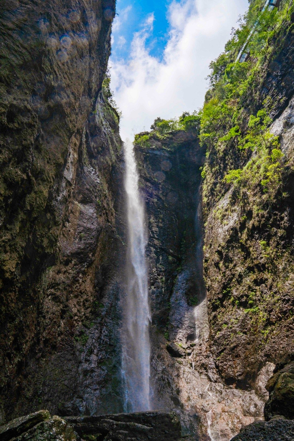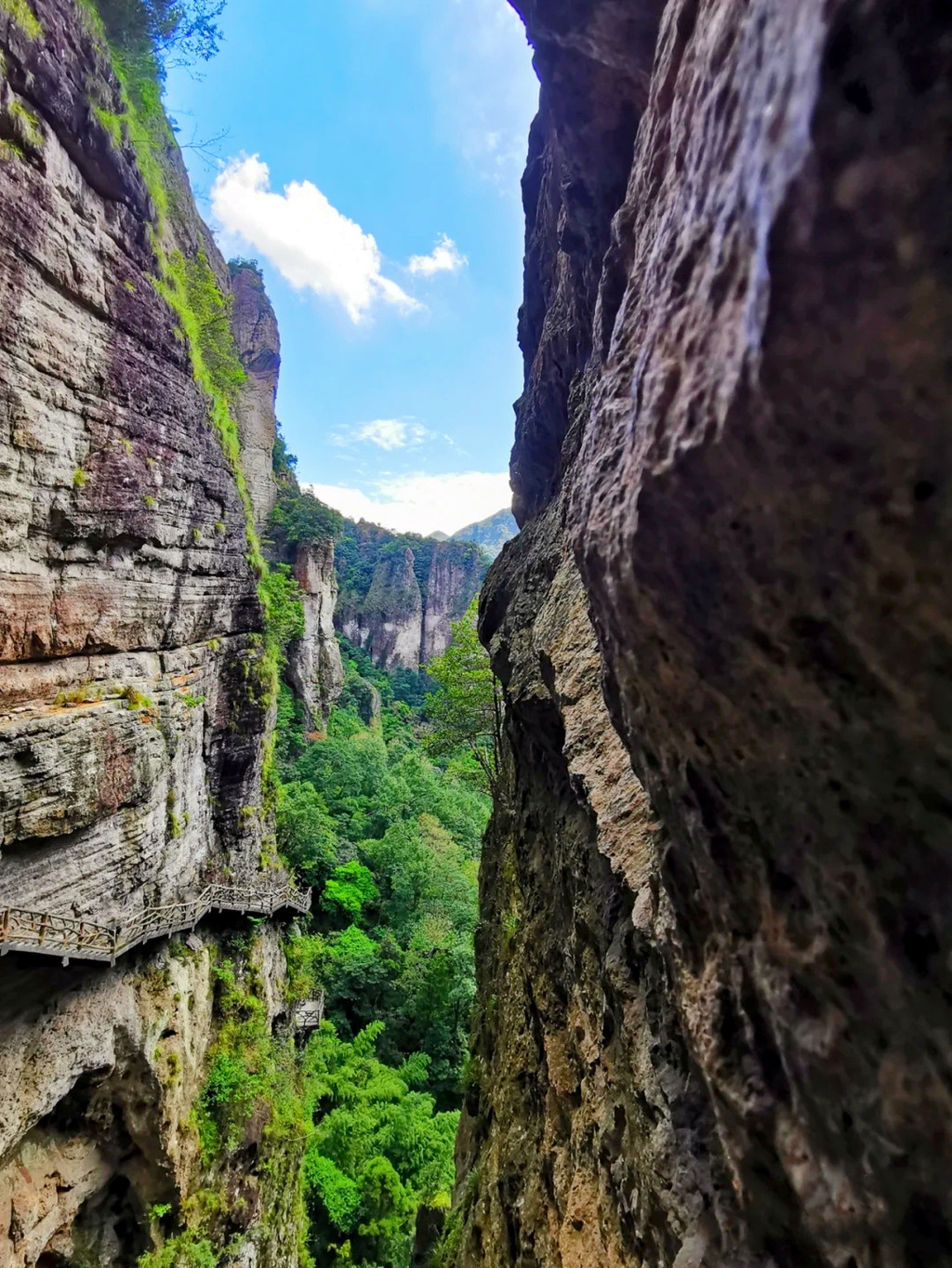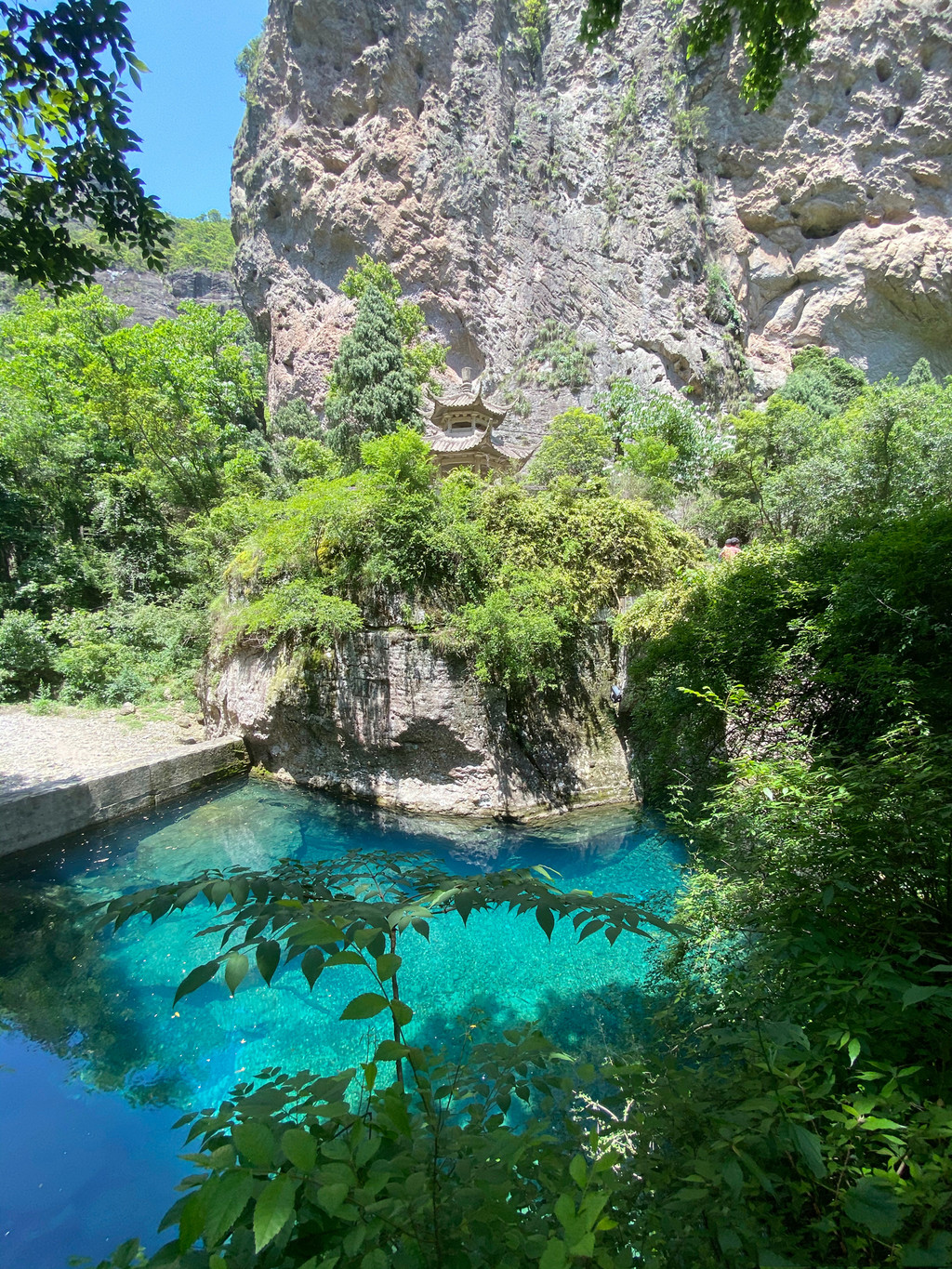 卧龙谷是灵岩又一个王牌景点,山势险峻,群峰耸立,无限风光在险峰,我们沿着悬崖栈道而上,不时有泉水拂过头顶,登至半山腰,出现一条挂在崖壁上的玻璃栈道,行走在玻璃栈道上,还可俯瞰小龙湫的全貌,与“雁荡三绝”之一的大龙湫相比,小龙湫瀑如其名,少了些许壮阔,却多了一丝秀美,珊瑚色的岩壁上,一屡白绸悬于青葱空蒙之间,落差五十多米,瀑形灵动飘逸,触石腾空如溅玉飞珠,飞瀑注入晶莹碧透的潭水之中,溅起的氤氲雾气在阳光的照射下,呈现变幻莫测的瑰丽之姿,更引人入胜的是“断肠崖”,因是张纪中版《神雕侠侣》的外景地而名声大噪,这里悬崖环峙,是小龙女纵身飞跃之地,背后就是龙口湖,湖水泛着幽蓝,观音菩萨立在水中央,安详地保佑着芸芸众生。