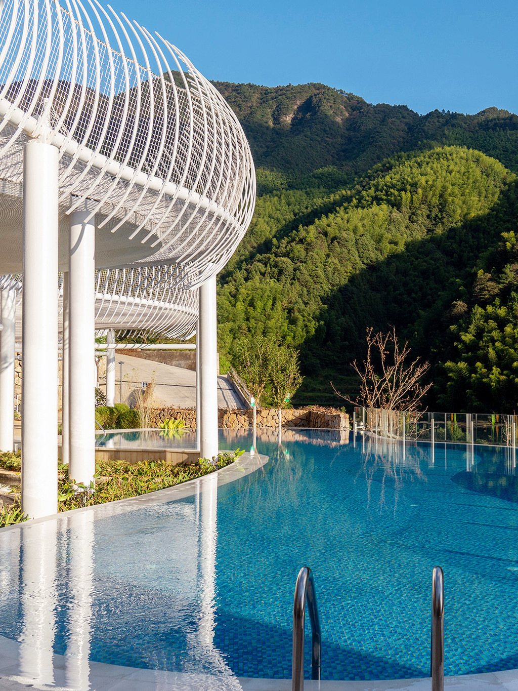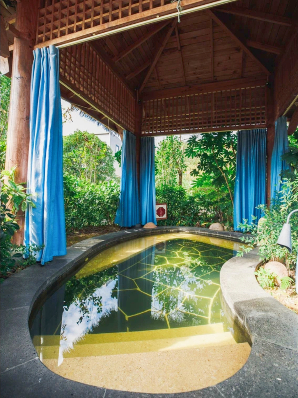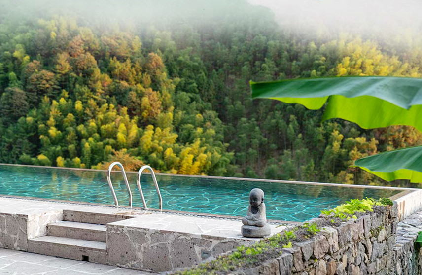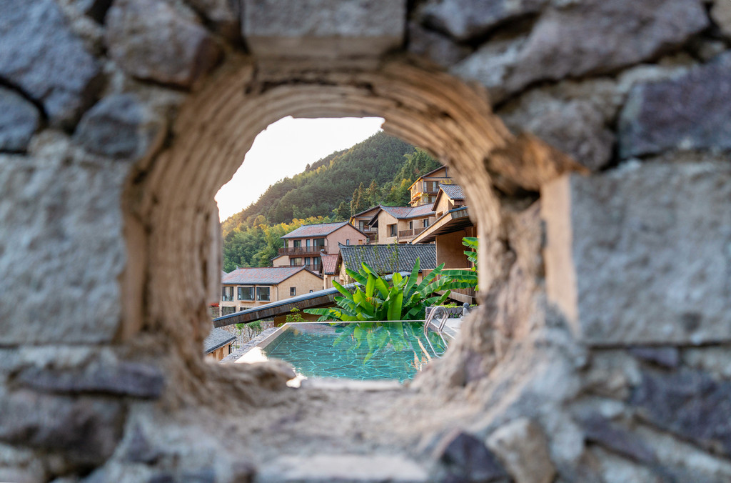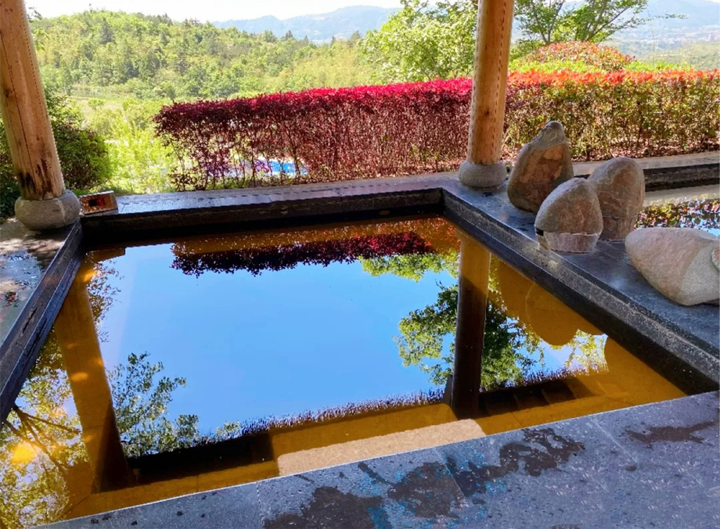 清晨,阳光从窗帘的缝隙间闪出光芒,按下遥控器,拉开温泉汤屋每一扇窗,一幅田园牧歌式的风景映入眼帘,超大落地窗全景玻璃,将屋外美景尽收眼底,宽敞的庭院里绿荫环绕,鸟语花香,起身出门,才发现我们所住的温泉汤屋区域其实跟昨晚的温泉汤池是完全连通的,走几步就又进入了汤池区,清晨的汤池空无一人,和煦的阳光映在每一片水面,登至高处细细打量,无边泳池直面连绵青山的悬崖,山谷中的蒸汽渐渐升腾起来,四周都是云雾缭绕的山野,雾水还挂在树叶上,甚至是在细细的蜘蛛网上,凝成一个个晶莹剔透的水珠,美妙至极,深呼吸山谷里清新的空气,俯瞰着整个温泉,享用一顿丰盛的早餐,又是元气满满的一天。