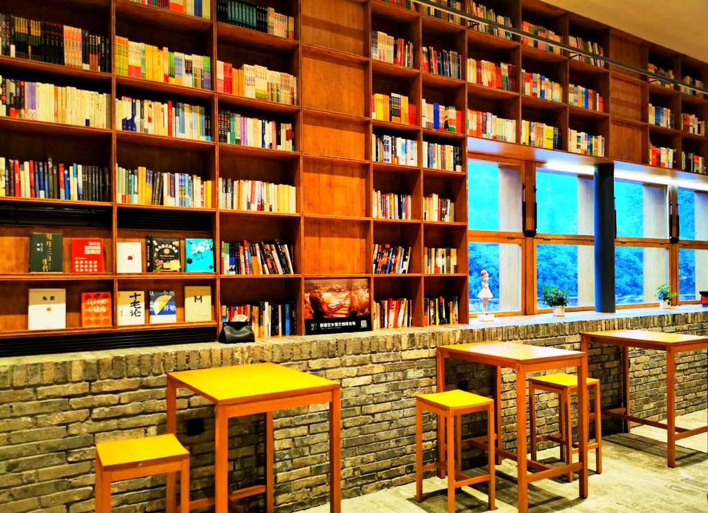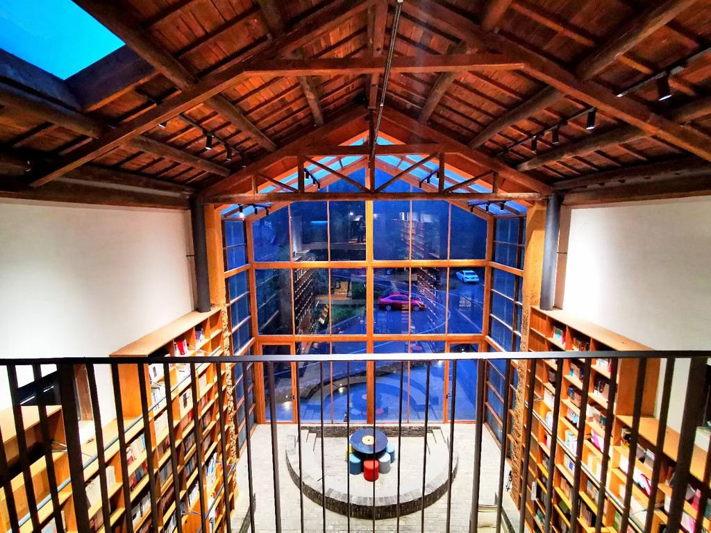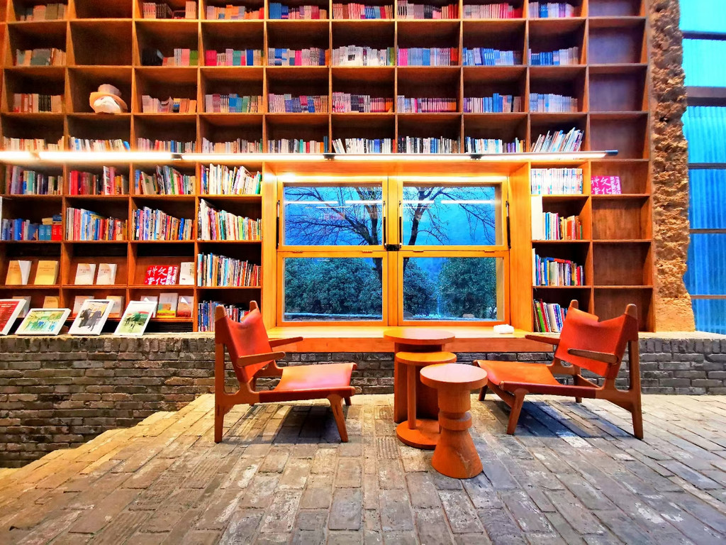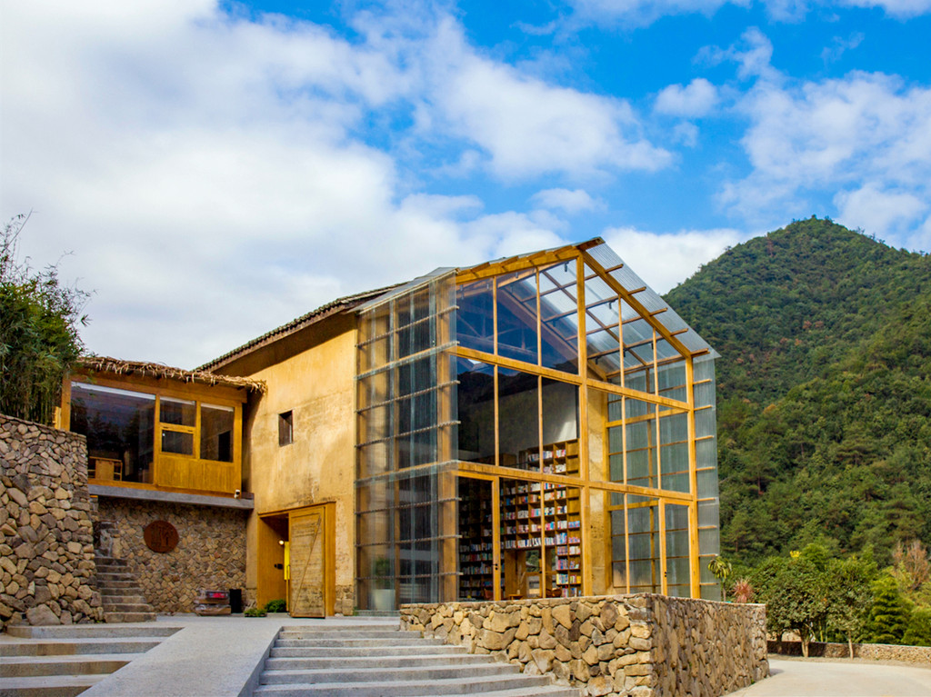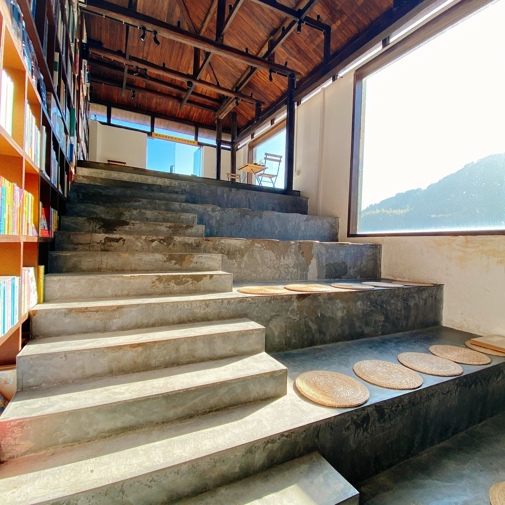 村落里的先锋书店陈家铺平民书局可谓闻名遐迩,书局所在建筑是陈家铺文化礼堂旧址,居于整个村子的核心位置,是山崖上的一颗明珠,是崖上之巅的乌托邦。经过书店中央一排排高至房梁的书架,就到了西面宽大的阶梯,这里是书局的“点睛之笔”,书架边是通往二楼的真正台阶,就如直白“书籍是人类通往智慧的阶梯”,连在一起的另一半阶梯设计出层层平台,随意摆放着草垫子,大家可以坐在上面,沐浴在阳光下翻阅书籍,几面巨大的玻璃窗,更是成为书店的一道靓丽风景,看景时,窗处风景似在画框之中,看人时,人似在画中灵动,或捧读一本好书,或品茗一杯醇咖,或静坐冥想神游于山海,或眺望远山拥抱清风……无论怎样的方式,选择自己喜欢的,不紧不慢,享受这一刻属于自己的空间,二楼露台门框上一句“请为知识低头”又让大家忍俊不禁。
