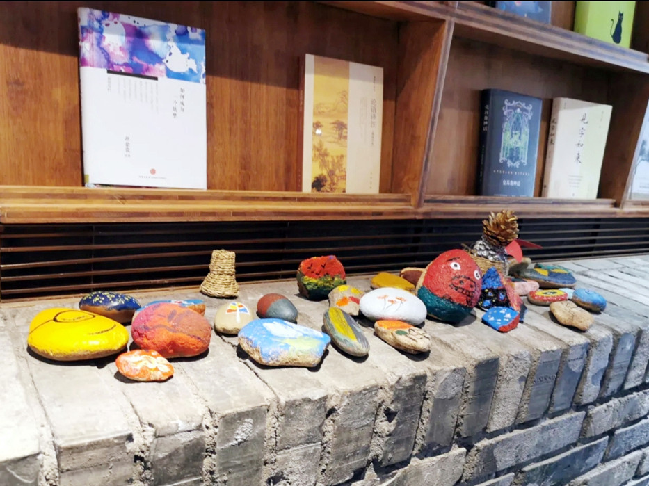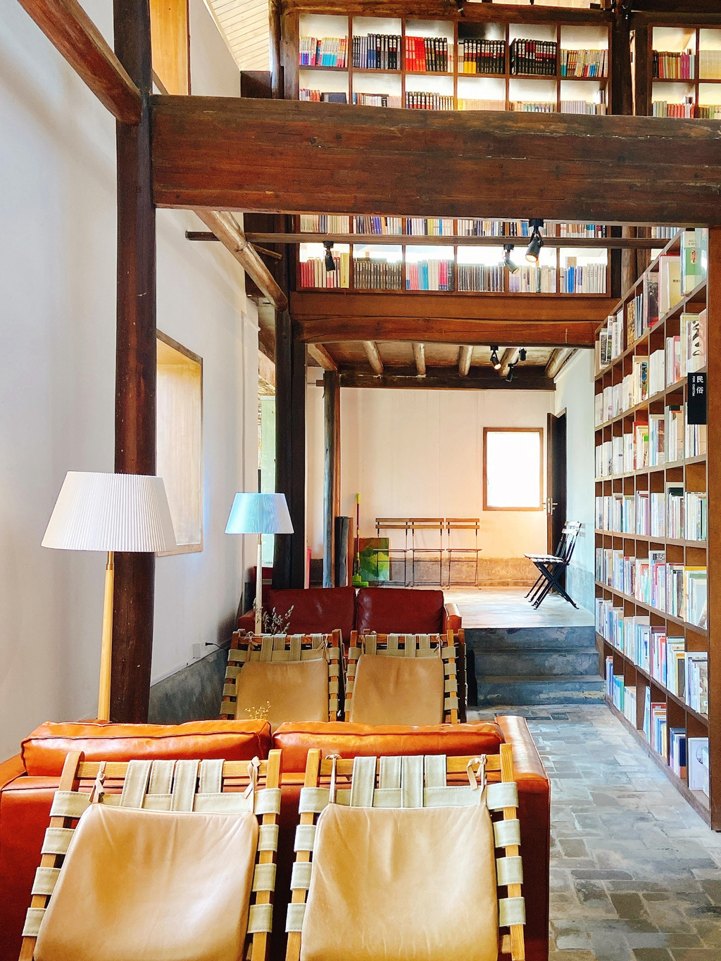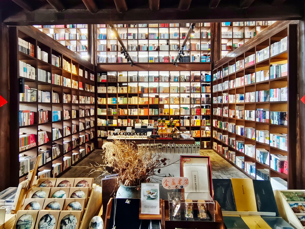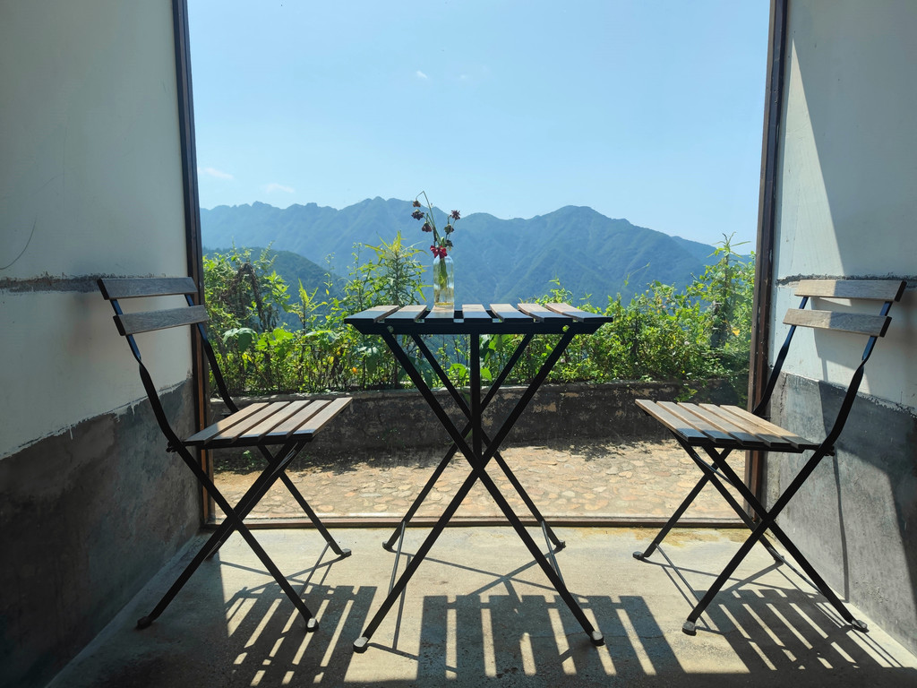 村落里的先锋书店陈家铺平民书局可谓闻名遐迩,书局所在建筑是陈家铺文化礼堂旧址,居于整个村子的核心位置,是山崖上的一颗明珠,是崖上之巅的乌托邦。经过书店中央一排排高至房梁的书架,就到了西面宽大的阶梯,这里是书局的“点睛之笔”,书架边是通往二楼的真正台阶,就如直白“书籍是人类通往智慧的阶梯”,连在一起的另一半阶梯设计出层层平台,随意摆放着草垫子,大家可以坐在上面,沐浴在阳光下翻阅书籍,几面巨大的玻璃窗,更是成为书店的一道靓丽风景,看景时,窗处风景似在画框之中,看人时,人似在画中灵动,或捧读一本好书,或品茗一杯醇咖,或静坐冥想神游于山海,或眺望远山拥抱清风……无论怎样的方式,选择自己喜欢的,不紧不慢,享受这一刻属于自己的空间,二楼露台门框上一句“请为知识低头”又让大家忍俊不禁。