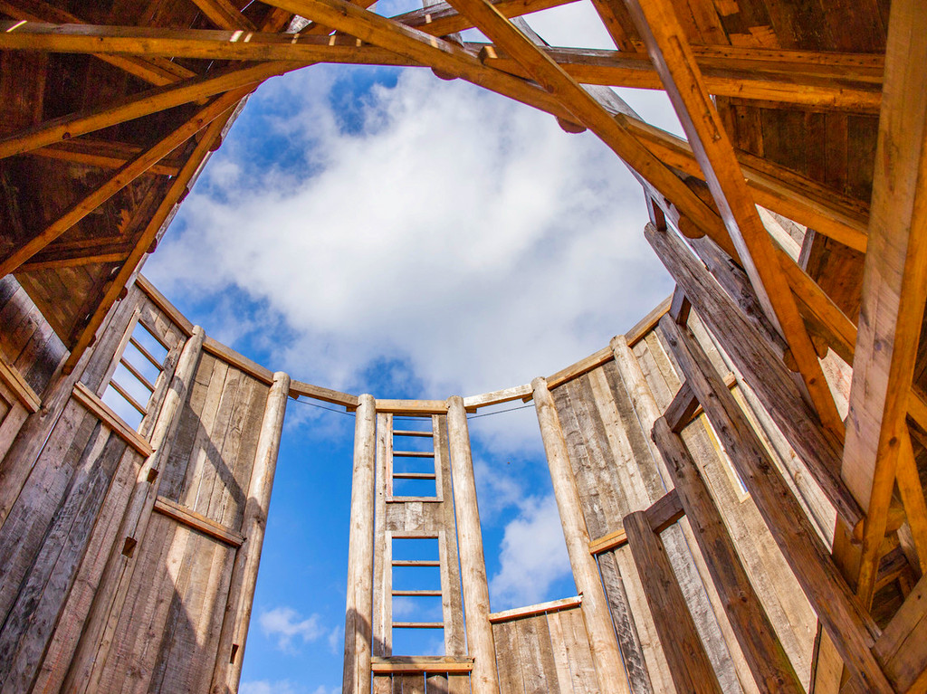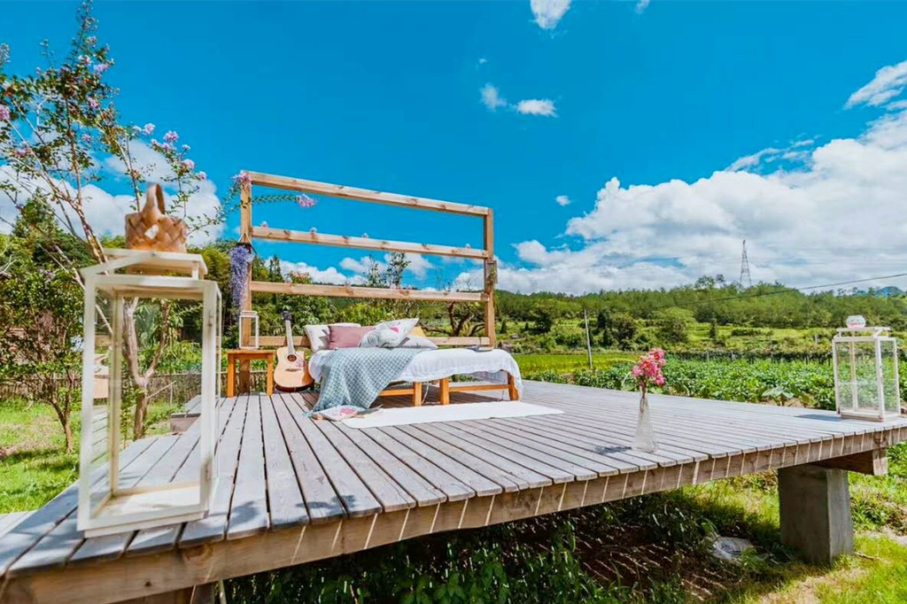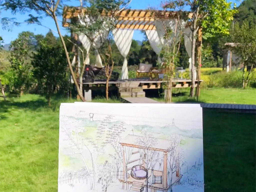 清晨沿着青龙坞主路散步,寻找放语空文创综合体的其他艺术作品,结缘堂、瞭望塔、云舞台等都在其中,同时世界级的艺术盛典——北川富朗担任总策划的“大地艺术节”也即将落地于此。香港建筑师作品暸望塔,材料来自于云南昭通县一所废旧的房子拆下的木制部件,重新设计改造成塔参加第16届威尼斯国际建筑双年展,现在又来到了青龙坞,伫立在花田野地里,焕发出新的活力。