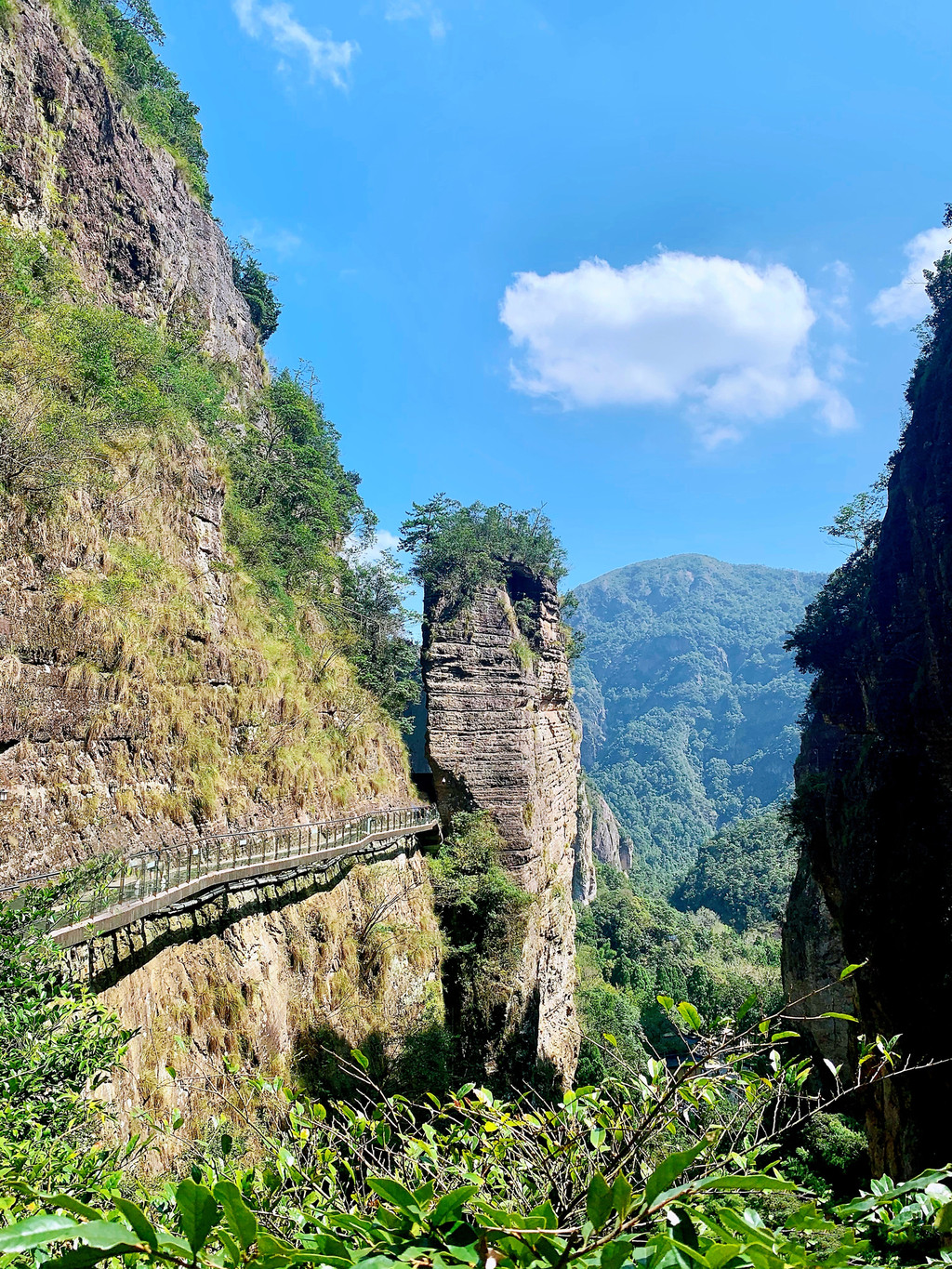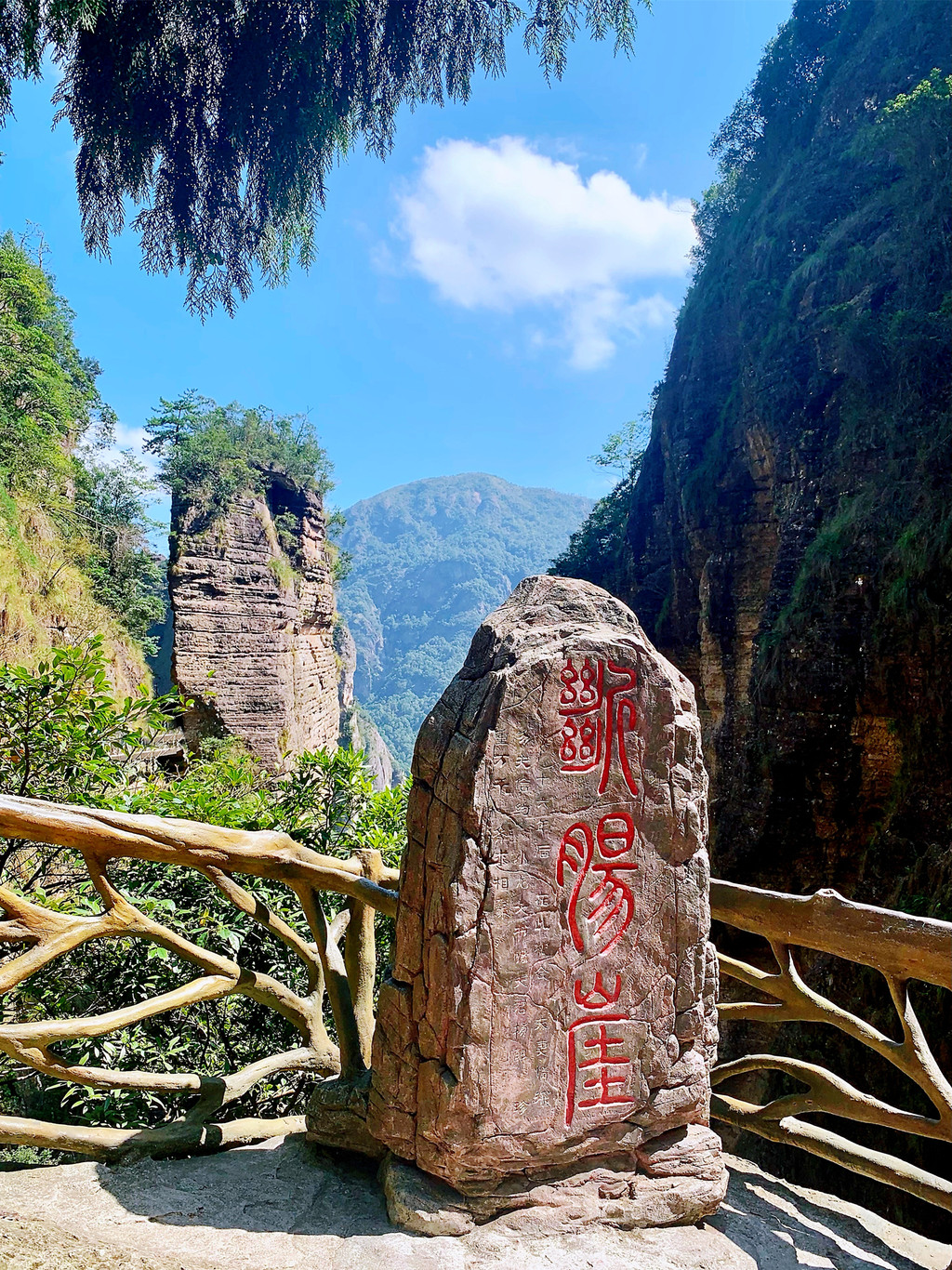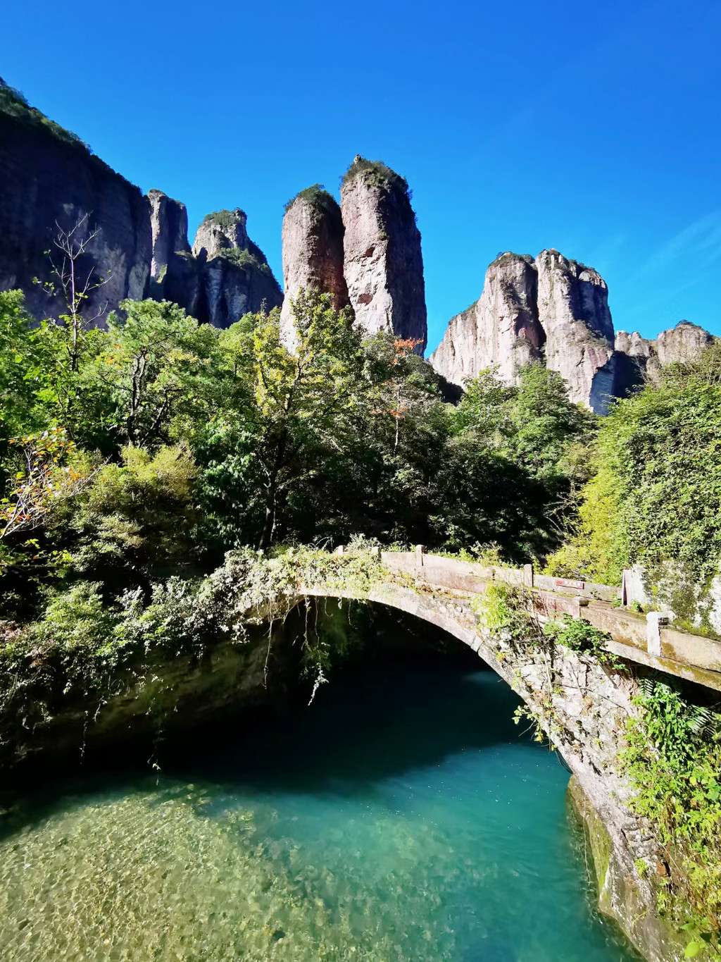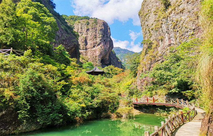 灵峰(门票45元/人)是雁荡山的东大门,峰、嶂、涧、瀑、庵、亭、桥、坊应有尽有,走进景区,仿佛进入仙侠领地,美得自带傲骨侠气,中央是一条蜿蜒的山谷曰“鸣玉溪”,溪上最著名的一座布满青苔的古桥叫“果盒桥”,此桥始建于清光绪廿八年(公元1902年),桥下一凝碧潭,清澈见底,果盒桥的旁边,还有果盒岩、果盒亭,人称“果盒”三景,在众多国产古装仙侠剧中屡屡出镜,碧水拱桥,藤蔓缠绕,在电视剧里,周边都是高大威武的巨石山峰,怎么看都是山门重地,有着一夫当关、万夫莫开的气势。