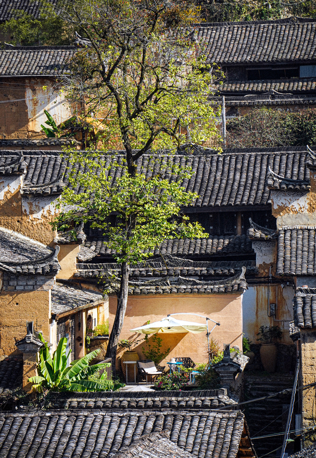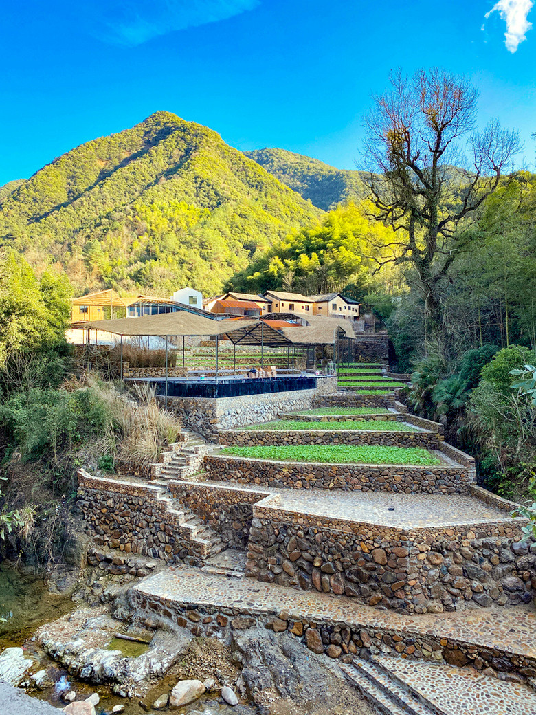 路过茶田和水库,穿过一座千年石桥,完成看似颇具仪式感的修仙之路,就到达今天入住的原舍揽树,前身是榔树古村,繁盛时曾有181户人家居住,后变成荒芜不堪的空心村,直到原舍揽树在山林间重新亮起灯火,构筑出一片山居乌托邦,还被评为了“2019年全球十大必睡民宿之一”。民宿依着山势一层层错落分布,山林与云海,梯台与乡舍,夯土与青瓦,无需多余装饰,就能营造出精致而禅意的山房空间,高达100米的落差让几乎所有房间都能把绵延山景尽收眼底,山里的云雾变化无常,你永远猜不透它们下一秒是什么样子,窗户打开,云就悄悄溜进来,超大落地玻璃窗外就是整幅无框山野画卷,感觉睡在顶级云景之中,仙气飘飘,揽树的邻居,不仅有云海和山林,还有20多棵两三百岁的古树,粗壮的枝干,亭亭如盖的树荫,都是时间的见证。