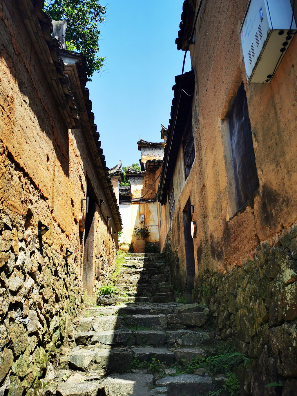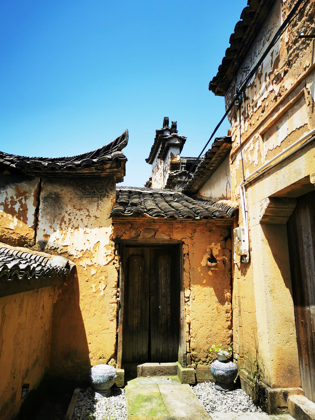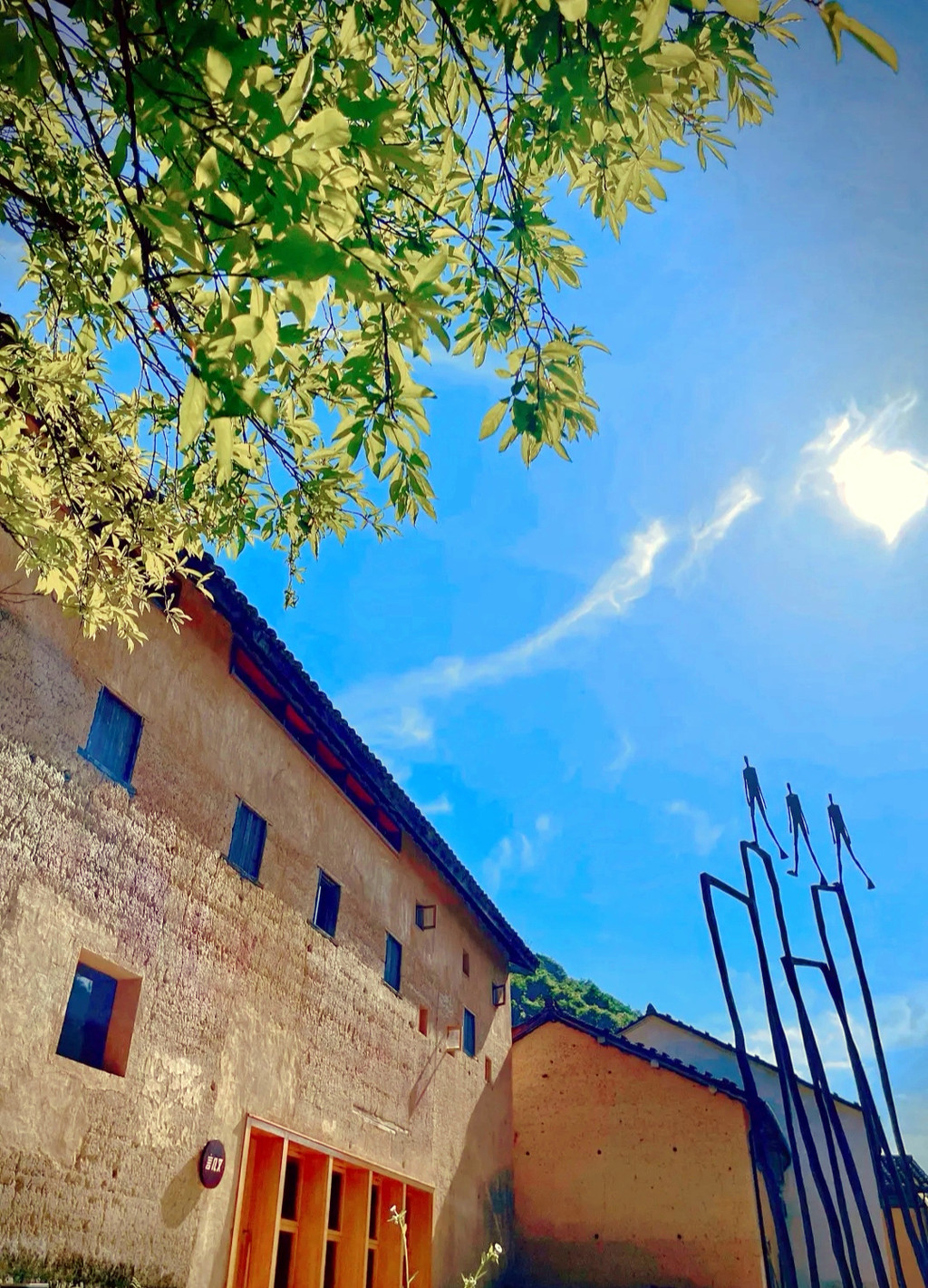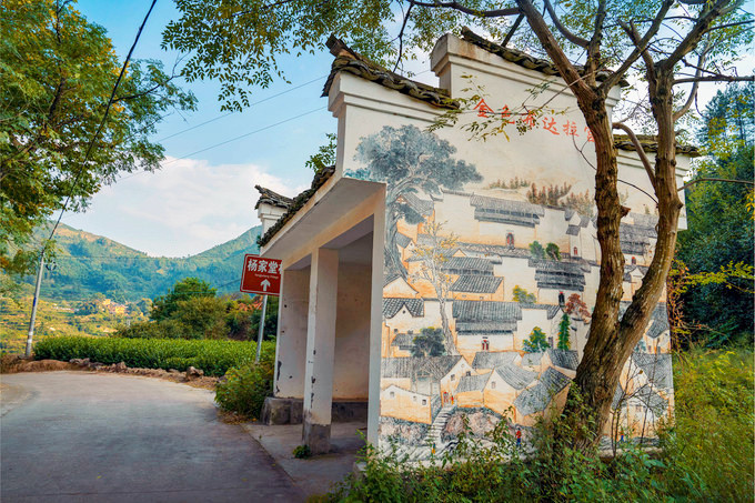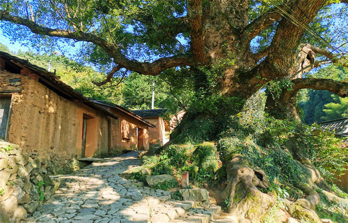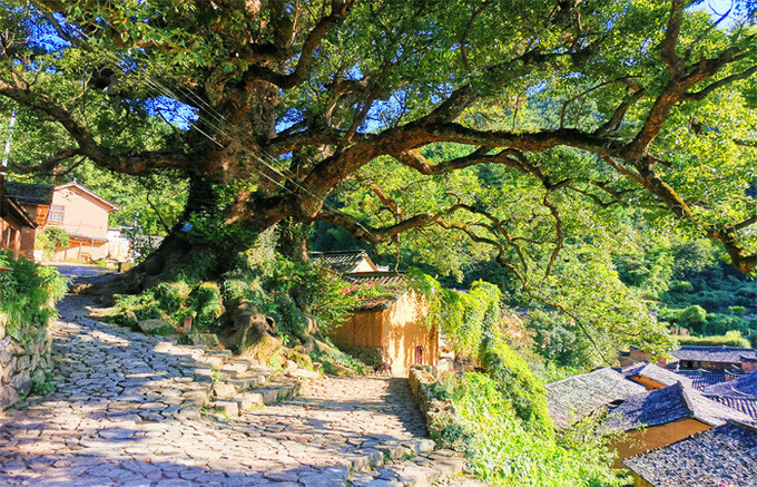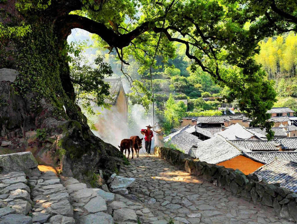 走进杨家堂,迎面是两棵枝繁叶茂的的古樟,拥有1200多年的历史,盘根交错,树冠擎天,一根根强壮的树枝向村庄伸展开来,像一把巨伞为人们遮风挡雨,当地人称“夫妻树”,加上坡口另一棵樟树,三樟辉映,千百年来历尽风霜依然迎风挺立,默默地守护着这一片土地,成为古村的灵魂,在抖音中经常能刷到:斑驳的阳光下,身穿蓑衣的农夫一手牵着耕牛,后面跟着只土狗,在烟雾弥漫的景象下行走在古樟树下,那是给都市人营造的一个梦境,虚幻又真实,一不小心就会深陷其中,着了它的迷。
