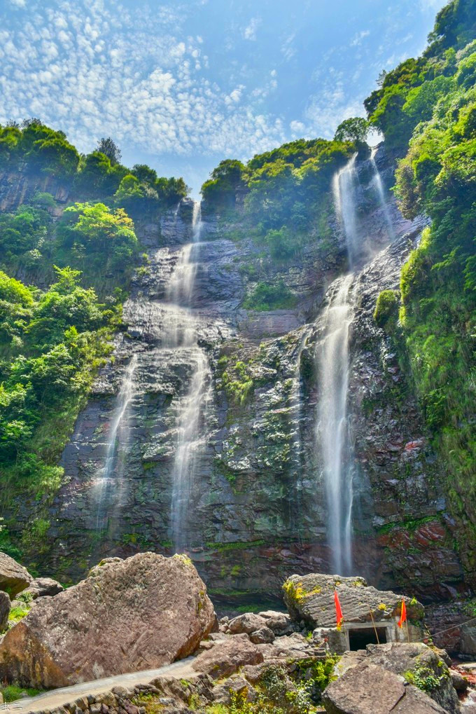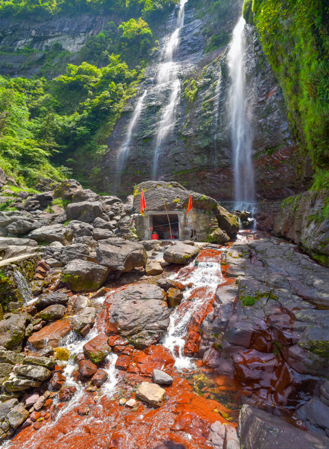 经过红岩隧道时顺便看看洞口的红岩双瀑,有专门给前往观赏的行人设置停车场。丹霞地貌的红岩崖壁,上游两条溪涧在山顶并行,一起跃下高约60米的悬崖,瀑布冲击着底下的巨石,水量大时,两条瀑布下方还会合二为一,这里又称“夫妻瀑”,相传是一对畲族青年为了忠贞的爱情在此纵身一跃。