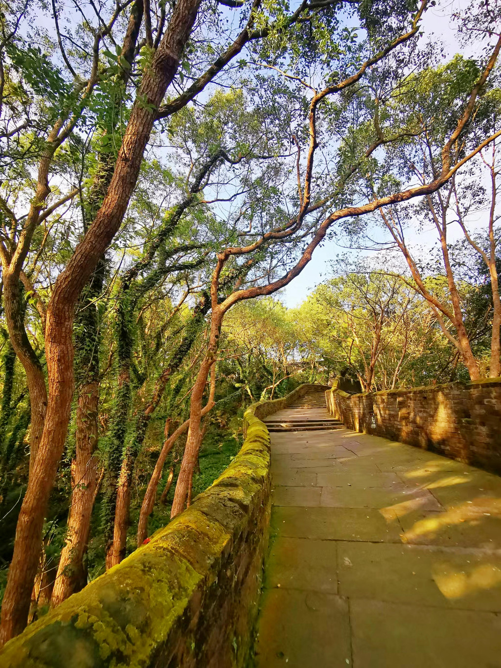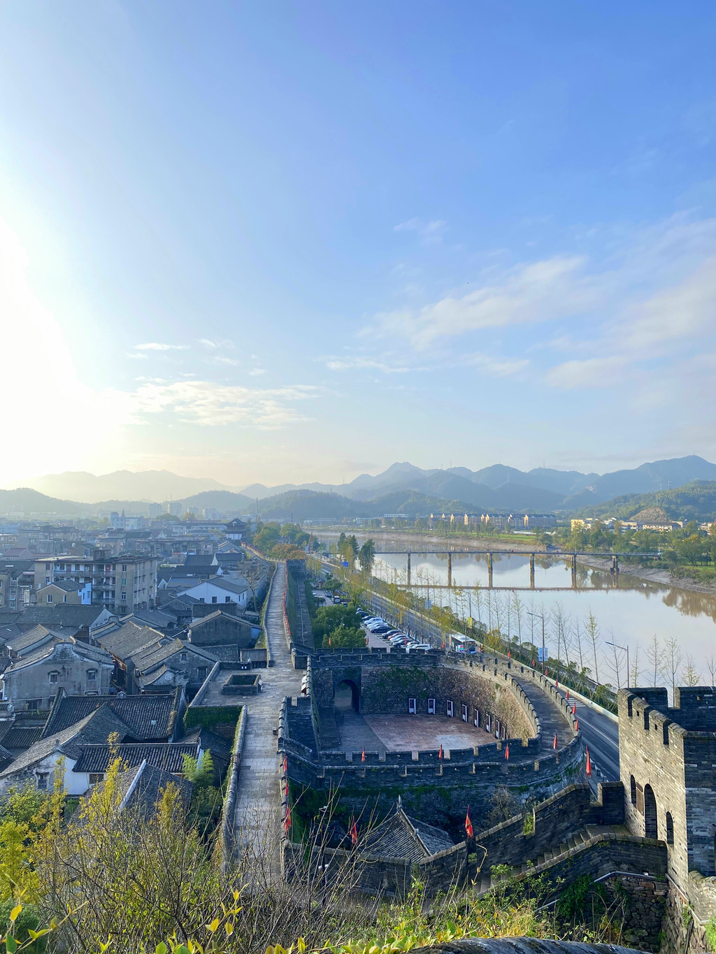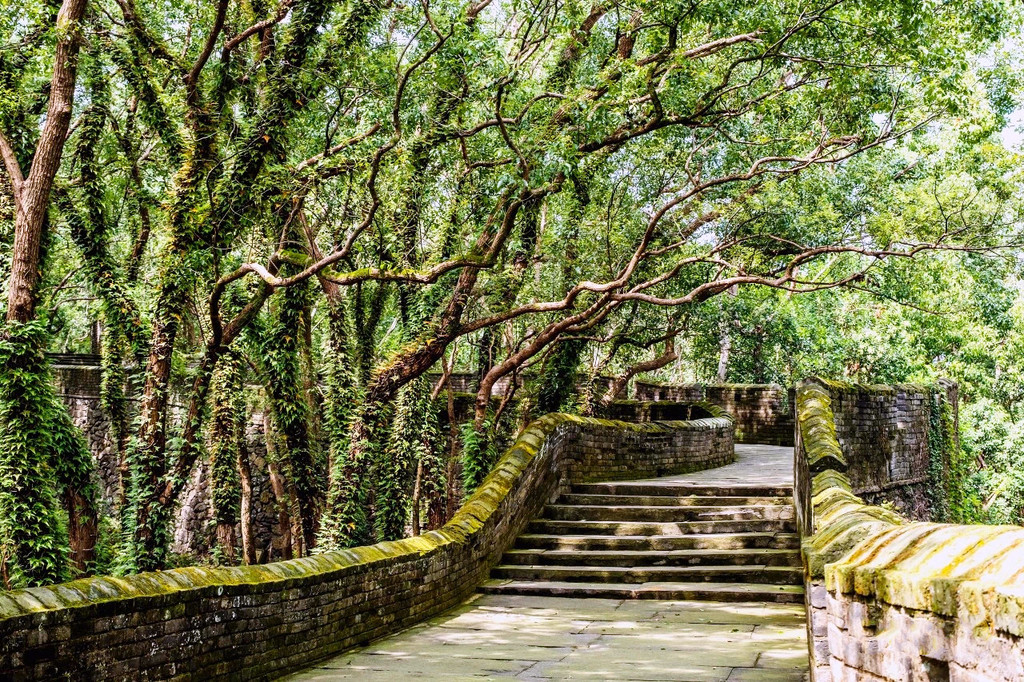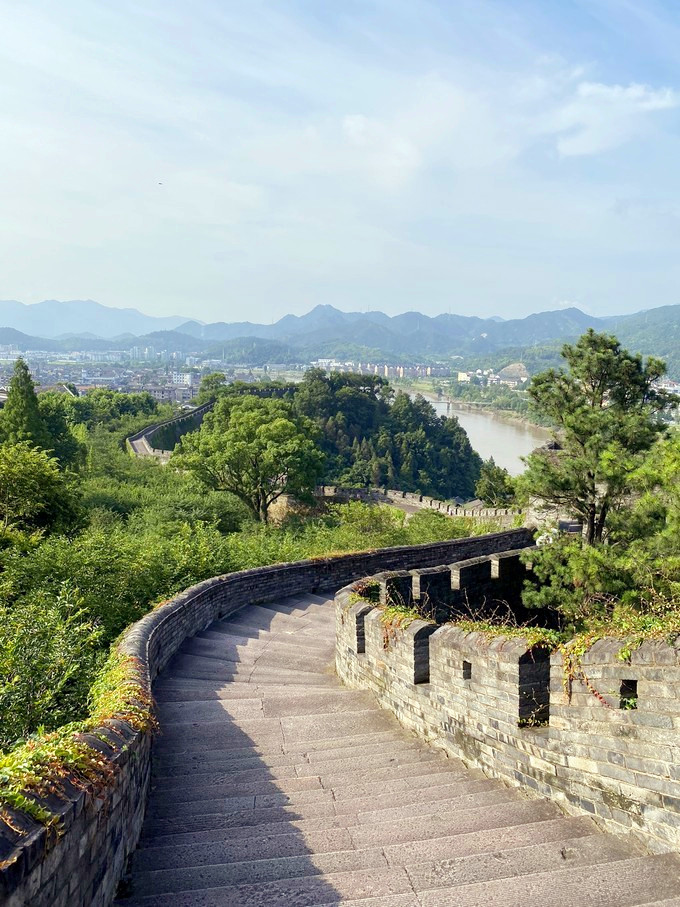 清晨被朋友轻声唤醒,七点前可以免费登上城墙,从兴善门上,到揽胜门下,七大城门将长城连贯,沿长城走完全程,耗时2小时,这段路程前期平坦,两米宽的石砖一马平川,墙内几栋徽派建筑的马头墙探出身影,后期多上下陡坡,太阳也是从身后慢慢爬上头顶,又很快赶超到前面,从健步如飞到气喘如牛,仿佛看到了一个王朝从盛而艰的过程,不时迎面遇见早锻炼的老人们,在安静的城墙上偶尔还和着收音机引吭高歌几句,让这份安静变得更为祥和。朝天门外筑有别具一格的瓮城,瓮城里有回声荡漾,城墙两侧苍翠古木参天,城墙掩映在青绿丛中,更增添了一分江南的灵秀,城墙的砖缝里和墙边的古树干上都长满了青苔,让千年的古长城更具年代感,朝天门附近的这段长城线条最美,它从北固山逶迤而下,在茂密的植被间左突右进,迎向远处的灵江,可以将蜿蜒的长城与敌台、最高处的烟霞阁和背后的重峦叠嶂同时摄入镜头,沿途还能看到不少炮台、盔甲、兵器等的展示。