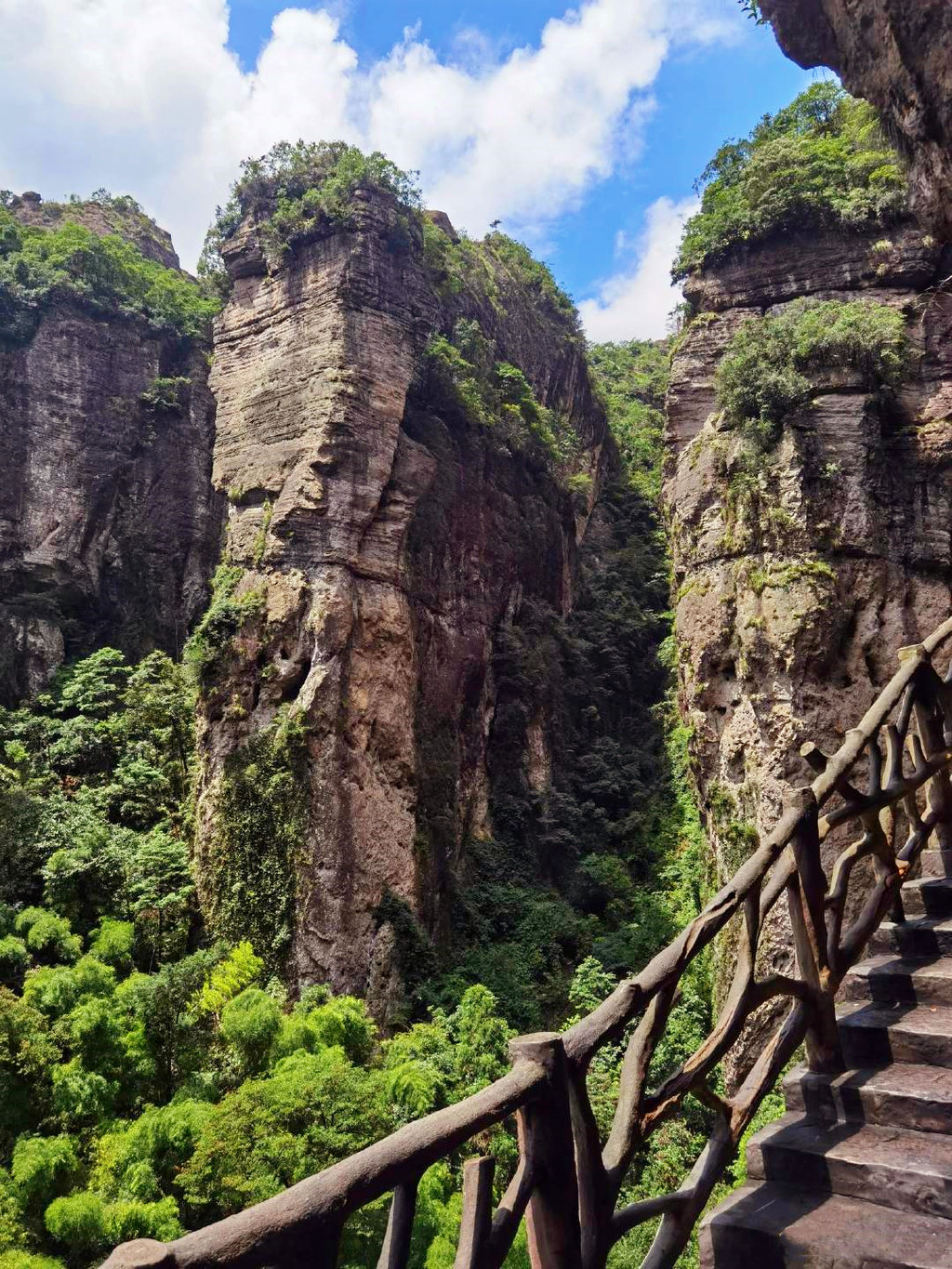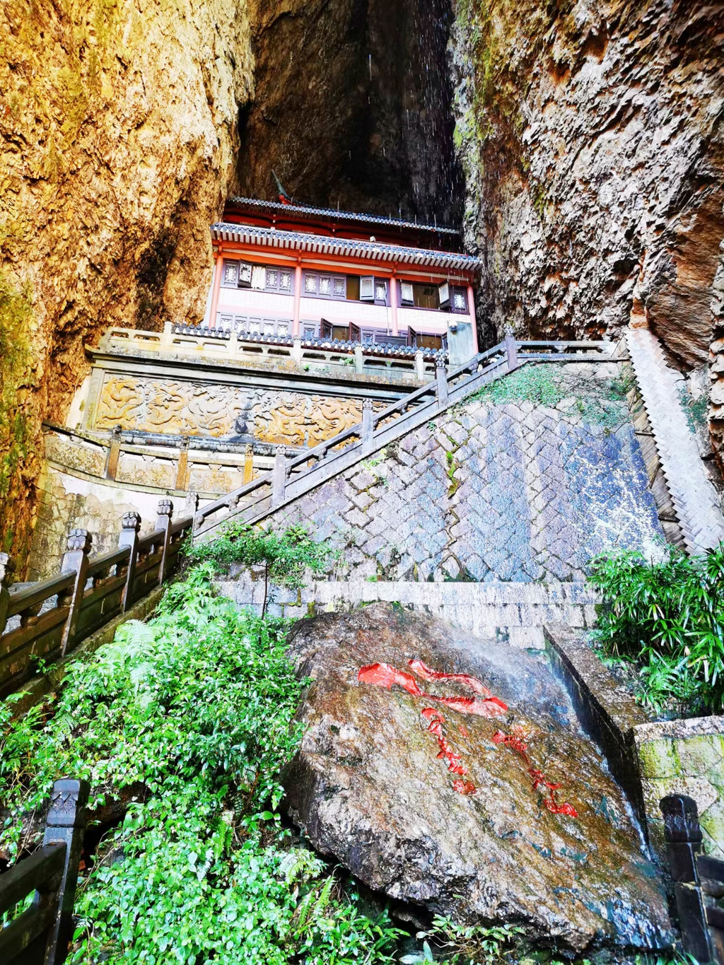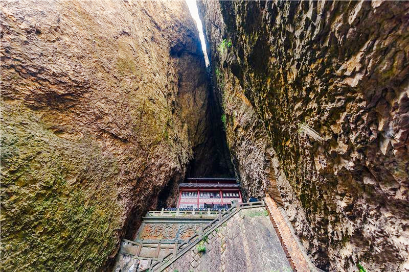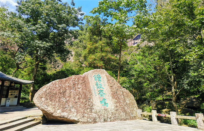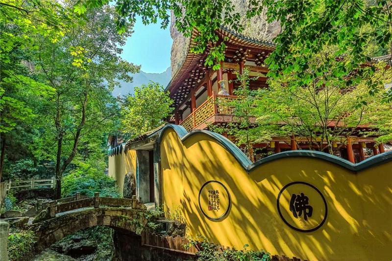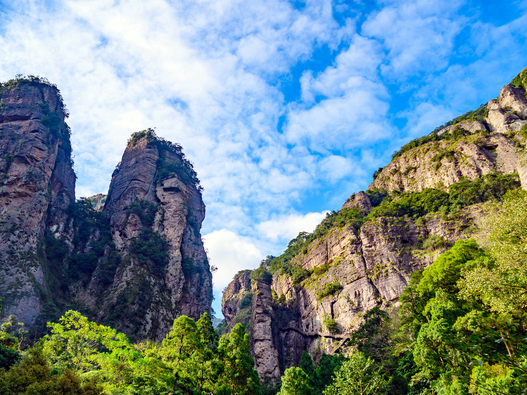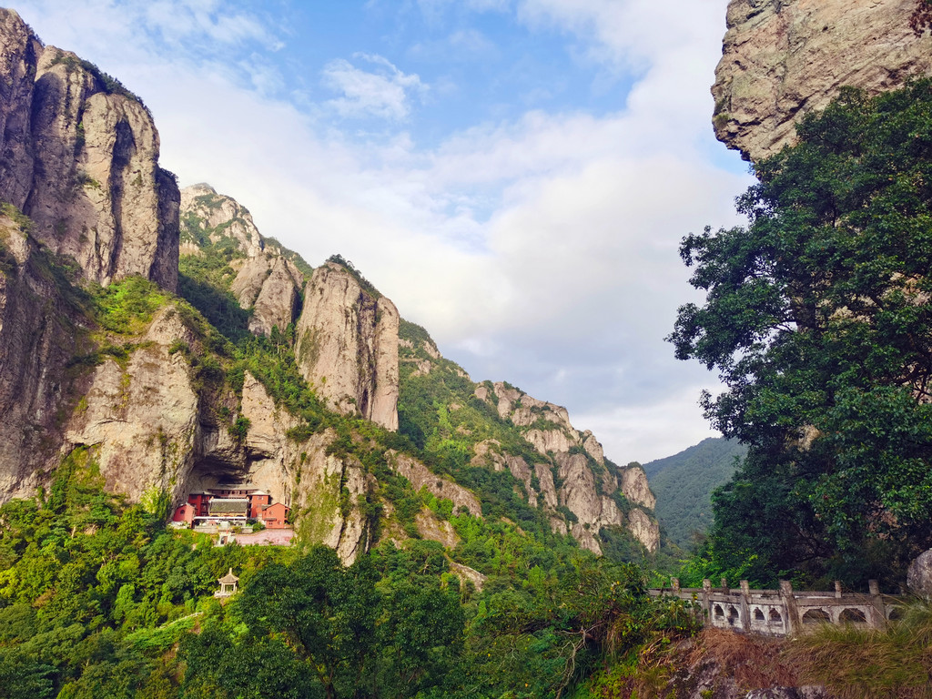 灵岩(门票50元/人)是“雁荡三绝”中面积最小的景区,但奇峰怪岩、飞瀑幽潭、古寺名刹、摩崖碑刻等奇绝景致应有尽有,这里无峰不卓立,无瀑不狂飞,有从天飞降的小龙湫,有小龙女纵身跳岩的断肠崖,当然最值得一看的还属非物质文化遗产灵岩飞渡表演。灵岩入口处有几处摩崖石刻,年代久远,皆为名人所书,明代旅行家徐霞客的雕像也屹立在绿树掩映处,听闻他曾三次造访雁荡山并赞口不绝。屏霞嶂下坐落着千年古刹灵岩寺,此寺始建于北宋,在雁荡山的寺庙群中地位最高,位居雁荡十八刹之首,号称“东南首刹”,杏黄色的院墙,青灰色的殿脊,四周群峰环列,古木参天,沐浴在蓝天白云下,环境幽绝,香火缭绕间更见肃穆。
