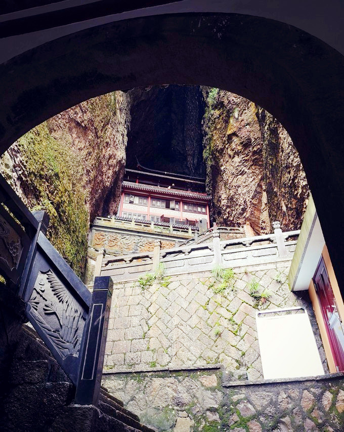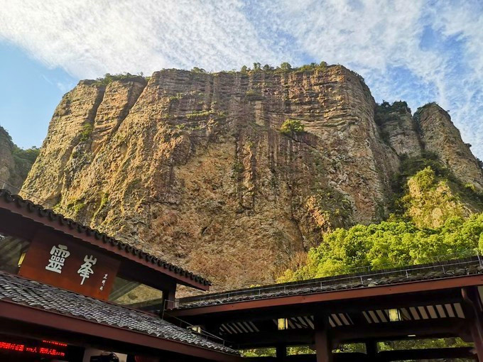 合掌峰是雁荡山的代表景观之一,高约百丈,在周围群峰的环拱下,犹如巨掌,直插云天,峰内有多处引人注目的名人摩崖石刻,还有深藏玄机、香火缭绕的“雁荡山第一洞天”观音洞,观音洞与北斗洞并称为灵峰两大奇洞,左侧还有清静素雅的白云庵。观音洞始建于1106年,是由火山喷发等地质作用形成的天然洞穴,洞高113米,深76米,宽14米,需要拾级而上403级石阶,方可到达最高层的大殿,是雁荡山第一大洞,古人运用他们的智慧依洞就势,不改变它的洞形,在洞中依岩兴建九叠楼阁,与天然的洞穴之美融为一体,为雁荡山第一洞天,堪称人工与自然美学巧妙结合的典范,站在观音洞顶向洞外望去,可见奇景林立,光影的角度让这里的层峦叠嶂和奇峰环拱幻化出不同的美景,随手一拍皆是撼人的自然壮丽。