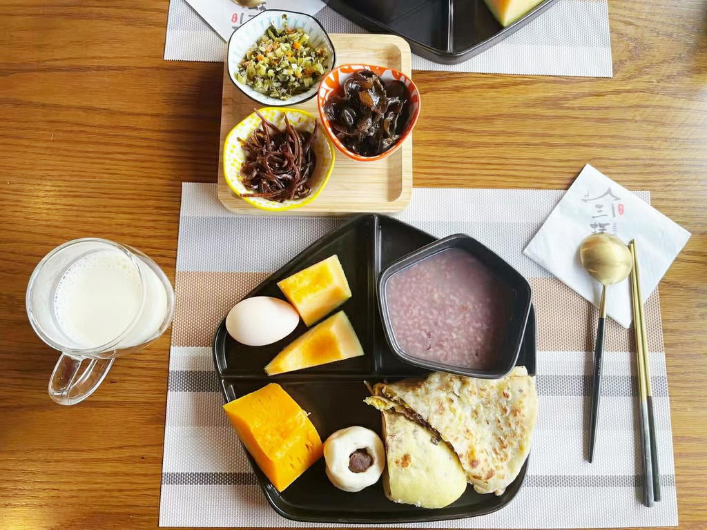 柒竹的服务非常贴心,入门的精致花茶,晚上的贴心甜品,房间的便携泡脚桶(用完还可以装袋带回家),早餐品种也非常丰富,特别是那碗销魂的葱油拌面,让人欲罢不能,阿姨还主动帮我们把昨天打包的香肠和馄饨又重新加热,我们懒散地慢慢享用着,却引来了一群流浪猫眼巴巴盯着我们,等待投喂。