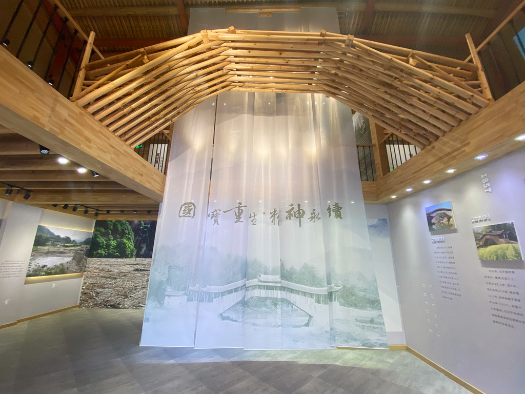 文兴桥横跨玉溪之上,建于清咸丰七年(1857年),叠梁式木拱廊桥,传说文兴桥的建造者是一对师徒,开工前,师徒商议不用一钉一铁,从桥左右同时开工,在溪流中心点实现对接,建造过程中,师父按部就班建造,而徒弟为了使自己负责的一侧更加牢固,偷偷加用了铁钉,因此增加了桥身的重量,使桥身向没有使用铁钉的一侧倾斜,等到建成完毕,桥体形状已经无法改变,因此文兴桥也成为泰顺廊桥中造型最为怪异的一座,看起来如同长着畸形的脊背,但这并不影响文兴桥的美观,反而产生了类似比萨斜塔一样倾斜的美感,堪称“廊桥中的比萨斜塔”。然而2016年9月15日,台风“莫兰蒂”所带来的洪水连续冲垮了文兴桥、薛宅桥、文重桥三座国保廊桥,所幸泰顺广大群众第一时间打捞起廊桥原构件,历经一年时间,遵循文物修旧如旧的原则,让三座国保廊桥重新屹立在溪水两畔。为真实记录廊桥修复保护与非遗传承的非凡历程,在文兴桥畔建设了两层楼的廊桥记忆馆,展现了三座国宝廊桥从出世、劫难、抢救、修复、重生的整个涅槃过程,我们参观期间恰逢政府领导也率众前来实地考察,可见当地政府对廊桥的重视程度。