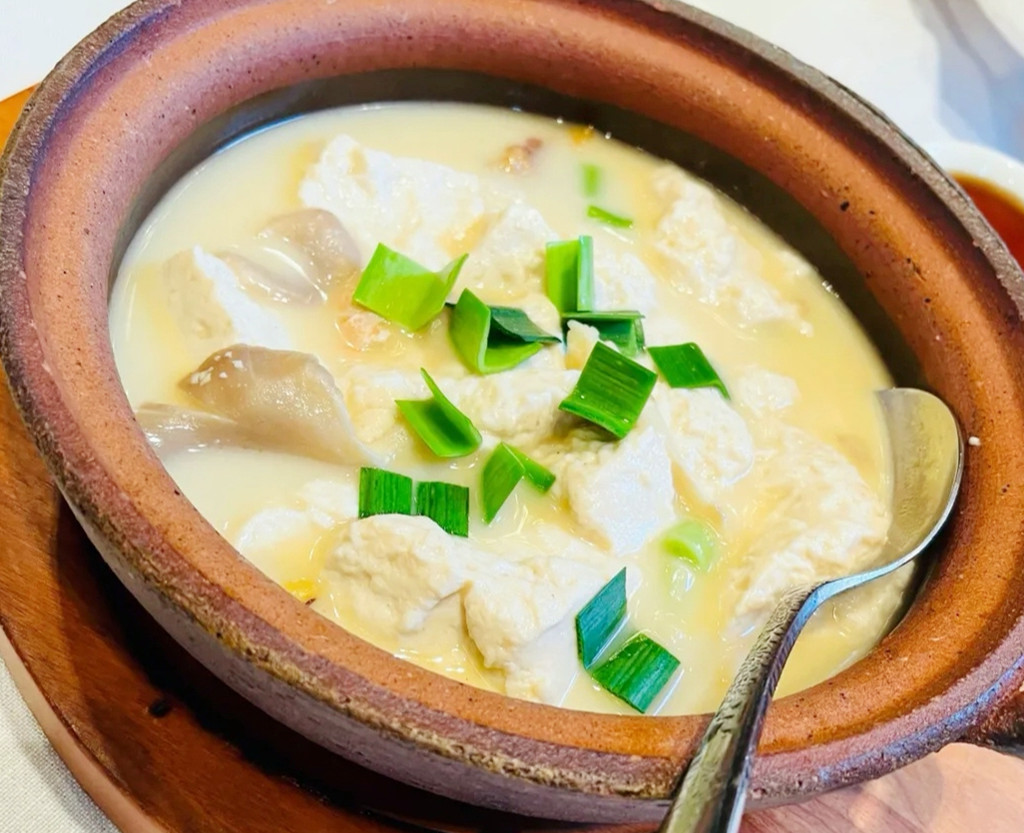 走进大厅,和新荣记类似的装修,有了那么一丝丝熟悉的味道,全明档的点餐形式,必吃特色之一的白水洋豆腐,看似平平无奇,实则无比鲜美,淡淡的柴火味,久煮不烂,满口鲜嫩,咸肉和鲜虾吊出鲜汤,吸了汤汁的豆腐,鲜到眉毛为它扬起。
