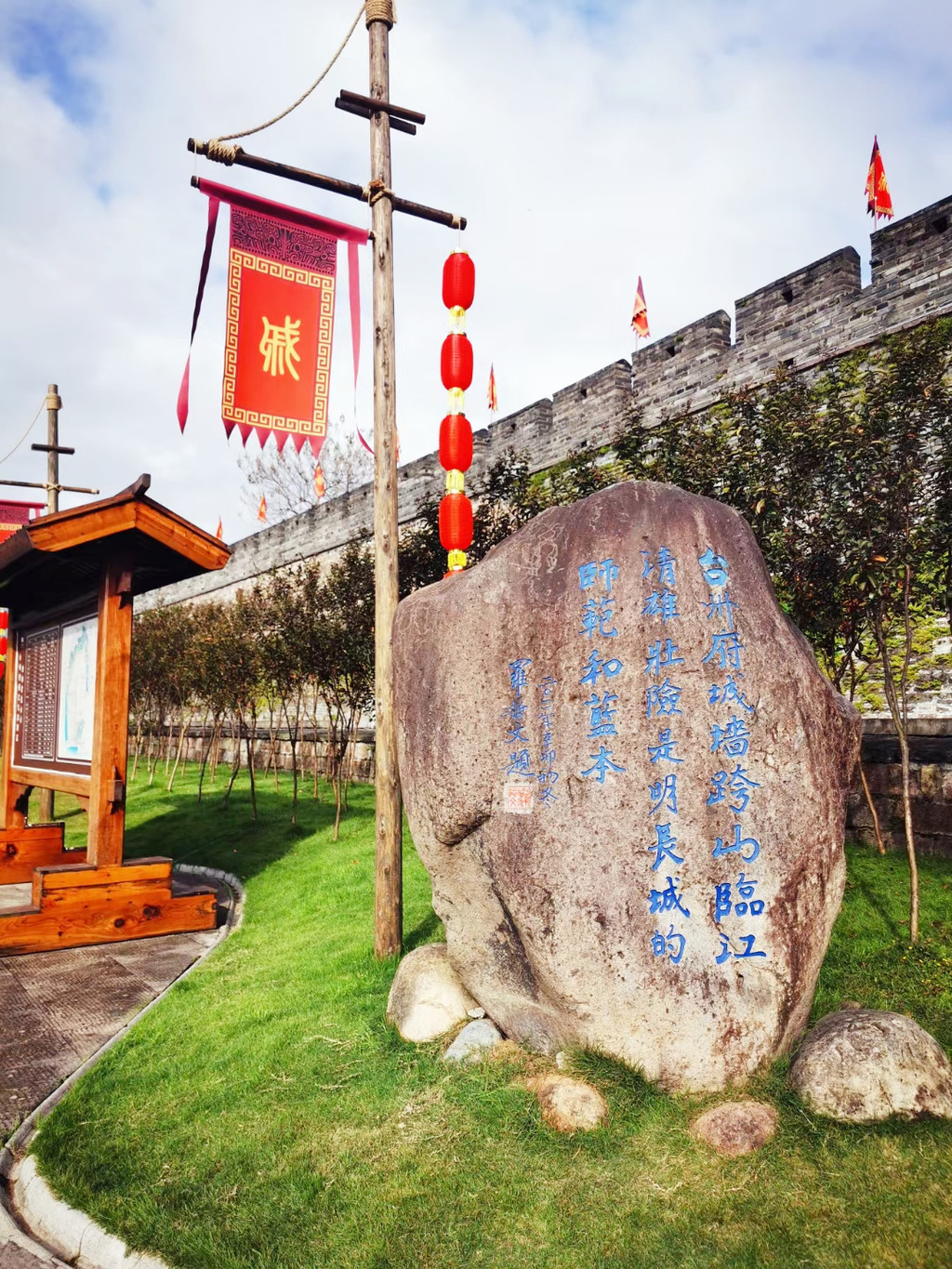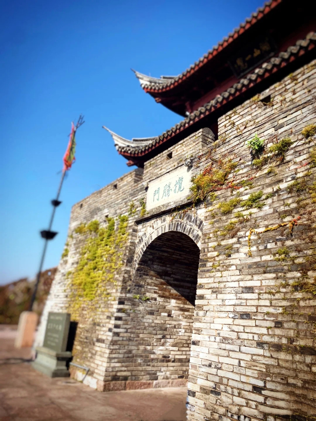 揽胜门,是长城的主出入口,最高的一座城门,所谓站得高看得远,站在揽胜门上的顾景楼远眺,美丽的东湖尽收眼底,广场前石牌坊上刻着“雄镇东南”四个大字,198级台阶依陡峭山势从广场直抵揽胜门,从下仰望气势恢宏,令恐高者畏惧,人称“好汉坡”,不过往右边还有条缓坡可供行走。城门内戚继光的铜像巍然屹立,回顾历史,明嘉靖三十六年,戚继光驻守台州府抗倭,为进一步提升临海城墙的军事防御能力,创建了空心敌台,后来又将空心敌台带到北方应用于北方长城,故台州府城墙又被称为北方明长城的“示范蓝本”。