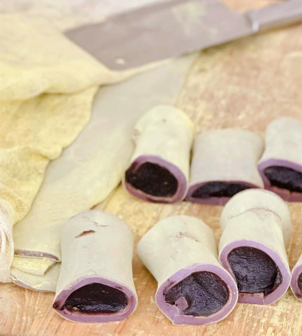 陈记乌饭麻糍就在麦虾隔壁,摘鲜乌饭叶捣成汁,加入糯米浸泡,蒸熟捶打而成,麻糍捣成形后需要撒上一层松花粉,这样才不会粘手,擀的薄薄地铺上一层豆沙卷起来,甘甜冰爽的口感,粘稠有嚼劲。