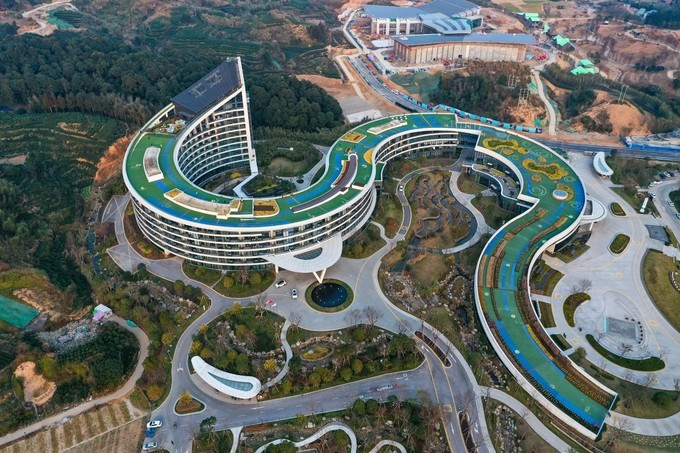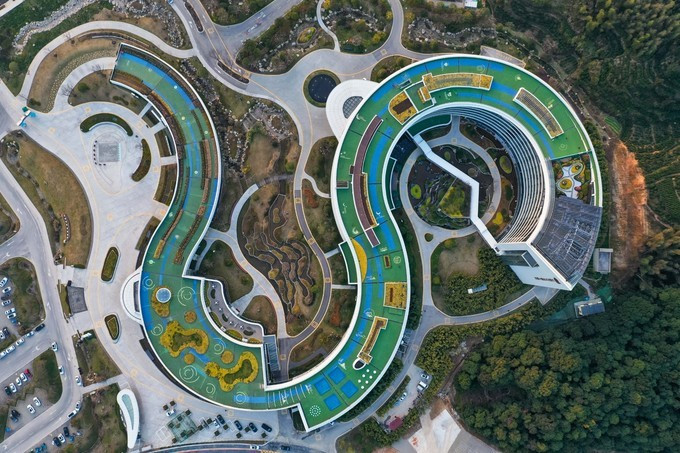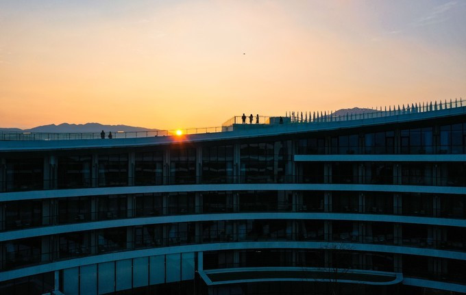 酒店设计灵感源于蛟龙出海,楼高9层,由低至高,环形分布343间特色客房。其中38间儿童房以森林、沙滩、星空等为主题,搭配趣味滑梯、露营帐篷、独立浴池,布局巧妙,筑梦童心。