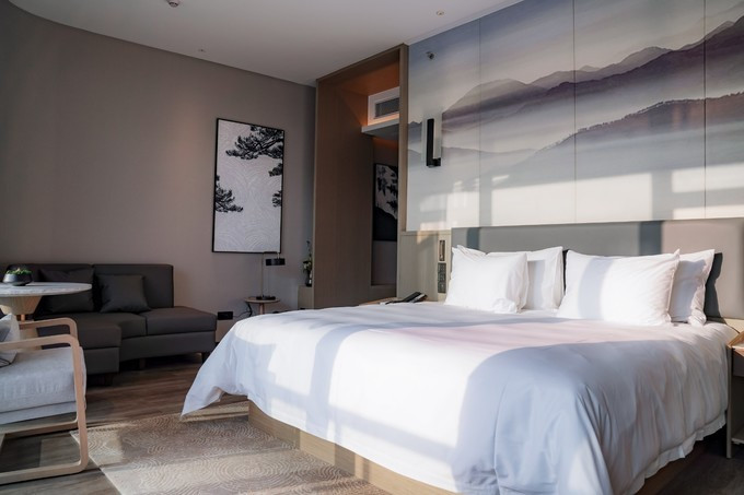 酒店房间干净整洁,超大落地窗,阳光直接打在柔软的大床上。整个房间的色调以简洁为主,有种水墨画的风格,床品十分舒适,布局合理。