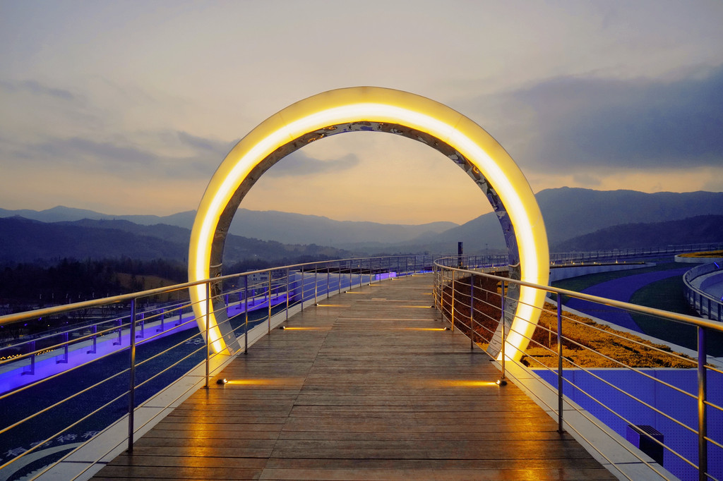 酒店设施齐全,房间内还设有独立温泉泡池,随时都可以泡温泉放松身心。酒店顶部设有550米星光大道,视野绝佳,一到夜晚,璀璨的灯光装置齐齐点亮,画面唯美浪漫。