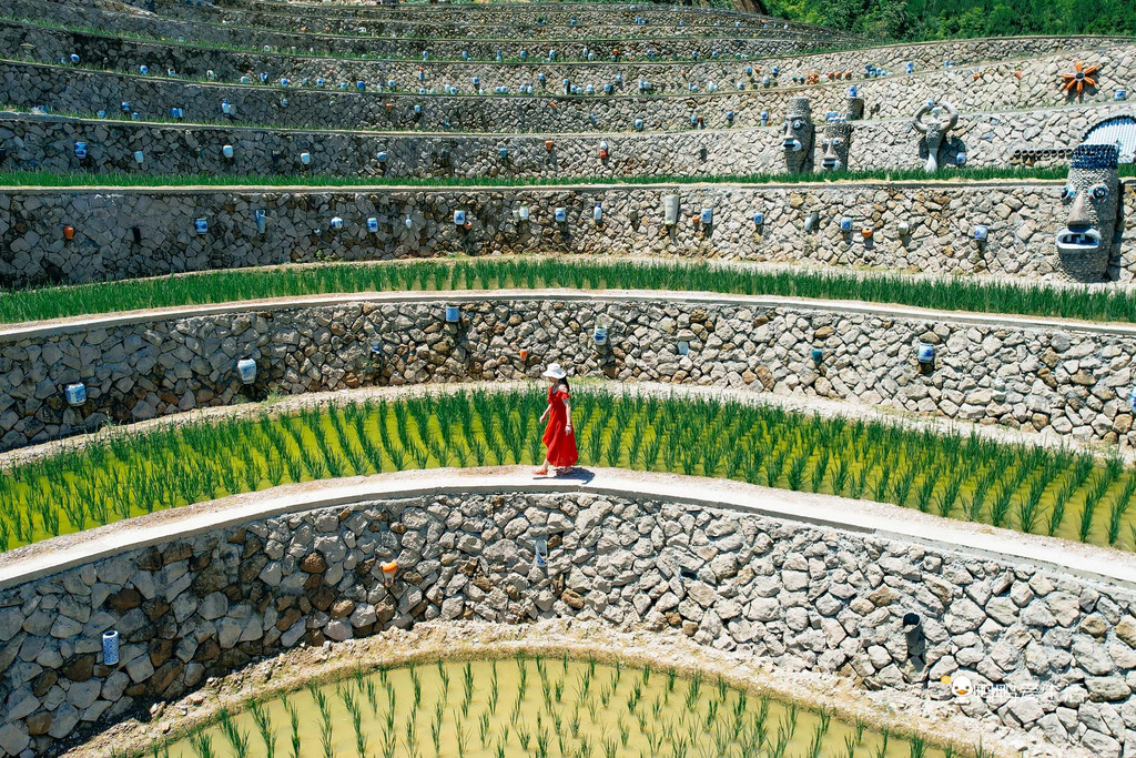 温州上柘头村上古田园,是一个以山海经为主题的美丽田园。水稻种植于2万+负氧离子的高山上,我愿称之为中国最美梯田,穿插在梯田田埂里的各种陶瓷、瓦罐等碎片,不经意间组成了绝美画面!特别适合拍照打卡,下个月开始正式开园,还有众多亲子体验!