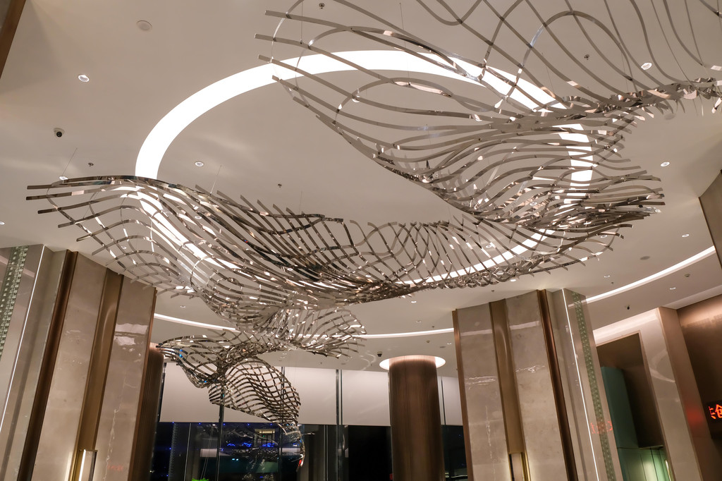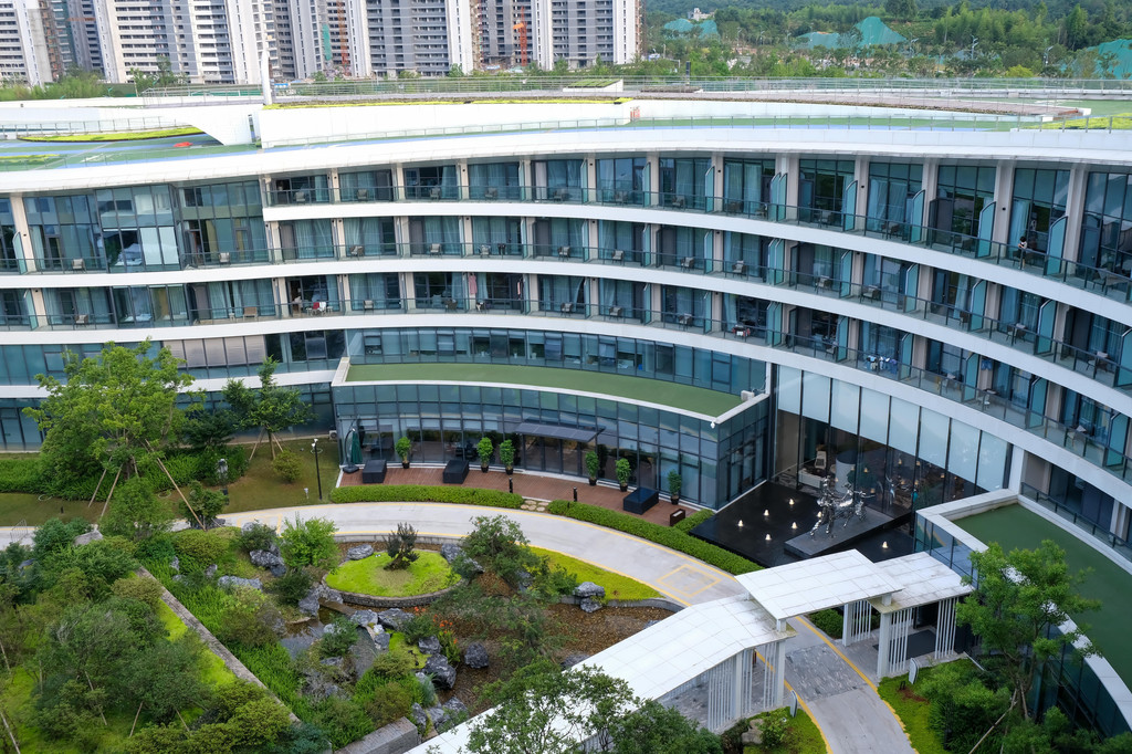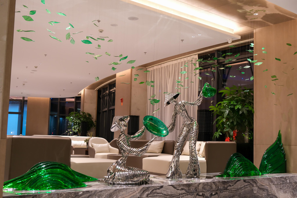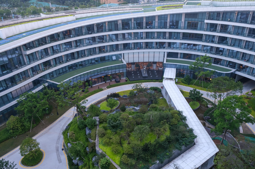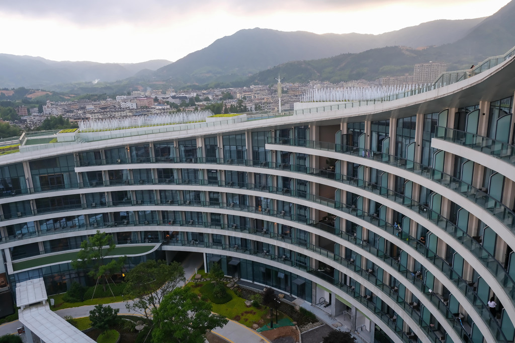 酒店设计灵感源于蛟龙出海,楼高9层,由低至高,环形分布343间特色客房。