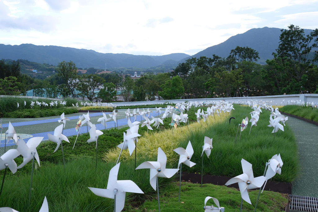 整体建筑造型像一条腾飞的巨龙,因此得名蛟龙出海。在屋面打造中国首个全屋顶星光大道,是我国第一个直接能从地面走上屋顶的500米长网红坡屋顶圣地。