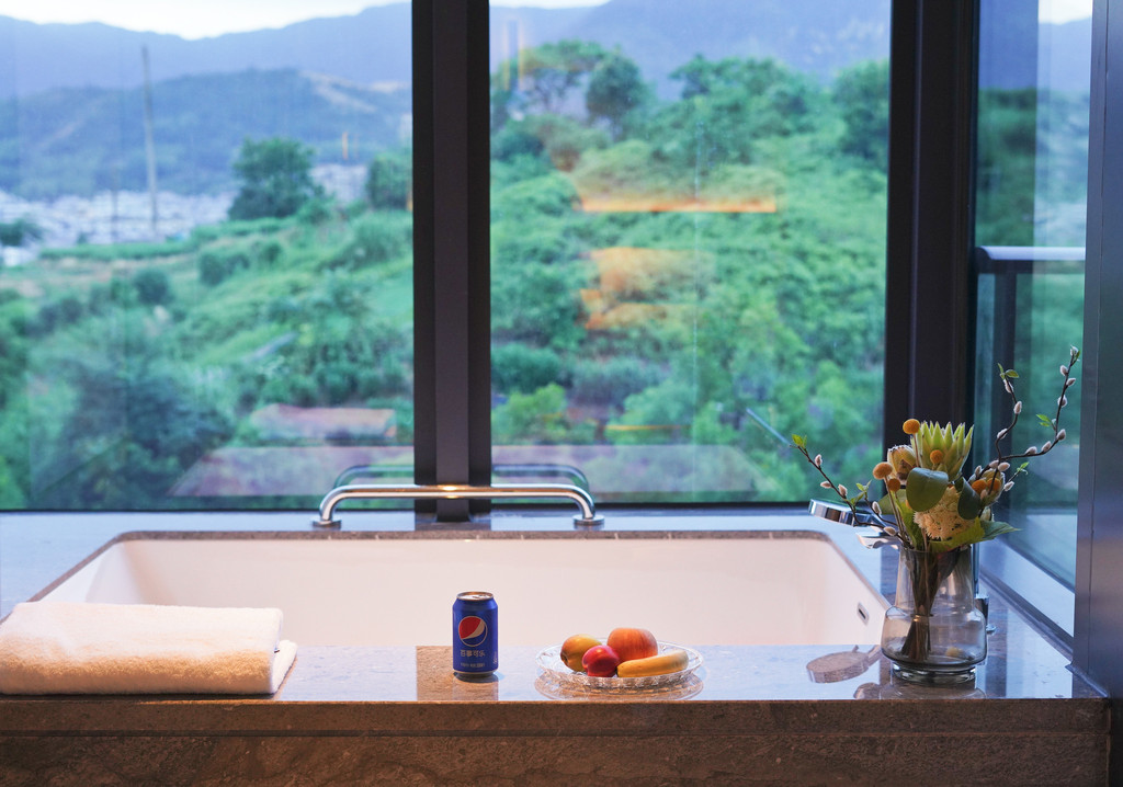 走进酒店的客房,一股凉风袭来,22 ℃的空调房清凉无比。松软的大床,躺下就不想起来。一侧是沙发办公区域,茶几上有酒店送来的欢迎水果。吹着凉风,看着幽幽青山间云卷云舒,吃着新鲜的水果,品味着惬意的咖啡,慢渡悠悠时光。在外面玩疲惫了,就躺进阳台上的汤池,泡个暖日氡泉。亲肤丝滑的水质,使人倍感舒适,康养的圣水对身体也有诸多好处。